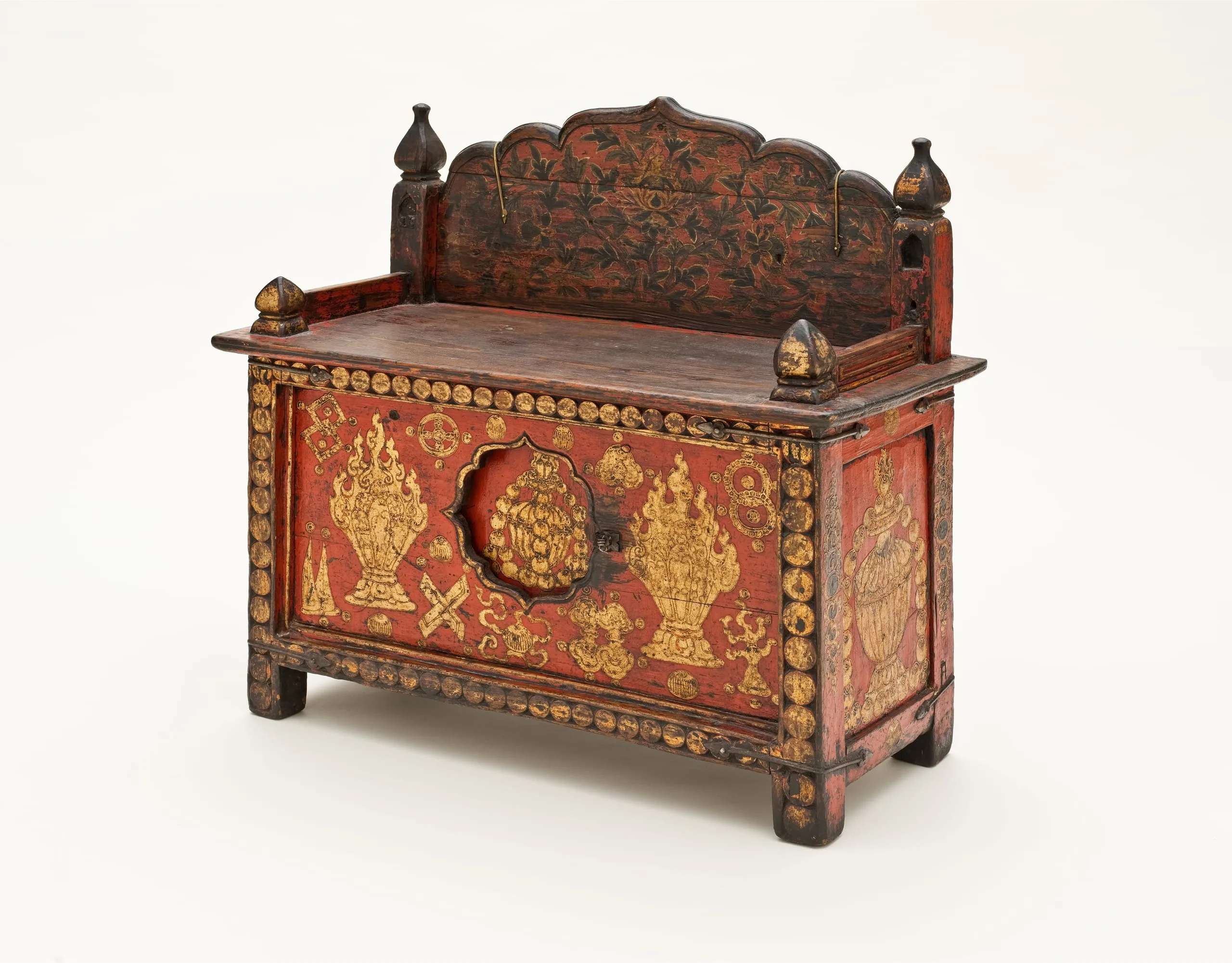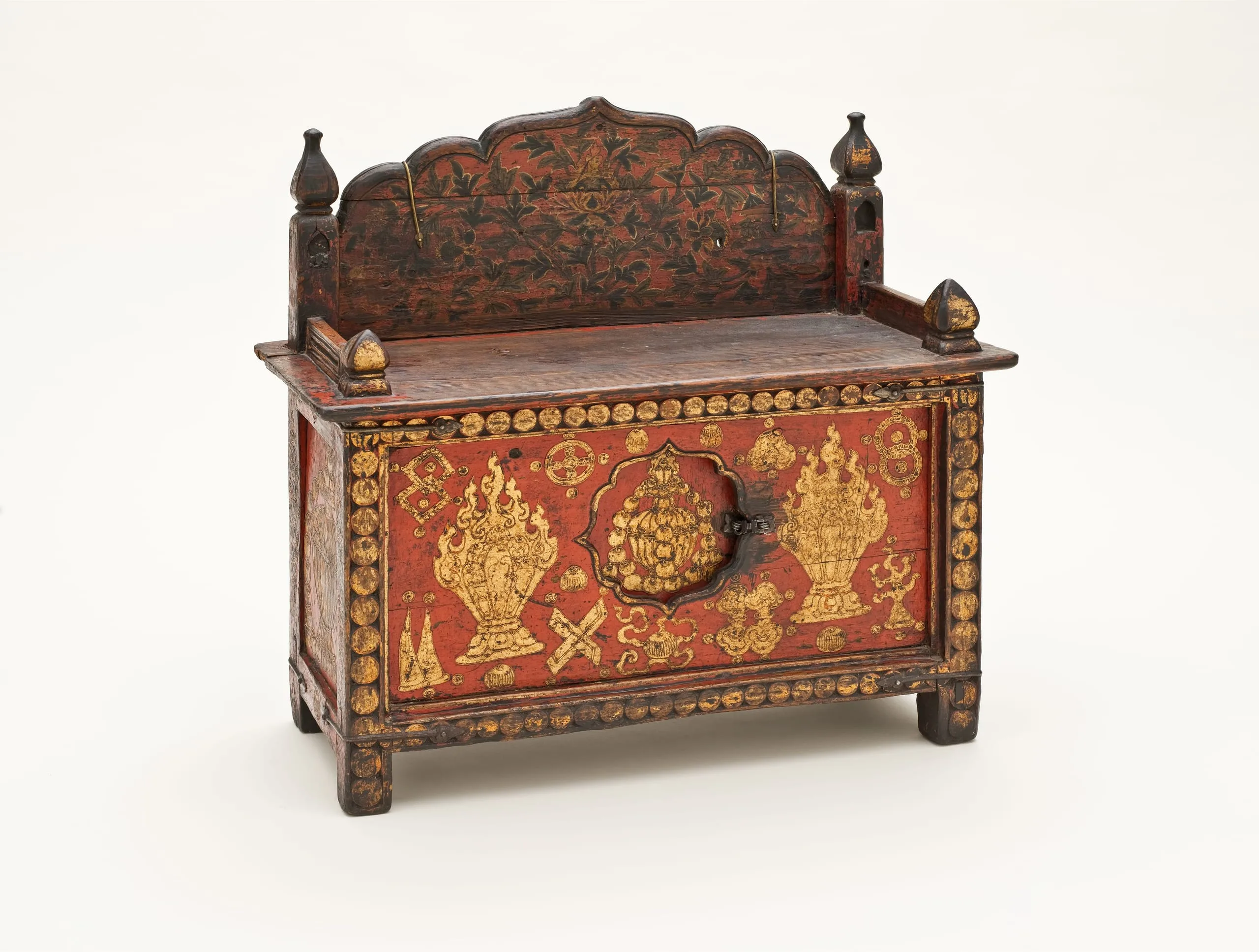 Tibetan furniture served a wide range of functions in domestic, monastic, and temple settings. This is an elegant example of a type of chest used for storing books and implements (pegam), which is derived from the Tibetan words for "book" (pecha) and "box" (gam). The top section consists of a scalloped back panel embellished with a flowering plant and precious jewel, now-missing molded side panels, and book stops in the form of gilded lotus bud finials. It functioned as a reading stand for the sacred scriptures read during rituals that were made in the horizontal format of Tibetan religious books with unbound wooden covers (see M.71.1.48, M.78.101.1, and M.86.345.12). See David Kamansky, ed., Wooden Wonders: Tibetan Furniture in Secular and Religious Life (Pasadena: Pacific Asia Museum and Chicago: Serindia Publications, 2004), p. 285, no. 106.