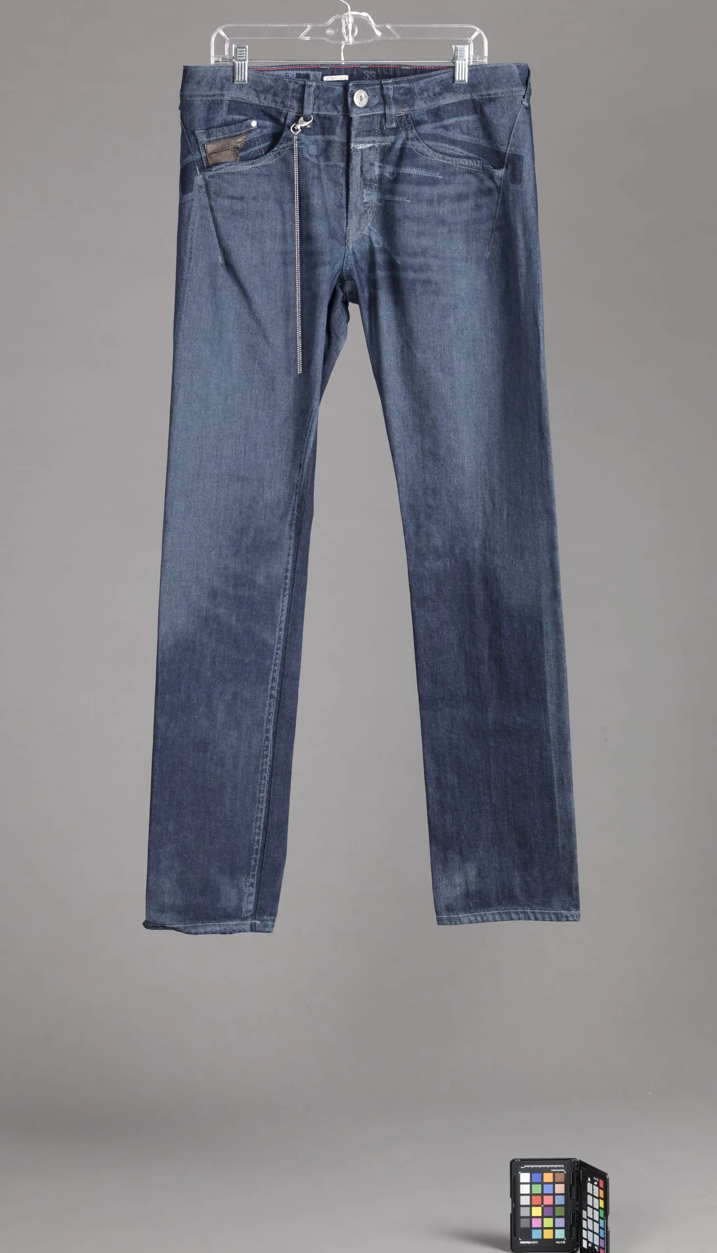 - Cotton twill (denim), laser-faded finish (Watt Wash), metal