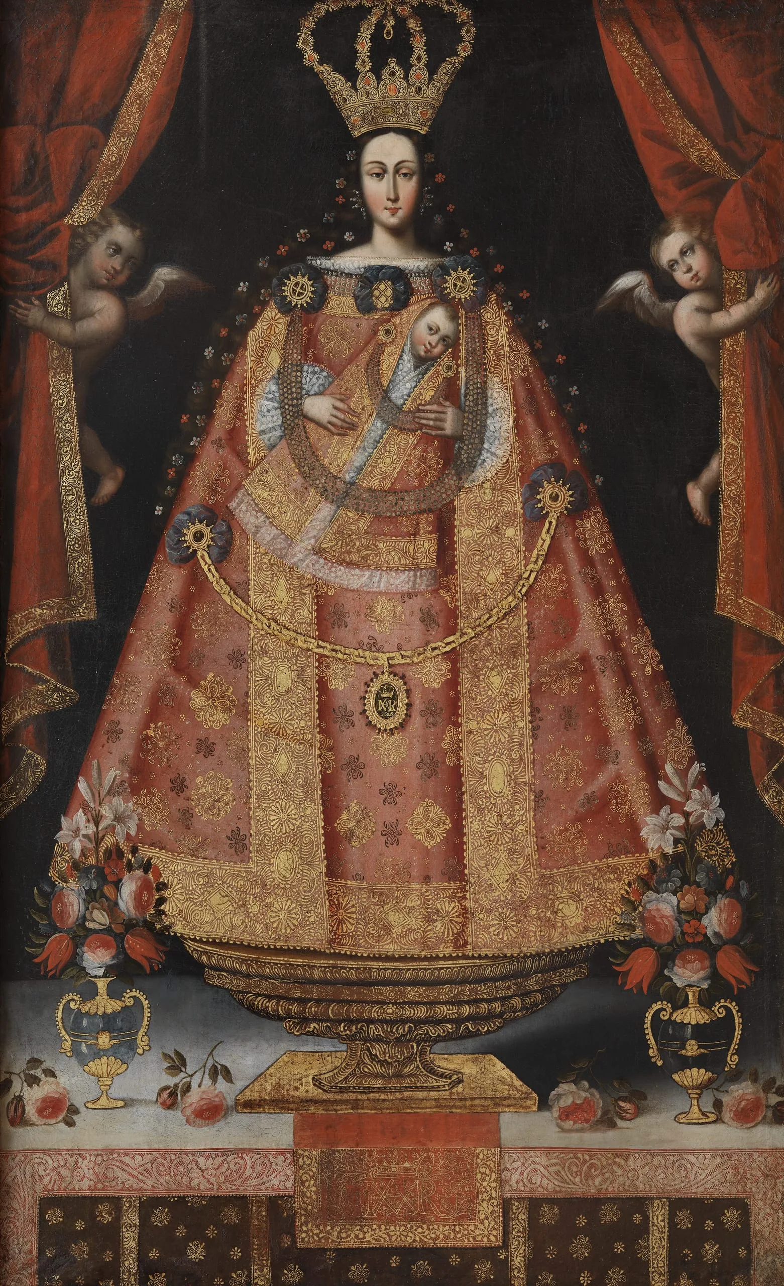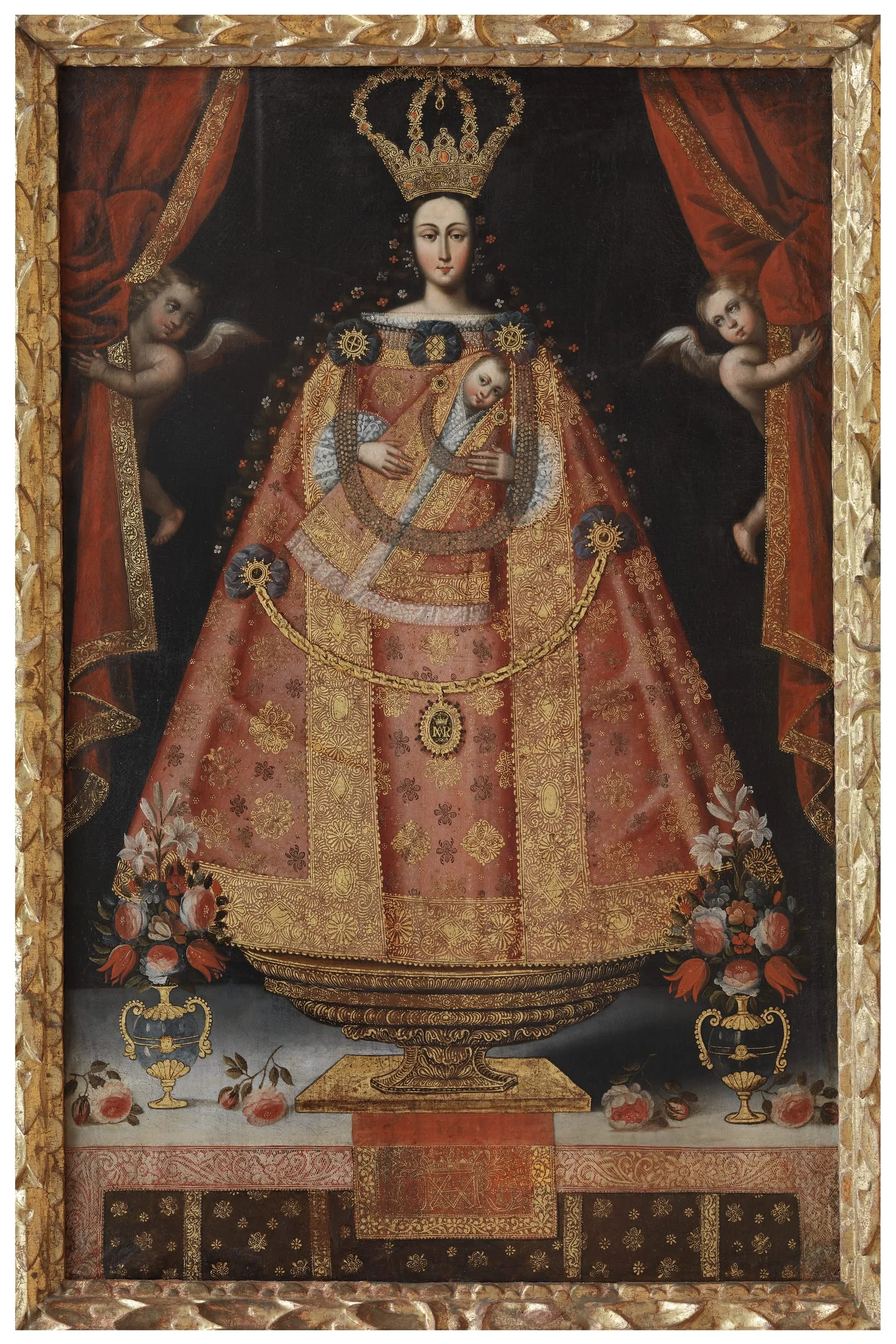 In this painting the richly dressed and bejeweled Virgin is portrayed atop her altar in the rigid frontal pose characteristic of statue paintings. A bundled up Christ child is equally lavishly dressed. Two charming putti are shown pulling the curtains open to display the holy image. The profusion of brocateado, a technique of applying gold leaf ornamentation to the surface of the canvas, provides a unique shimmer and texture to the painting. This technique was widely used throughout the Hispanic world but it is most closely associated with Cuzco, especially after Native artists withdrew from the Spanish-dominated guild in 1688 and developed their own pictorial style, known as the Cuzco School.