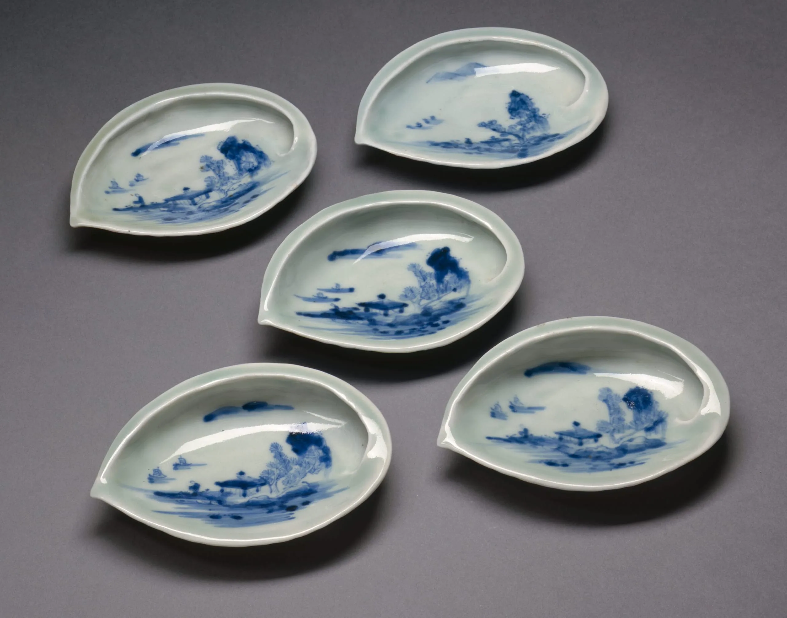 - Hirado Mikawachi ware; porcelain with celadon glaze, blue underglaze; set of five