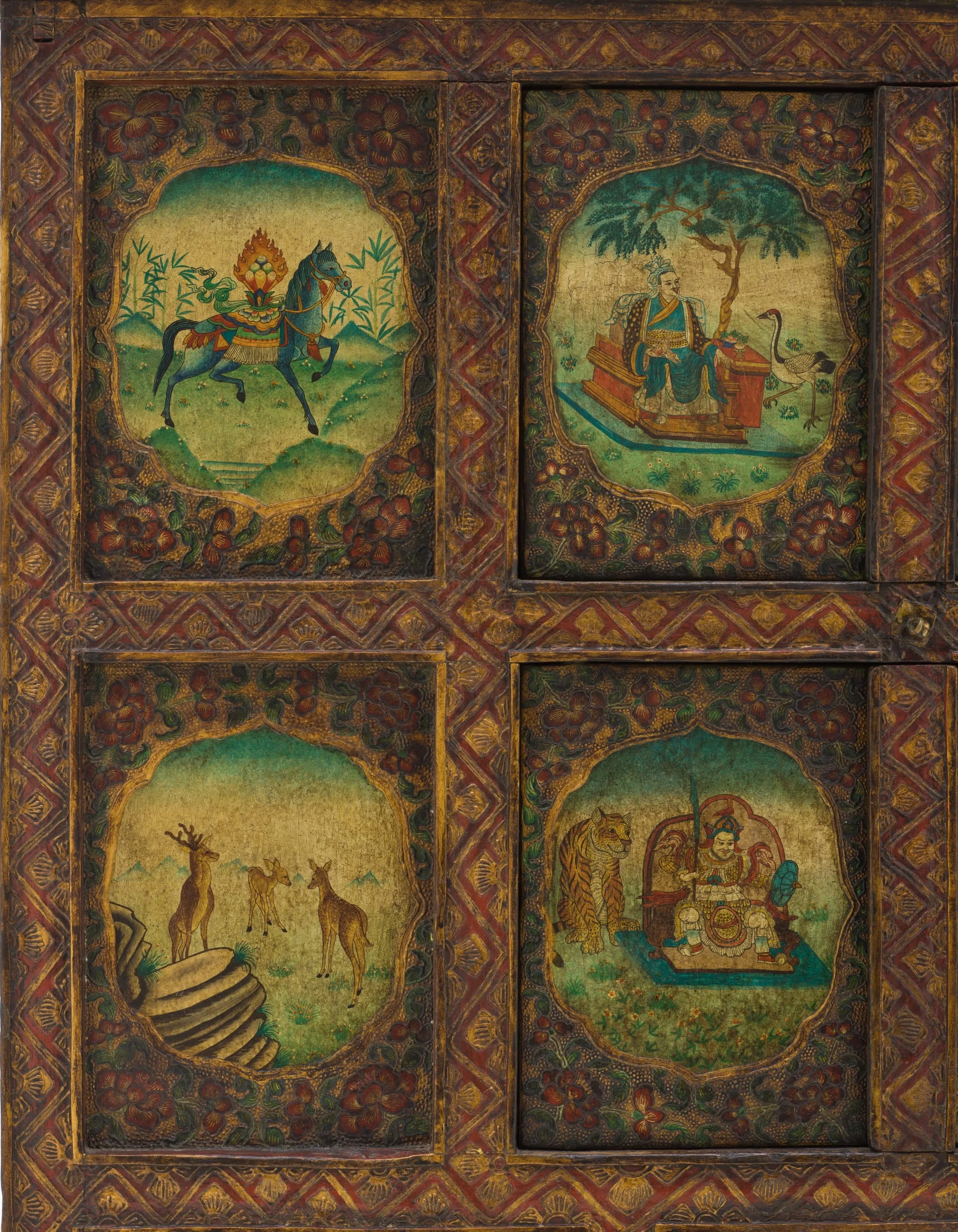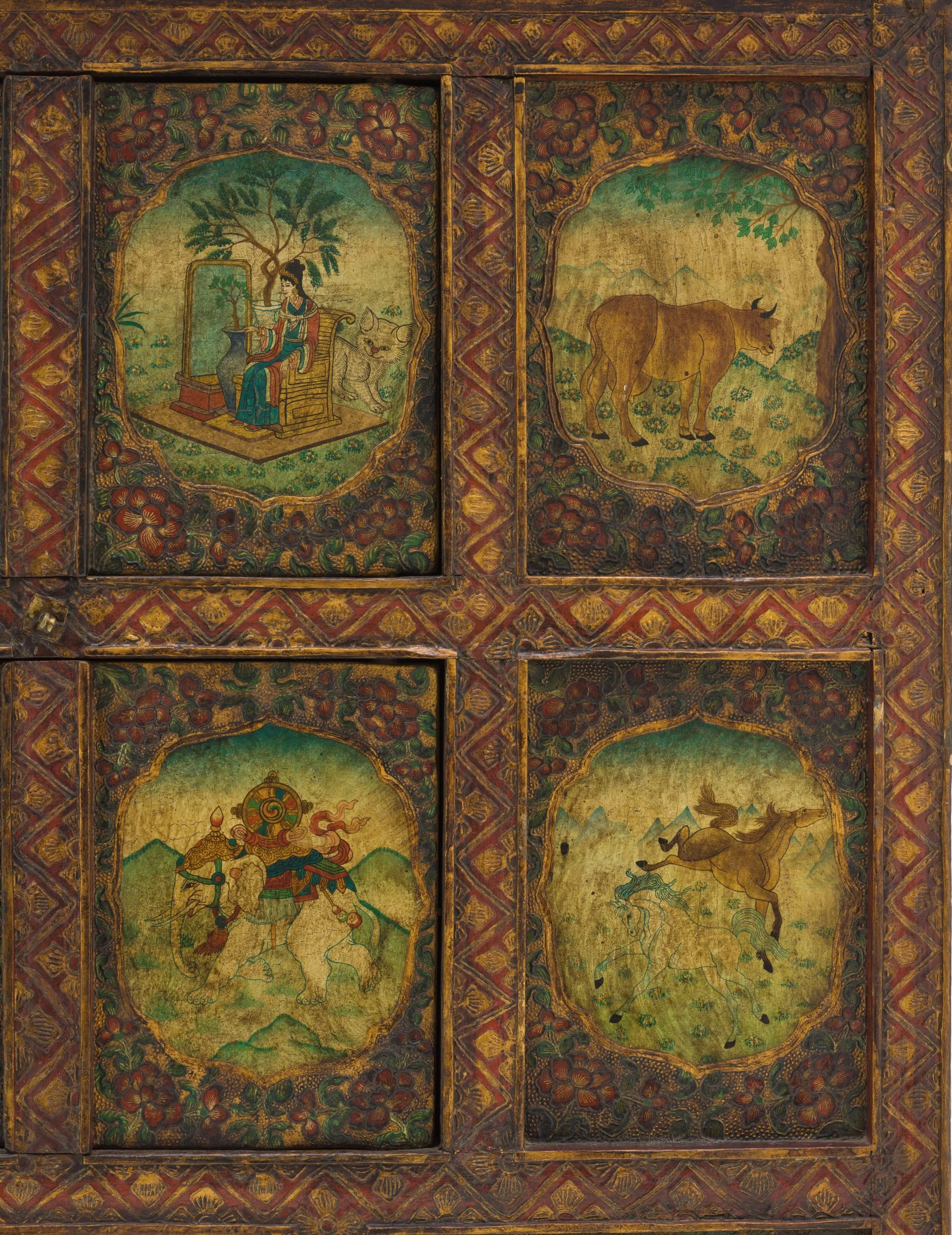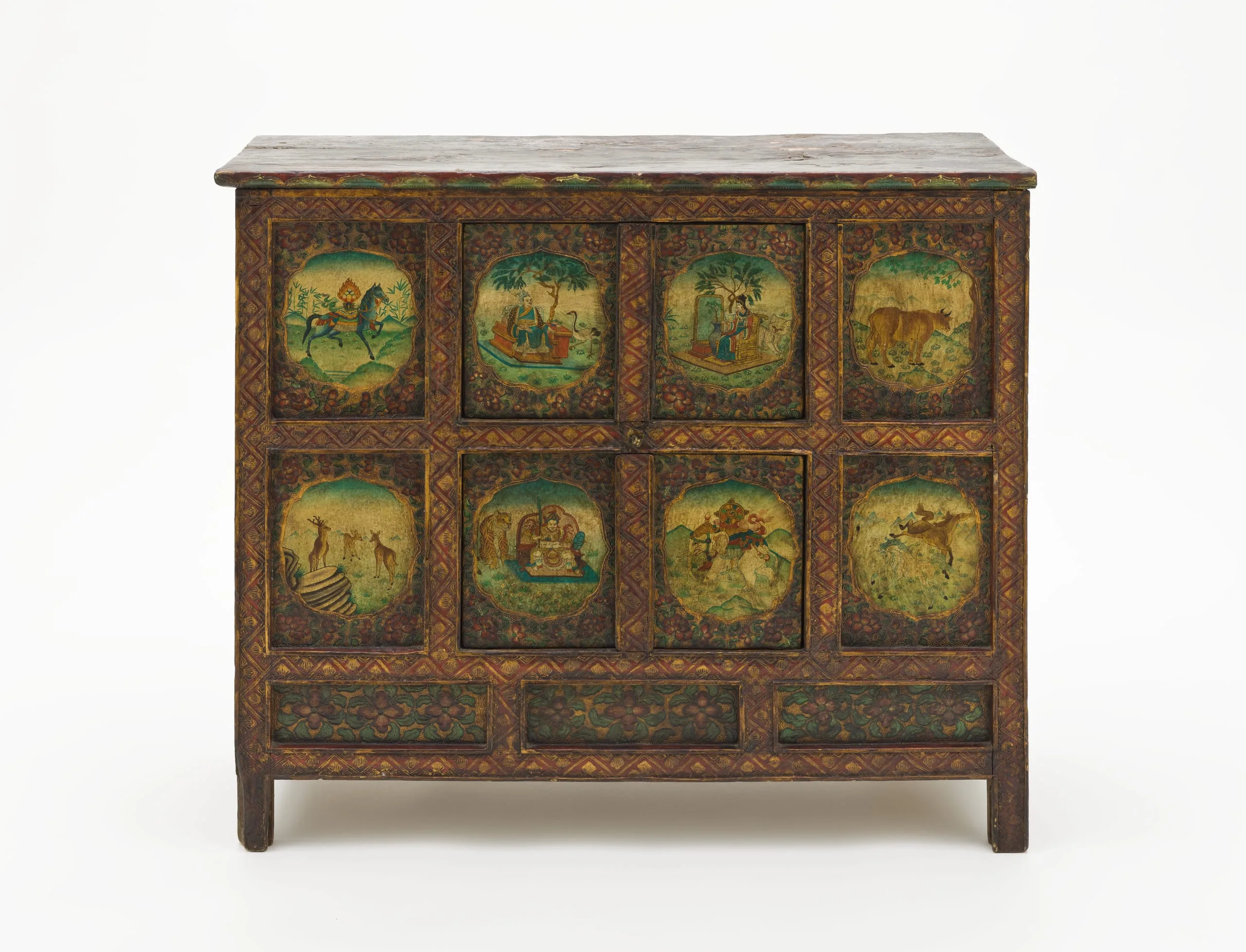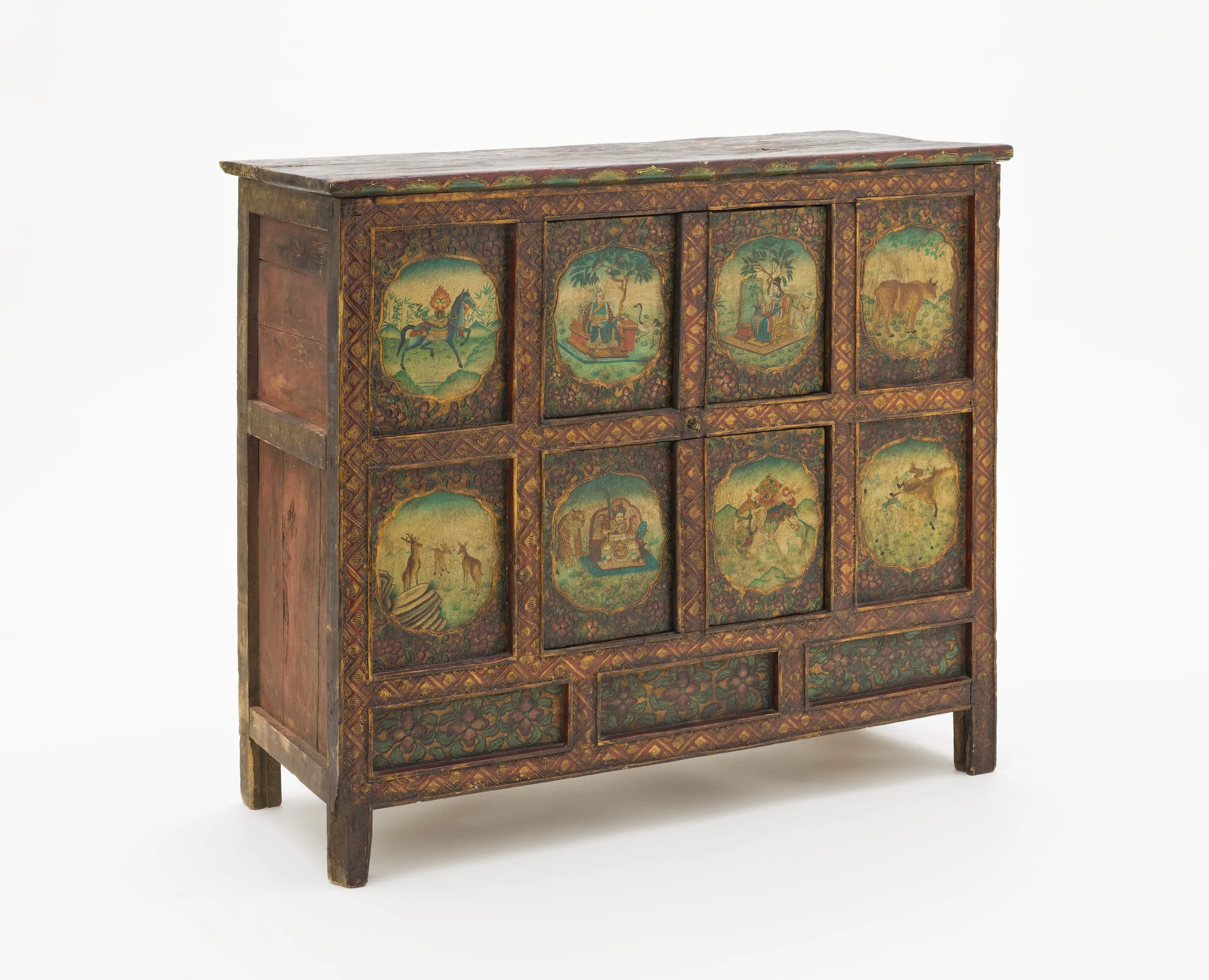 This cabinet is decorated with a Chinese-style aesthetic. It has two horizontal rows of figural scenes brilliantly painted in lobed cartouches surrounded by foliage on inset rectangular panels. The top row of panels from left to right has a horse with a flaming wish-fulfilling gem on its back; a seated Chinese monarch with a swan, probably Qin Shi Huang (259–210 BCE), the founder of the Qin Dynasty (221–206 BCE) and the first emperor of China; a seated Chinese queen in a garden with a kitten and potted tree, most likely the Empress Dowager Cixi (or Tzu Hsi), the powerful ruler of late Qing Dynasty (644–1912); and a female cow with a full udder, possibly the Spring Ox (Chun Niu) symbolic of agricultural fertility and diligence. The lower row of panels from left to right has a mountainscape with a family of three deer, generally believed to be symbolic of longevity, prosperity, and good fortune; Hu Ye, a Chinese guardian with a tiger symbol who protects temples, villages, and people (especially children) from evil; an elephant with a Buddhist Wheel of the Law (Dharmachakra) on its back; and mountainscape with a pair of wild horses symbolic of vitality and speed. One of the horses is white, emblematic of spiritual purity and a noble, free-spirited nature. Beneath the two figural rows is a row of three horizontal panels of lotuses with foliage. All three rows are bordered by a chevron pattern interspersed with half lotuses. The front edge of the topboard has large lotus petals in alternating blue-green and light green paint with gold outlines. The sides are unadorned. See also M.2010.78.18.