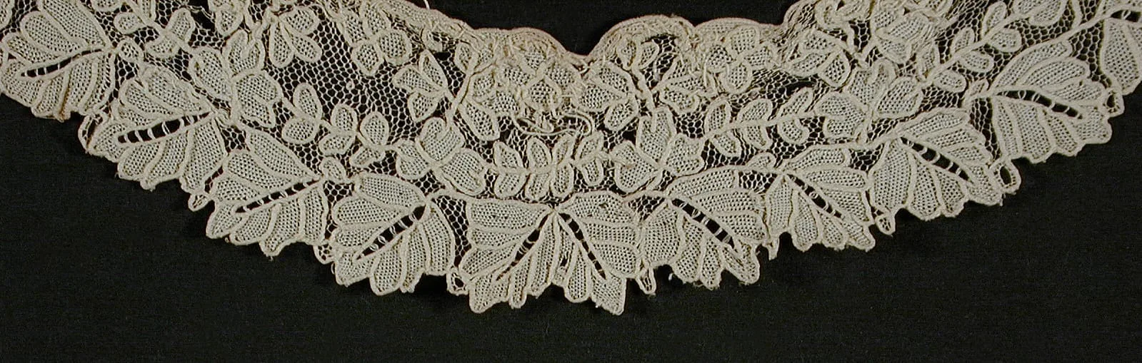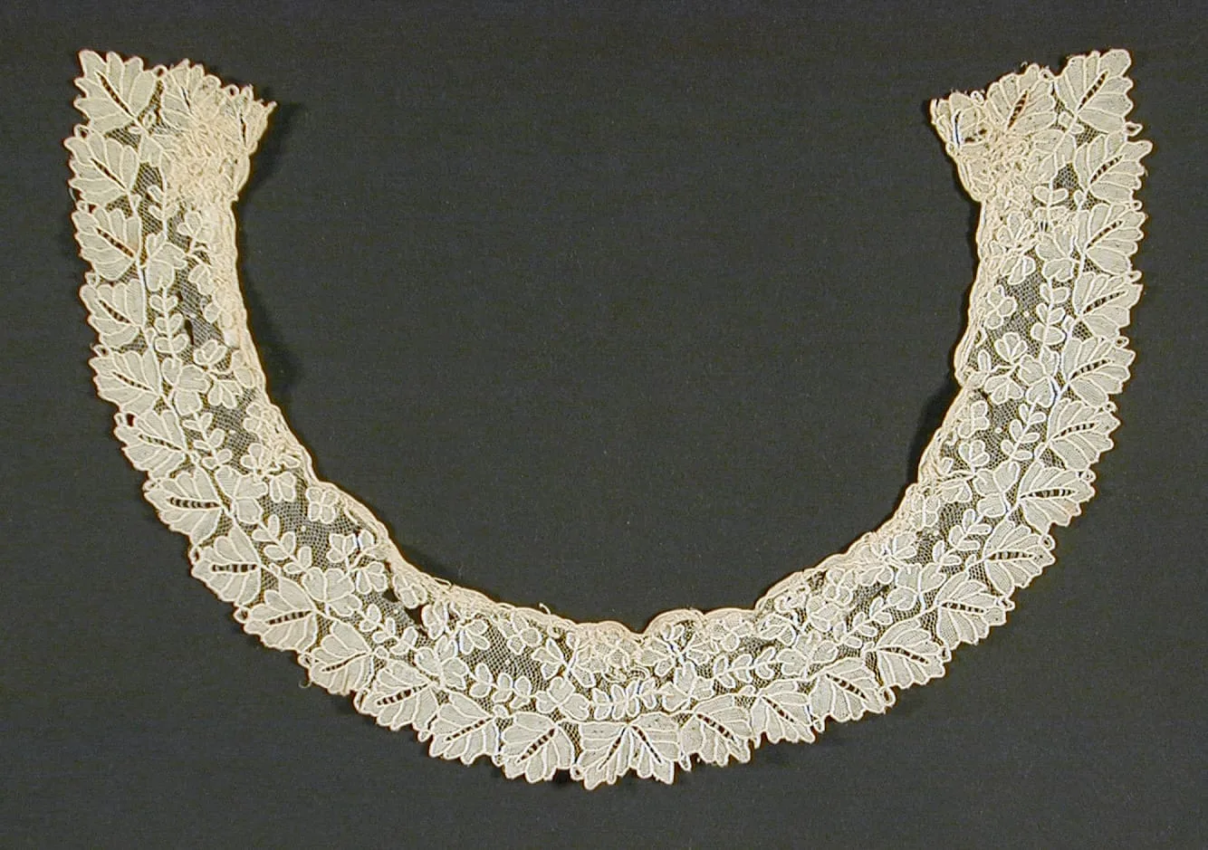 Cream-colored lace collar in a U-shaped curve, densely worked with repeating leaf and floral motifs on a fine mesh ground, scalloped outer edge