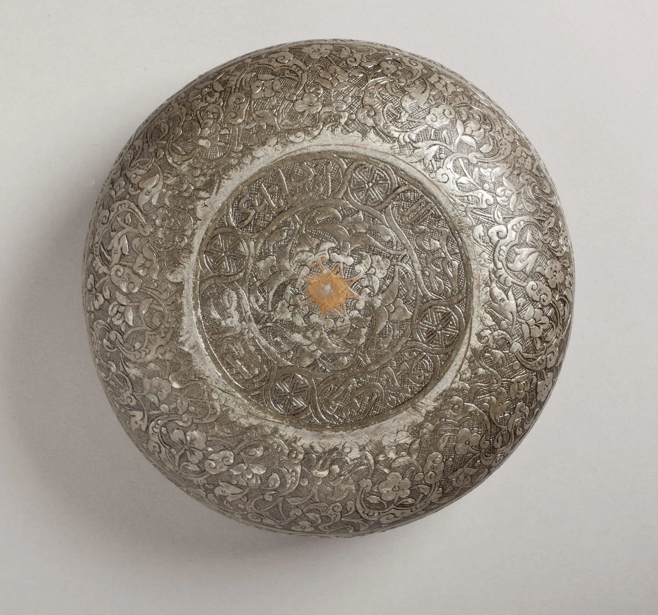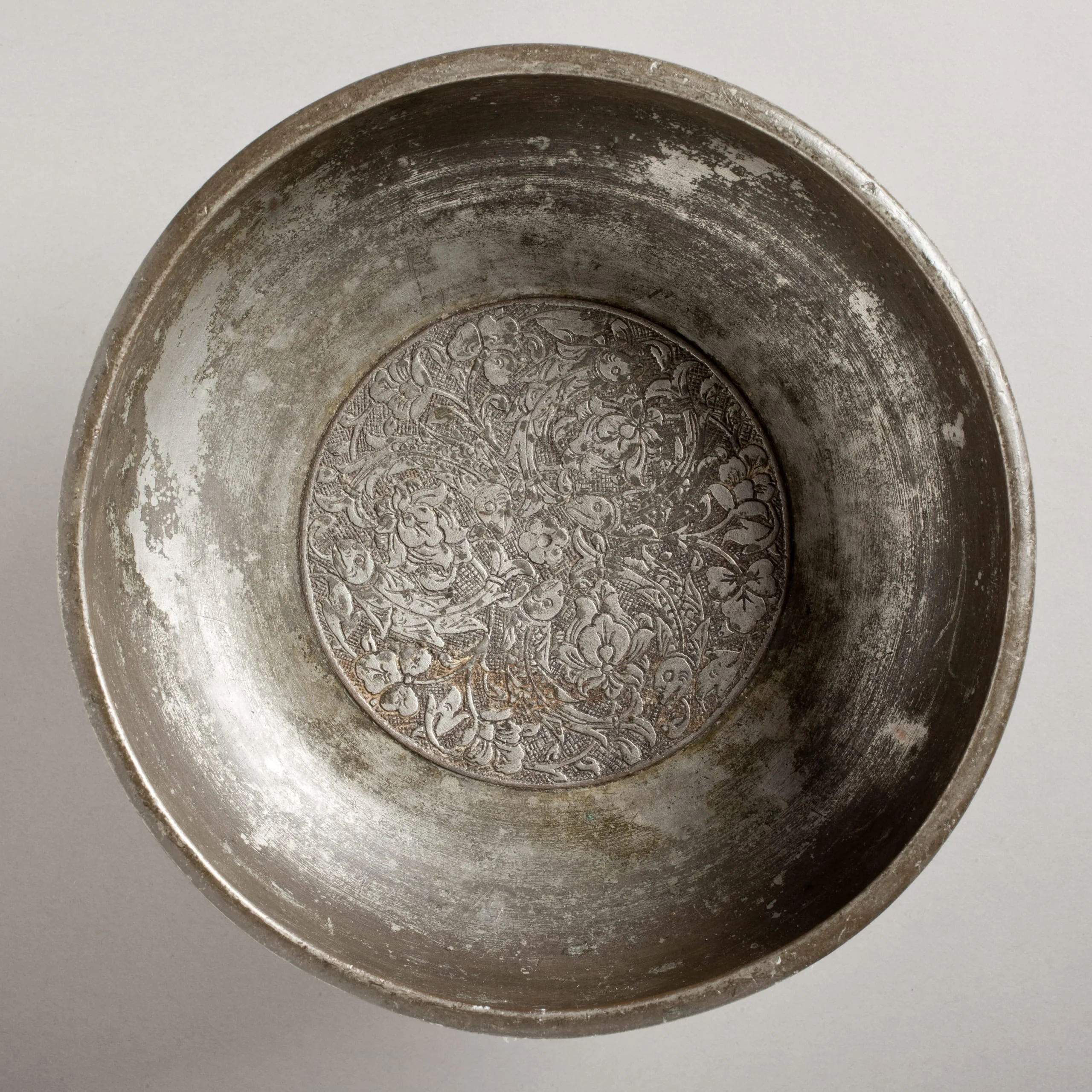 This petite shallow bowl belongs to a group of similarly decorated deluxe tinned copper wares that were likely made in Herat, the capital of the Timurid dynasty and a renowned center for Persian art and culture. These bowls, cups and plates can be generally associated with the serving and drinking of wine. Because tin is highly resistant to organic acids, the interior surfaces of receptacles for food and beverages were frequently tinned to protect both vessel and owner. Beginning in the Timurid period, the exteriors of vessels (and other objects such as candlesticks) were often tinned as well clearly for decorative purposes and perhaps to emulate silver. Along with inscriptions, the program of design of this group comprises primarily a chinoiserie decorative vocabulary of boldly conceived large-scale blossoms and leaves, combined with more traditional foliate scrolls, and geometricizing designs such as an interlocking Y-pattern, as here. The poetic text inscribed in a band below the rim of this bowl contains three couplets abridged from a ghazal (ode) by the renowned Persian poet Hafiz (d. 1390), which is particularly suitable for such a wine vessel. In four cartouches on the underside of the bowl, which would be visible when it was raised to the lips, is a dedicatory inscription to its owner Master (ustad) Yari the coppersmith (saffar).