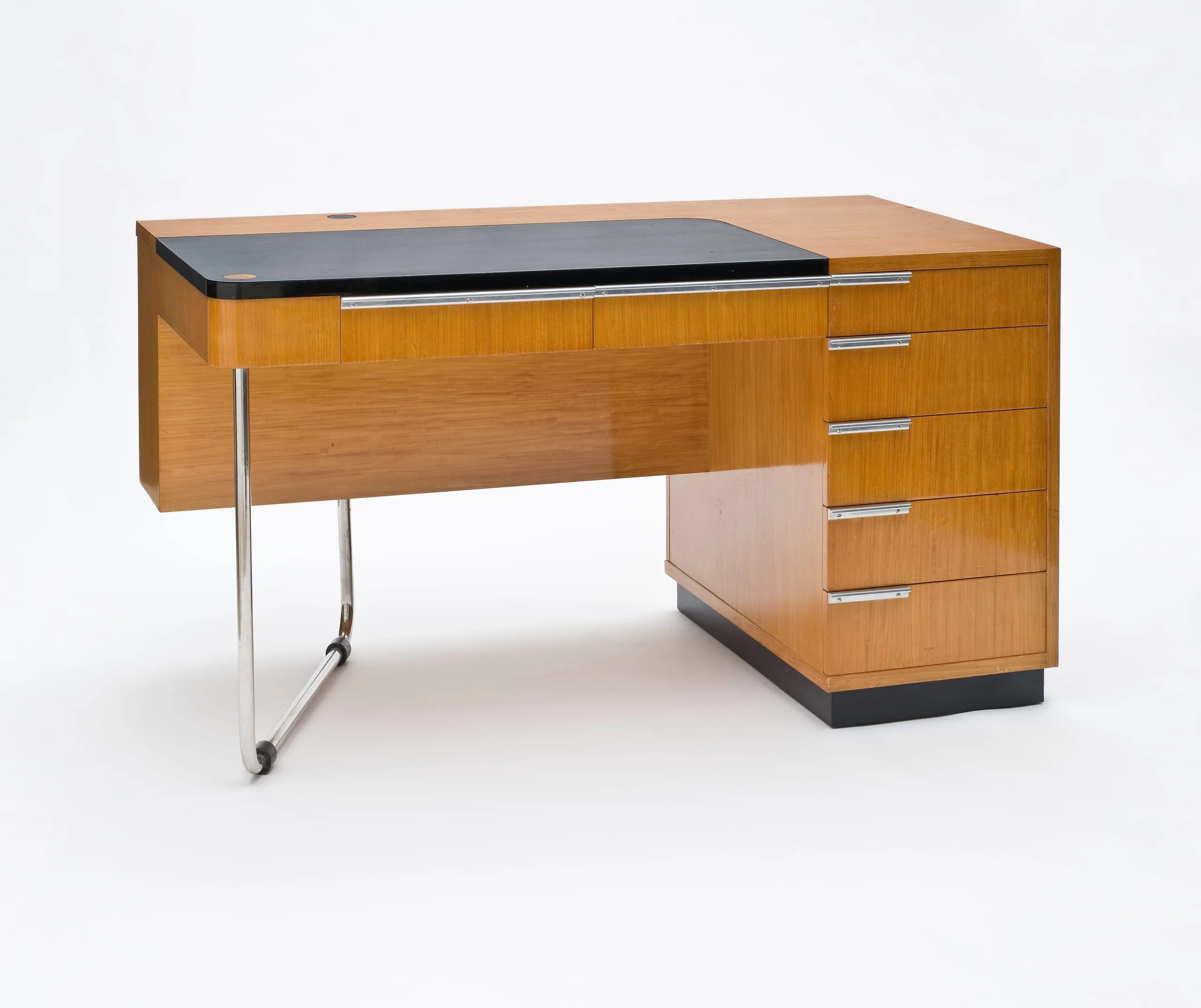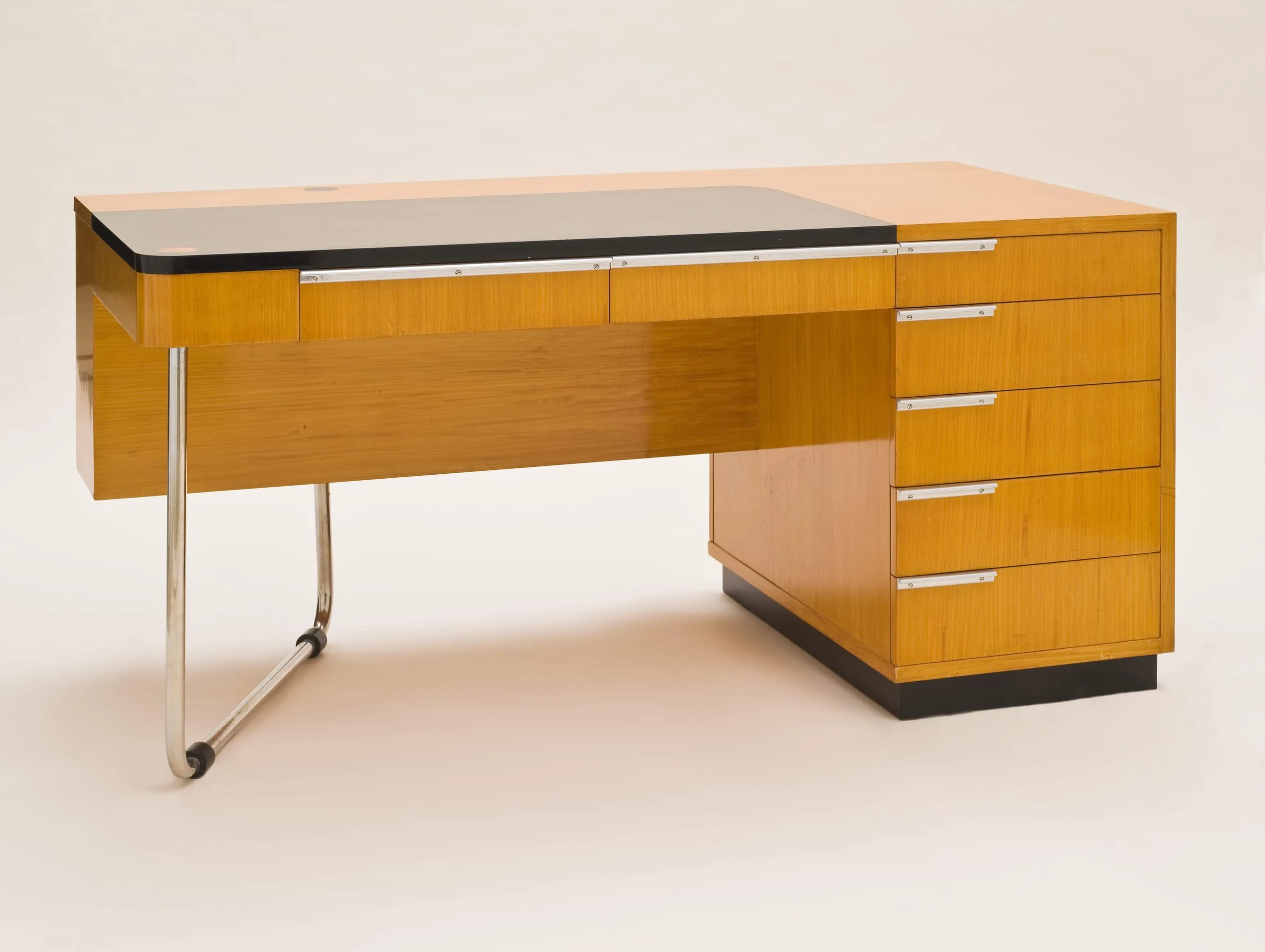 Modernist desk in light honey-toned wood veneer with open shelving, a dark inset writing surface at upper right, a cabinet with chrome pull at left, and a tubular chrome cantilever leg at right, on a dark plinth base.