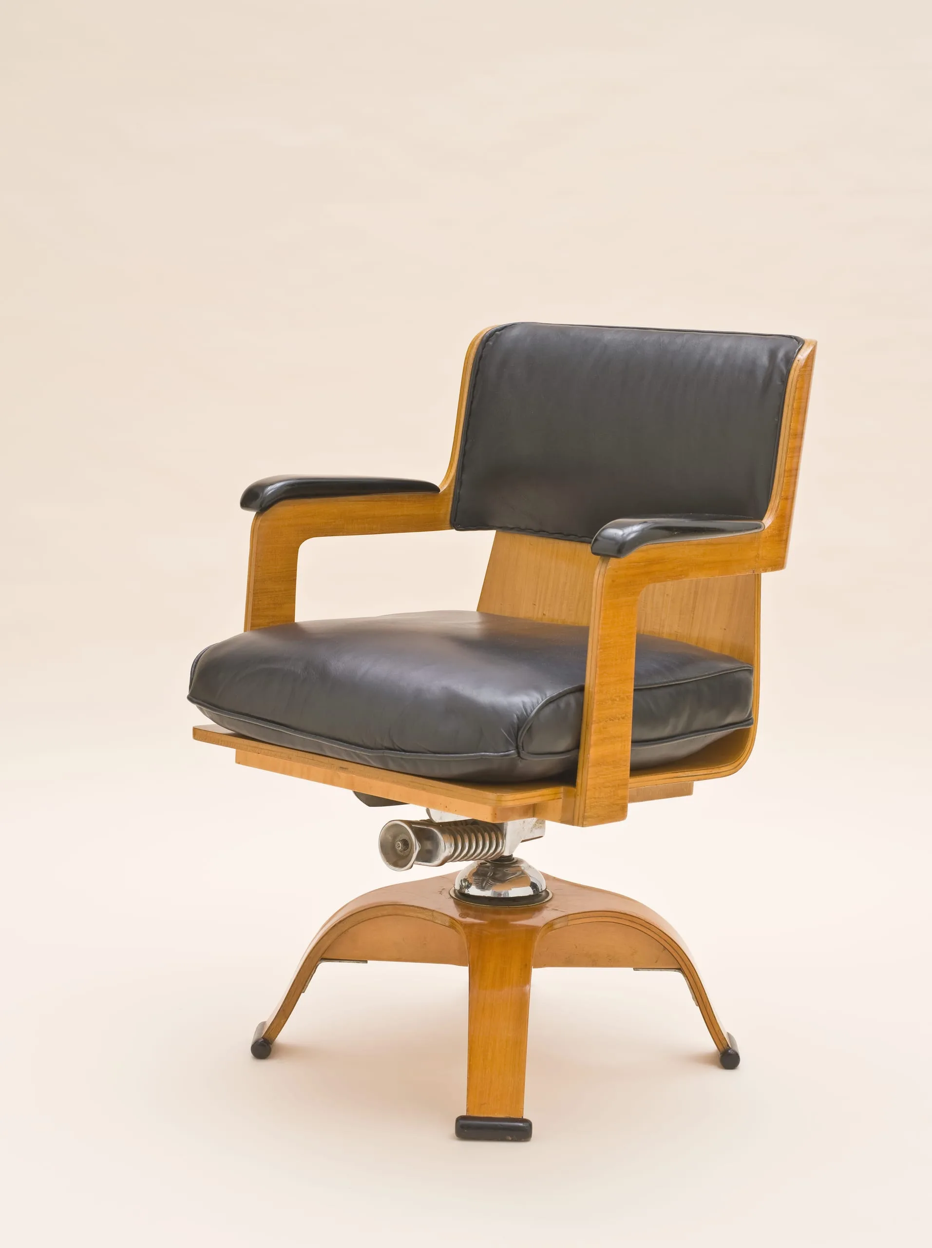 The desk, which has not been seen publically since the GGIE, is the embodiment of California modern, combining beautiful satinwood with the new materials of Bakelite and chrome plated steel. It was a custom design specially made for the room and shown at the GGIE with the equally innovative plywood chair. We don’t know if the chair was designed specifically for the GGIE since it also appears in a drawing for an office that was part of another critically important commission for Weber – the site plan, all buildings, and furnishings for Walt Disney Studios in Burbank, also completed around the same time, in 1938-1939. (Wendy Kaplan, Department Head and Curator of Decorative Arts and Design)