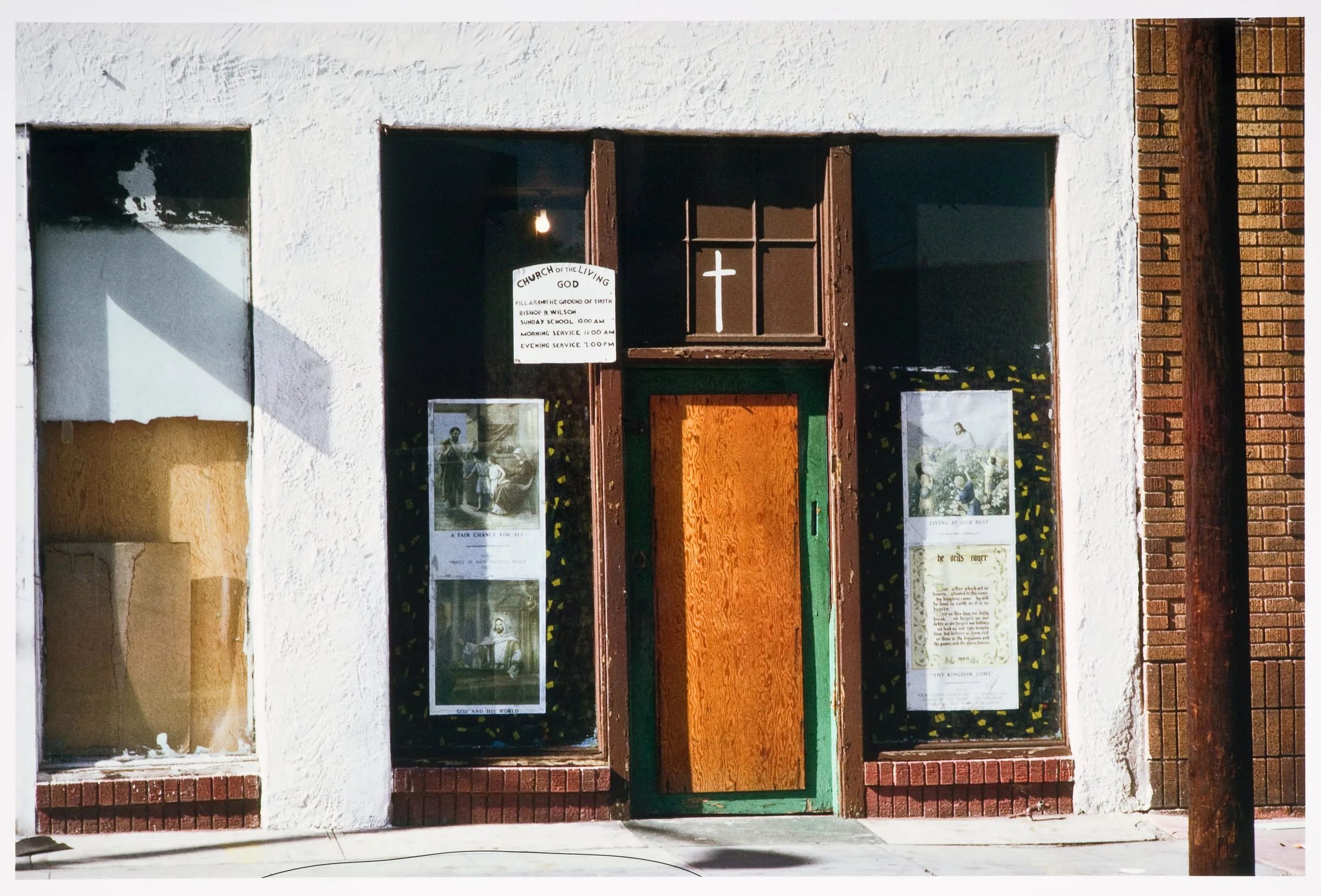 Color photograph of a storefront church facade with an orange door in a green frame, white cross in transom window, Bible illustration posters, and a 'Church of the Living God' sign