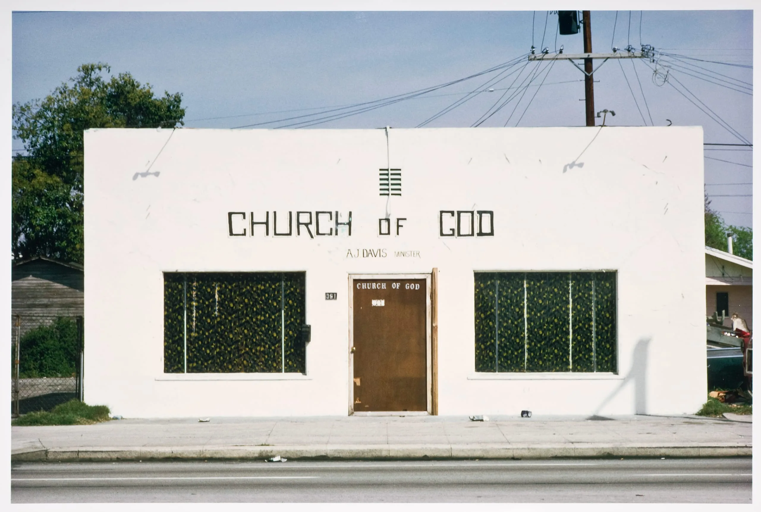 Color photograph of a flat white stucco building facade with 'CHURCH OF GOD' painted in large black letters, centered door flanked by two floral-curtained windows