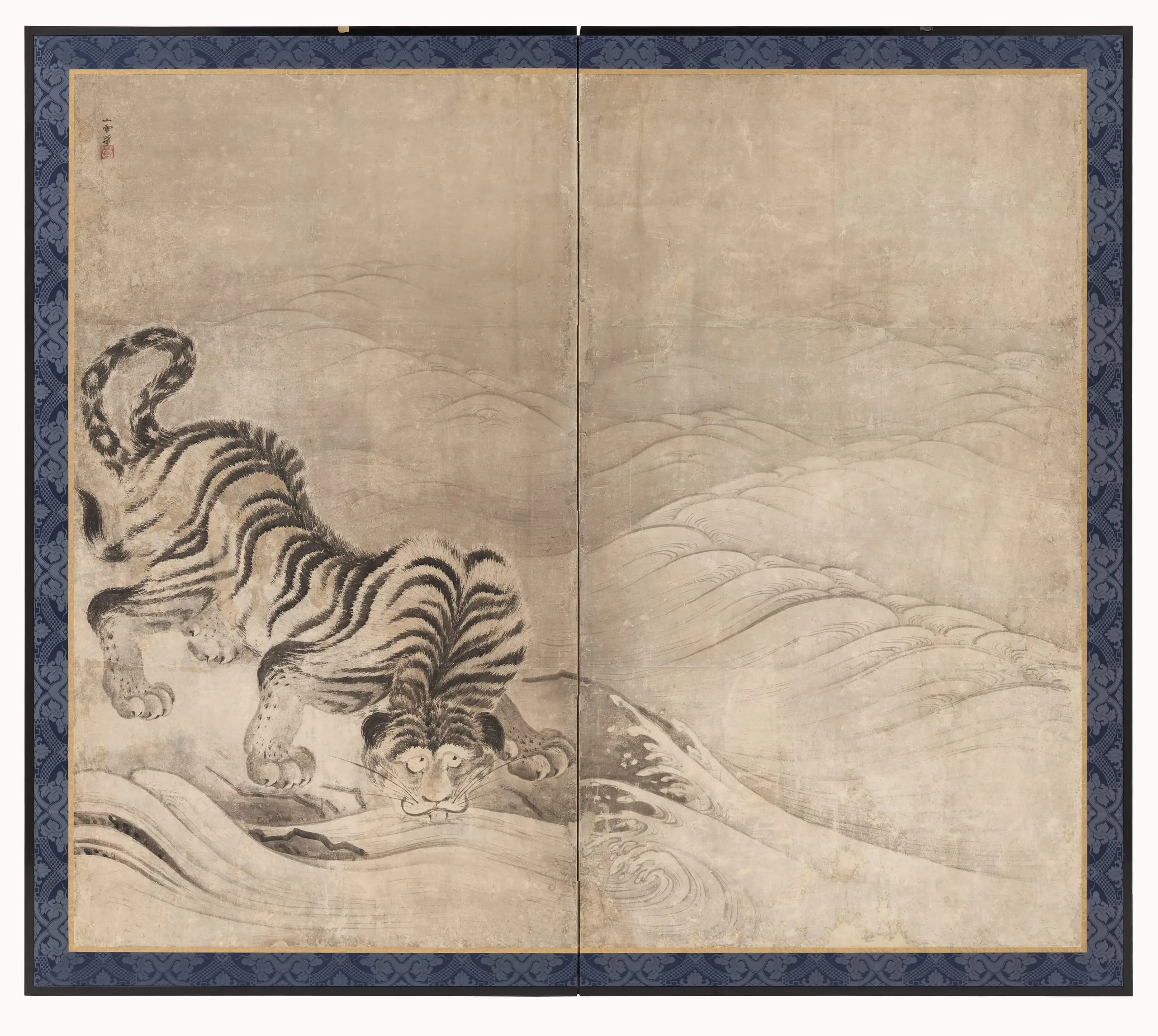 Created in the Kanei period (1624–44), Tiger Drinking from a Raging River is the only signed screen painting by the celebrated artist Kano Sansetsu (1590–1651) to ever leave Japan. The most original Japanese artist of the seventeenth century, Sansetsu is often favorably compared to the eighteenth-century painter Ito Jakuchu, who is well represented in American collections.