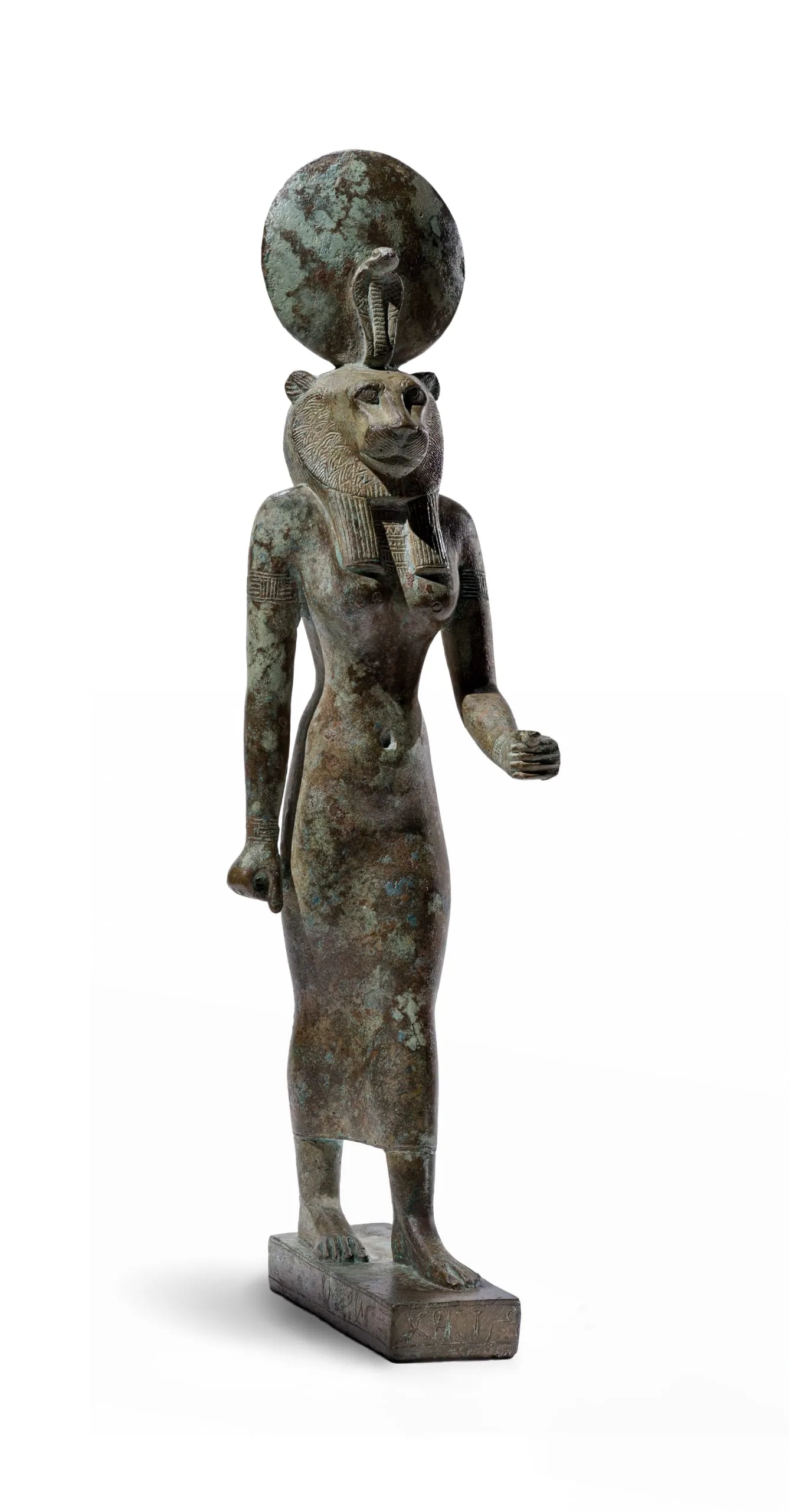 The figure is remarkably intact, displaying the full sun disc, uraeus (the sacred cobra on the headdress), inscribed base, and the tangs that attached the statuette to an ancient pedestal or other support. As in most similar examples, the attributes originally held by the hands, probably a papyrus scepter in the proper left hand and an ankh in the right, are now lost. Narrow-waisted, the human figure is treated in an exceptionally refined and supple manner, with contours of the breasts, abdomen, and thighs clearly visible beneath the thin garment. Incised details such as the patterning of the lion mane, broad collar, armbands, and bracelets are carefully rendered.