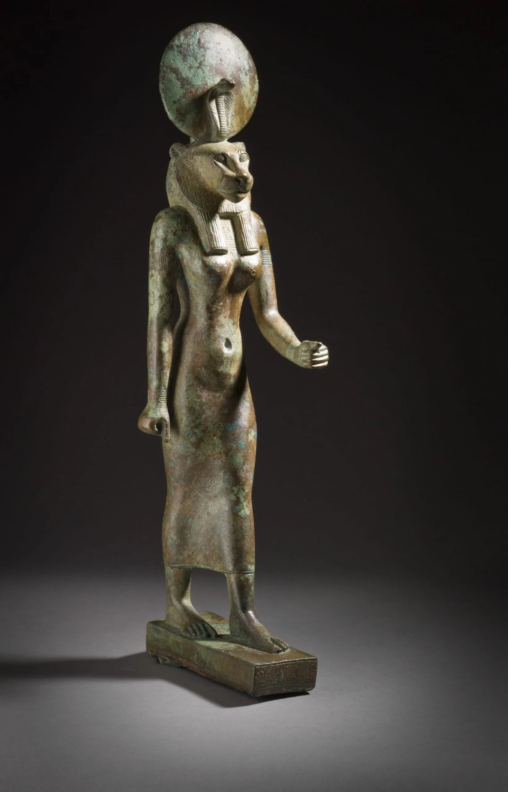 This elegant, striding bronze figure represents the goddess Wadjet, protectress of the king and tutelary deity of Lower Egypt. One of several Egyptian goddesses depicted with the head of a lioness, Wadjet is identified in this example by the dedicatory inscription on the rectangular base. The preserved portion of the text also includes part of the donor's name and parentage. This figure probably was dedicated as an offering in a temple, and in addition may have served as a container for the remains of a sacred animal.