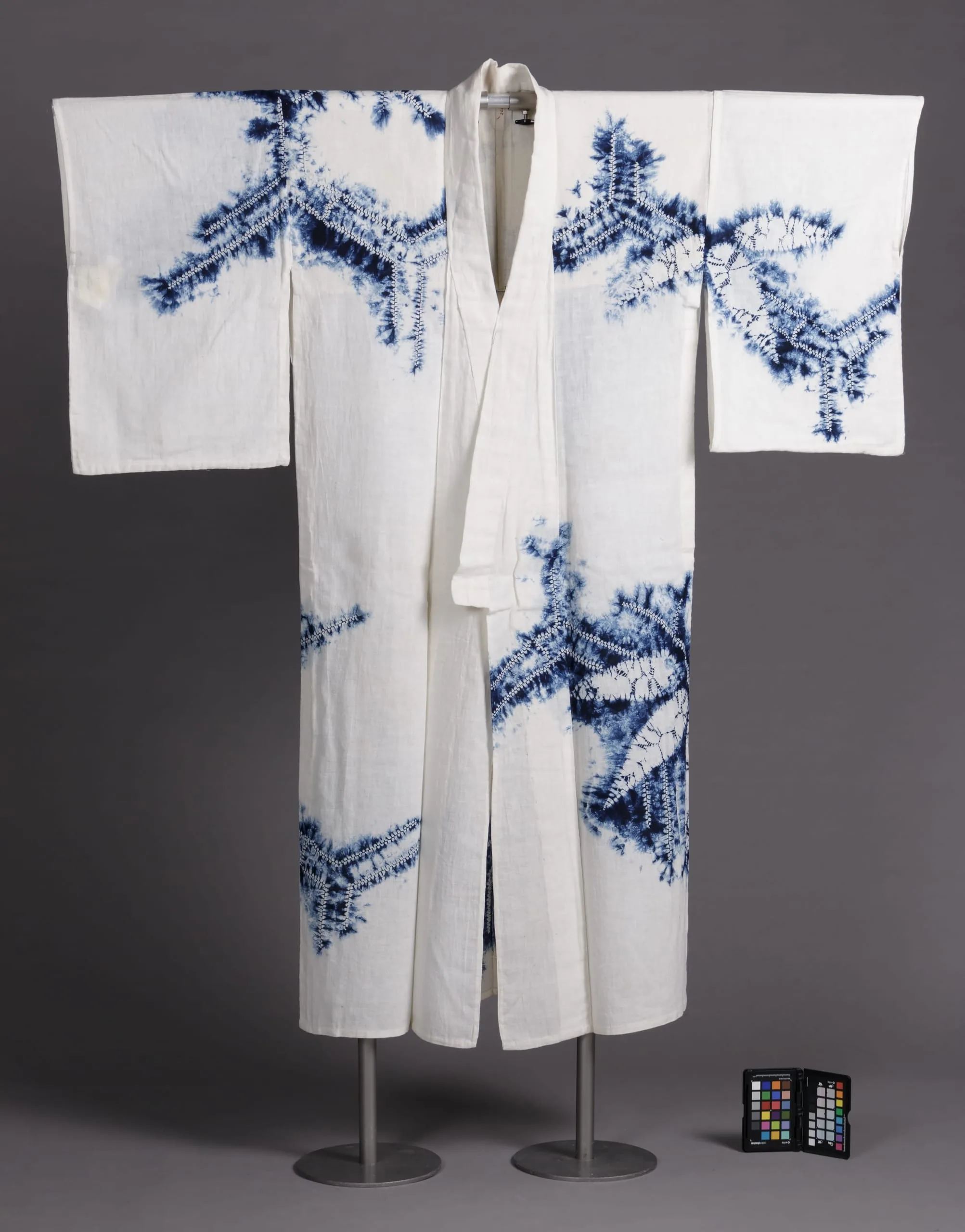 - Cotton plain weave, tie- and stitch-resist-dyed (boshi and nuishime shibori)