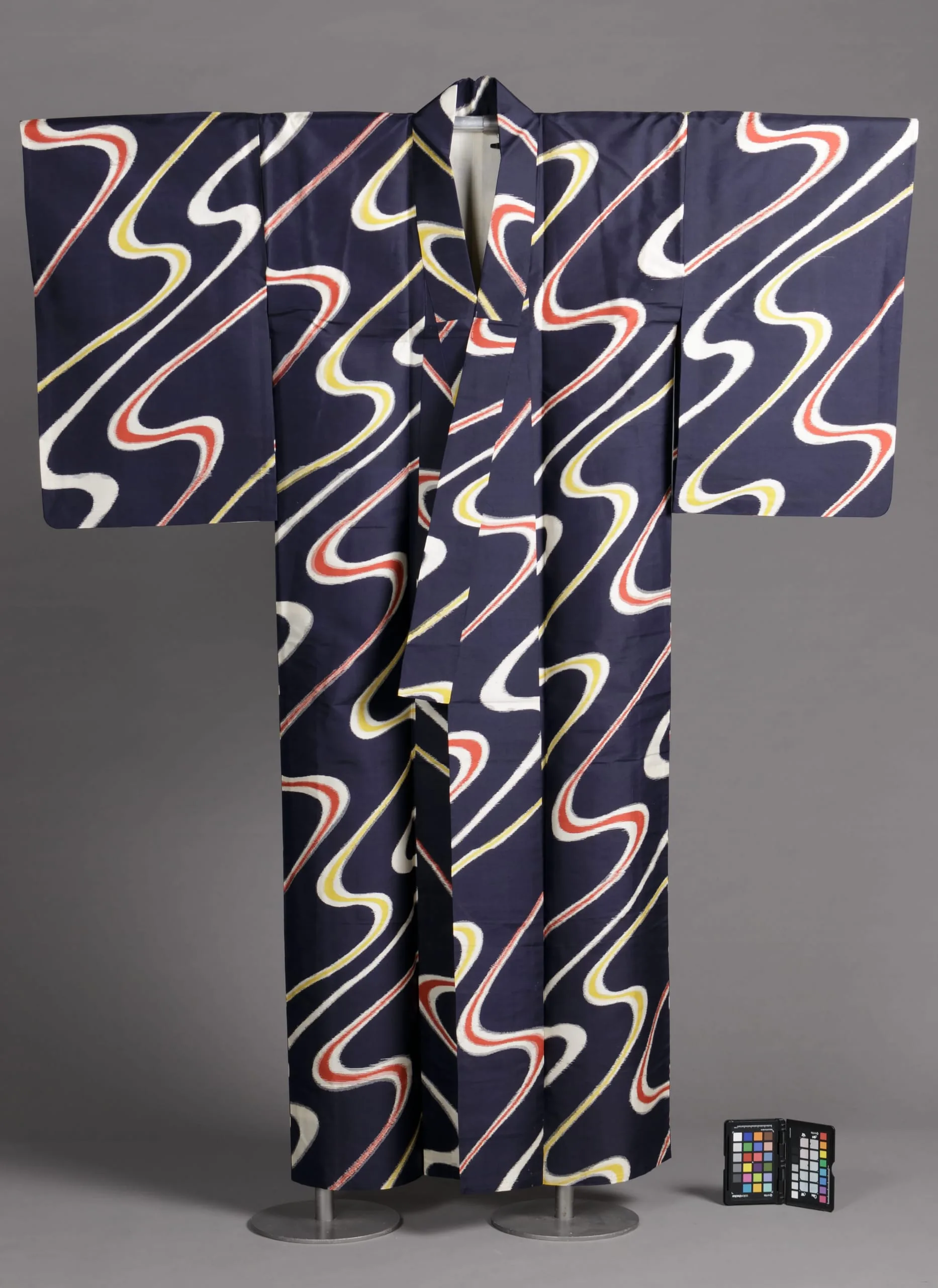 - Silk plain weave, stencil-printed warp and weft (heiyo-gasuri meisen)