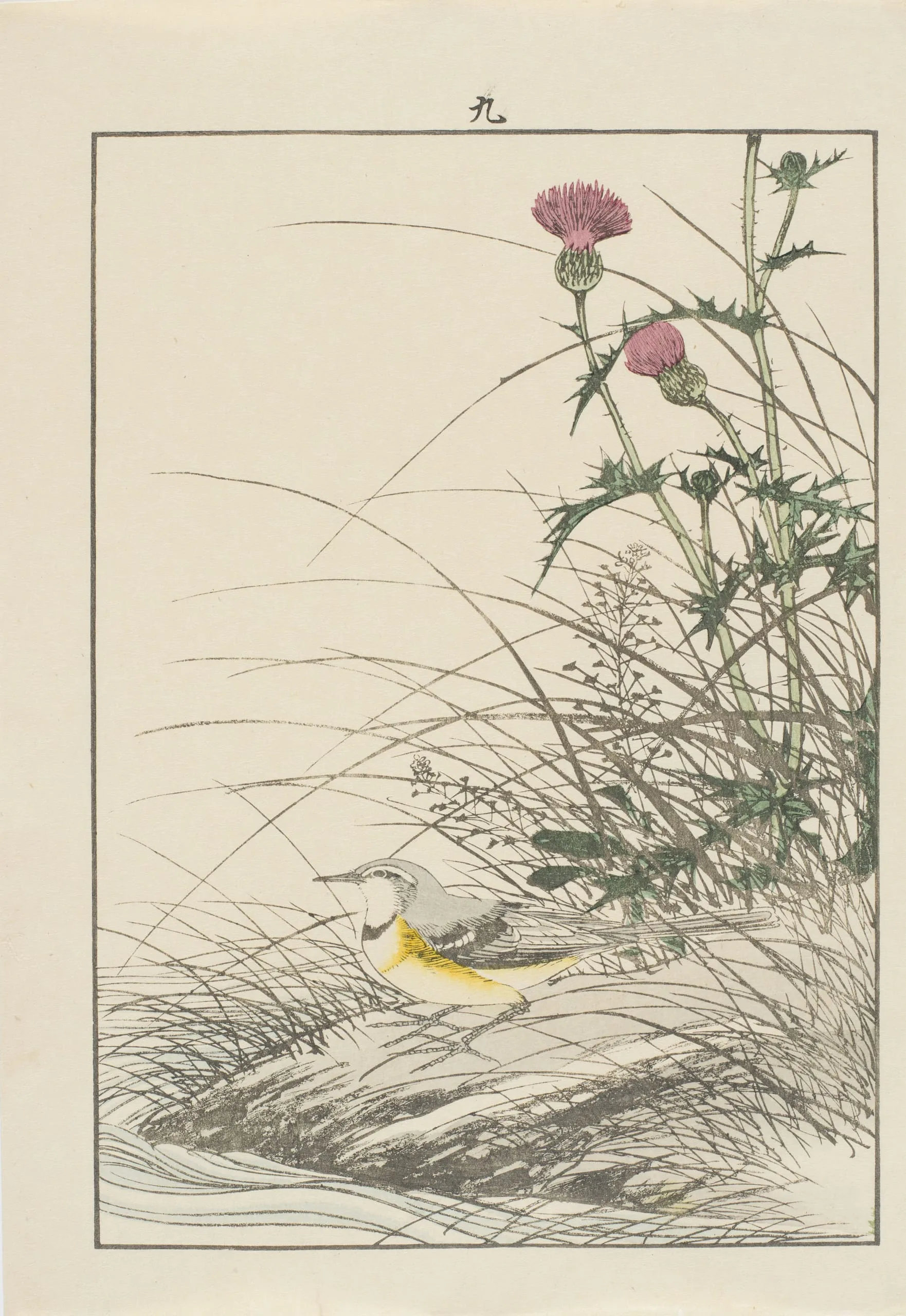 Japanese woodblock print of a small yellow-and-gray bird resting among grasses beside a flowering thistle, rendered in fine ink lines with flat color on cream paper