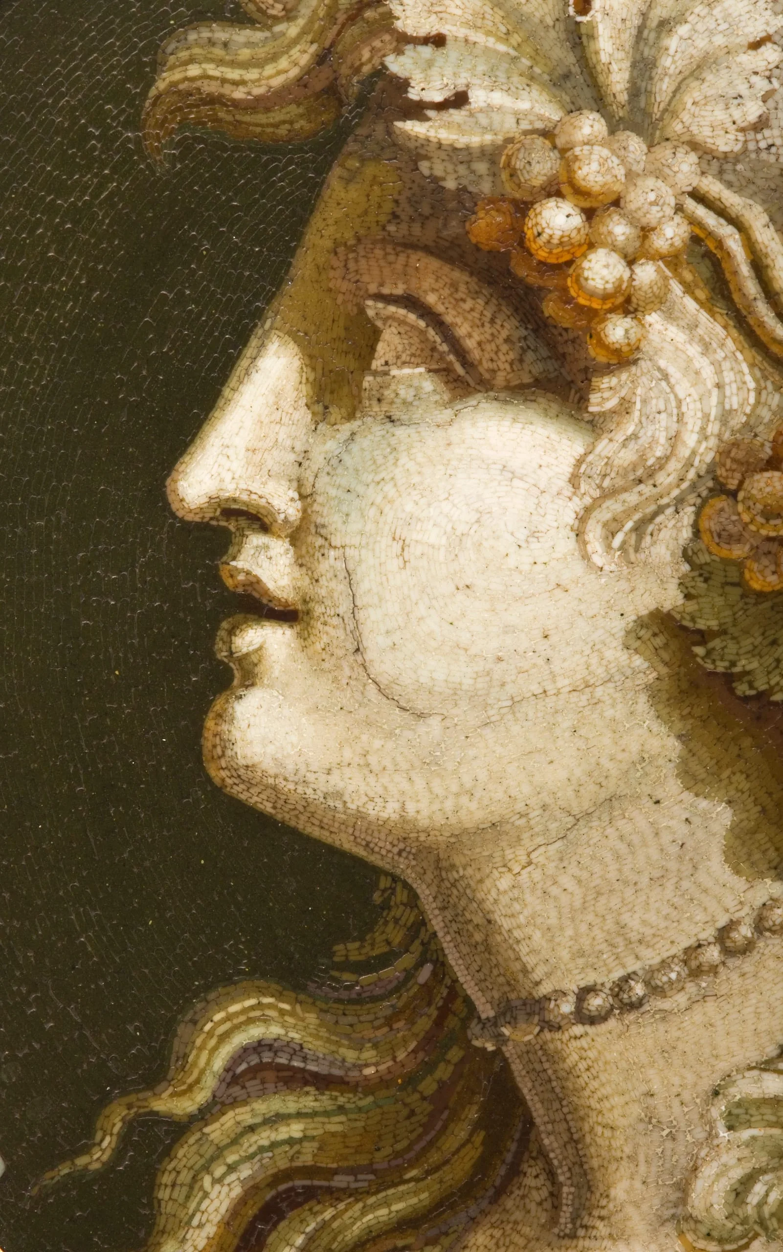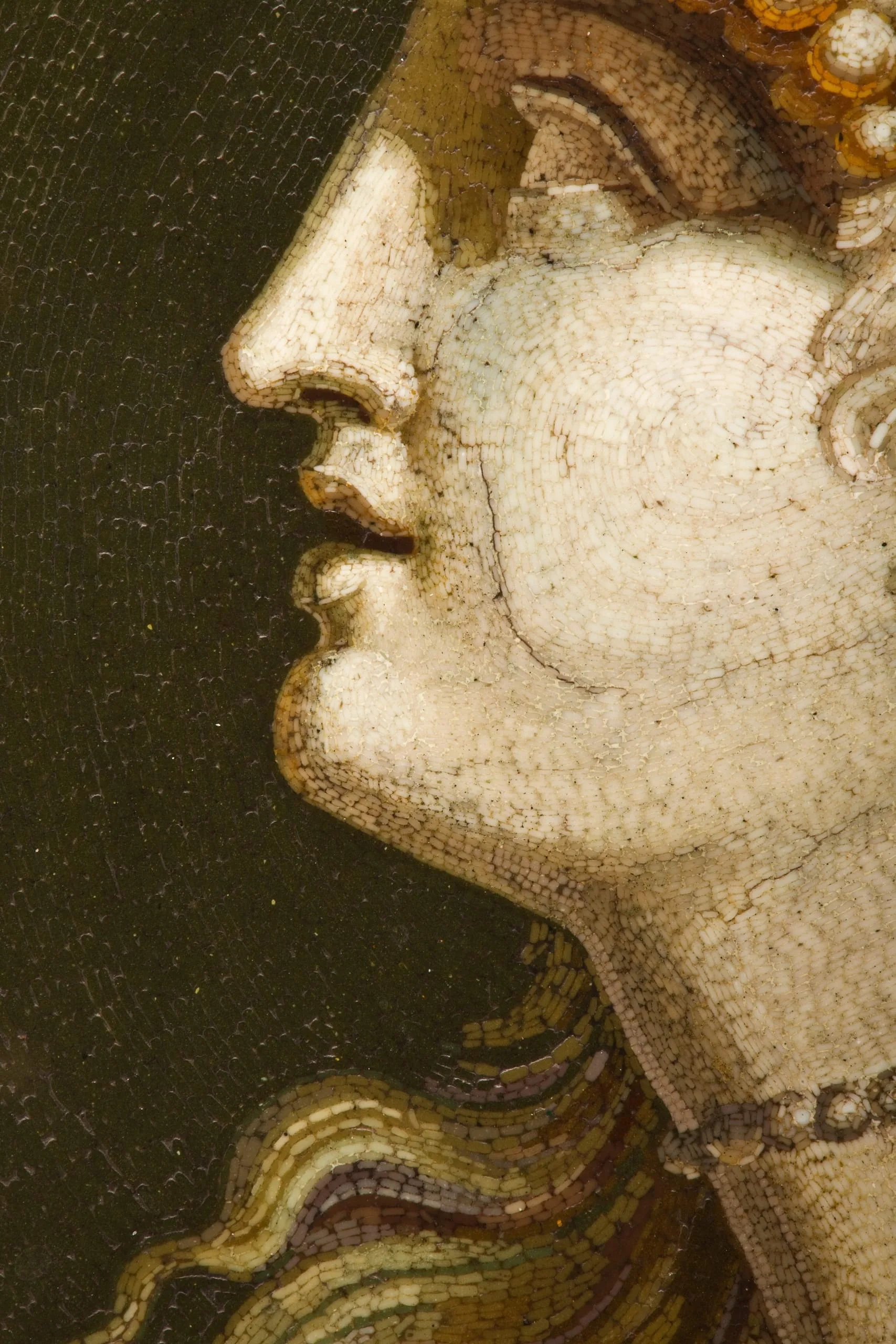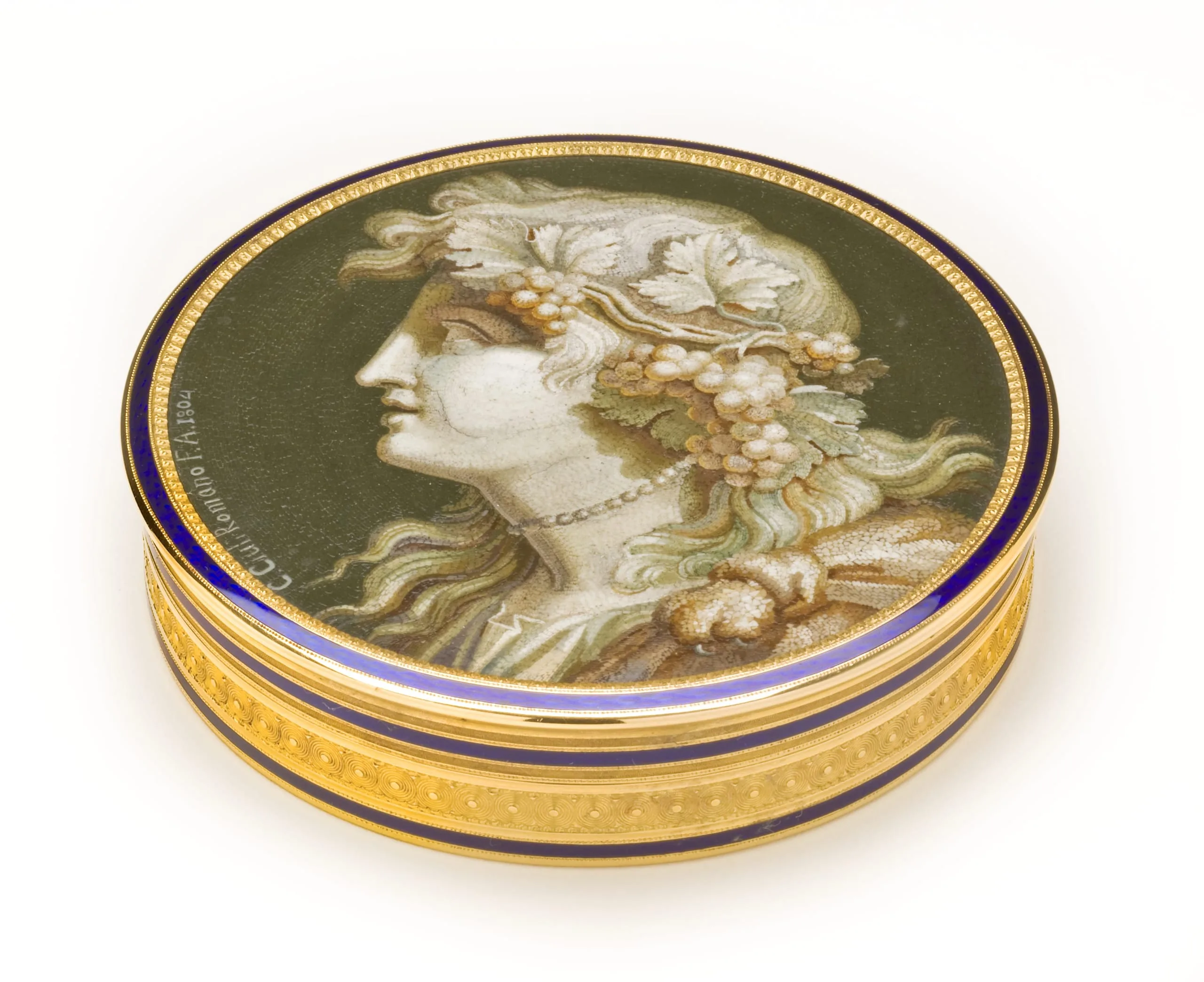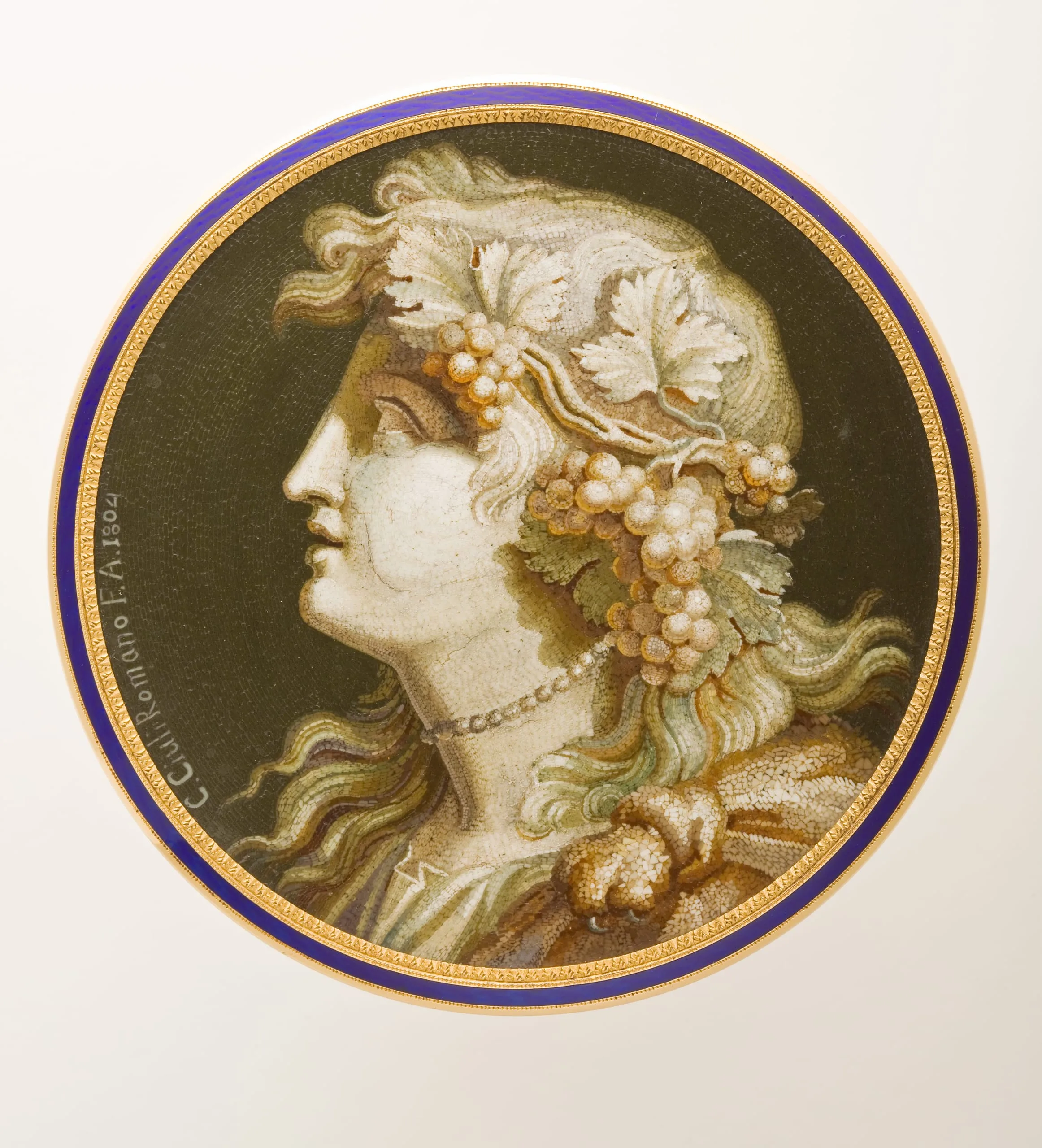 While the invention of micromosaics dates to 1775, the technique derives from the ancient Roman mosaics used for floors and walls. While earlier mosaics were made of larger pieces of stone or glass, the infinitesimal pieces used for intricate micromosaics are achieved by creating thin strips or threads of glass, known as smalti filati, which are cut into tesserae. The bonbonnière, featuring a profile bust of Bacchus, the Roman god of wine, is an exquisitely rendered masterpiece belonging to a rare group of micromosaics that endeavor to emulate the appearance of marble sculptures. Similar to composing a grisaille drawing, Ciuli used dark tesserae to delineate the contours and graded tones of tesserae to evoke contrasting shadows and highlights. The bonbonnière will soon be on display in the European galleries, along with other works from the Gilbert Colleciton.