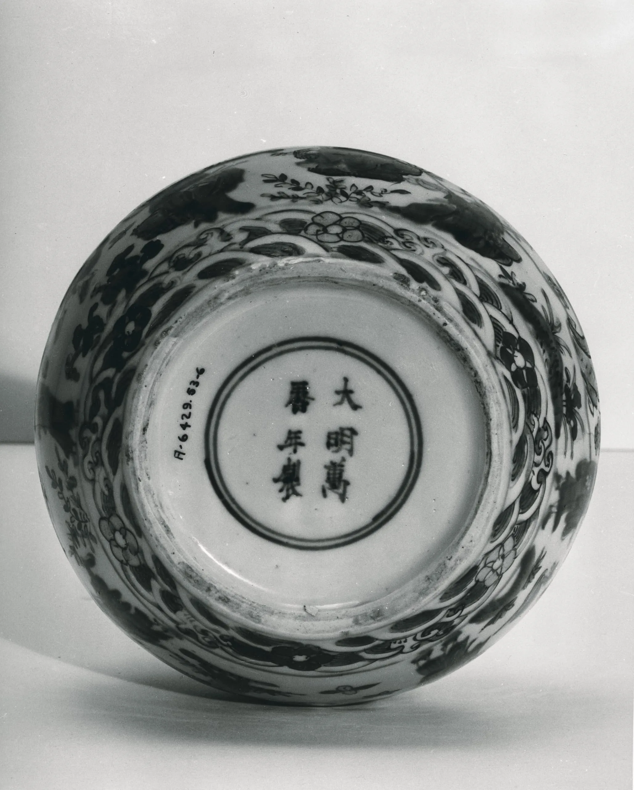 - Wheel-thrown porcelain with underglaze blue, clear glaze, and overglaze painted enamel decoration (doucai)