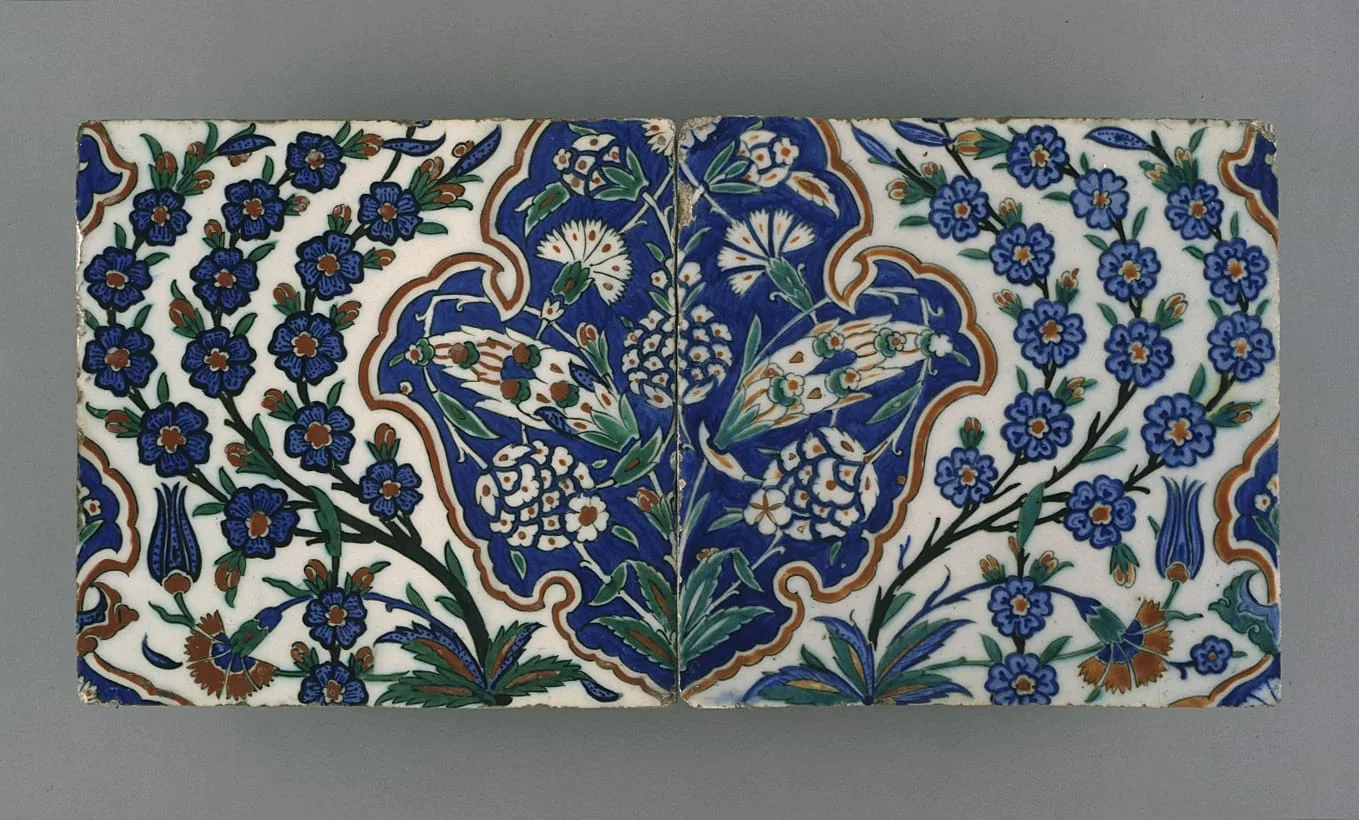 Ceramics made in Iznik, in western Turkey, represent one of the most renowned and influential arts of the Ottoman period. The Iznik kilns, about 85 miles southeast of the capital, Istanbul, produced both tableware and architectural revetment such as this. Tiles were first manufactured at Iznik around the early sixteenth century; however, production increased dramatically in the second half of the century as the court sponsored more and more new buildings.