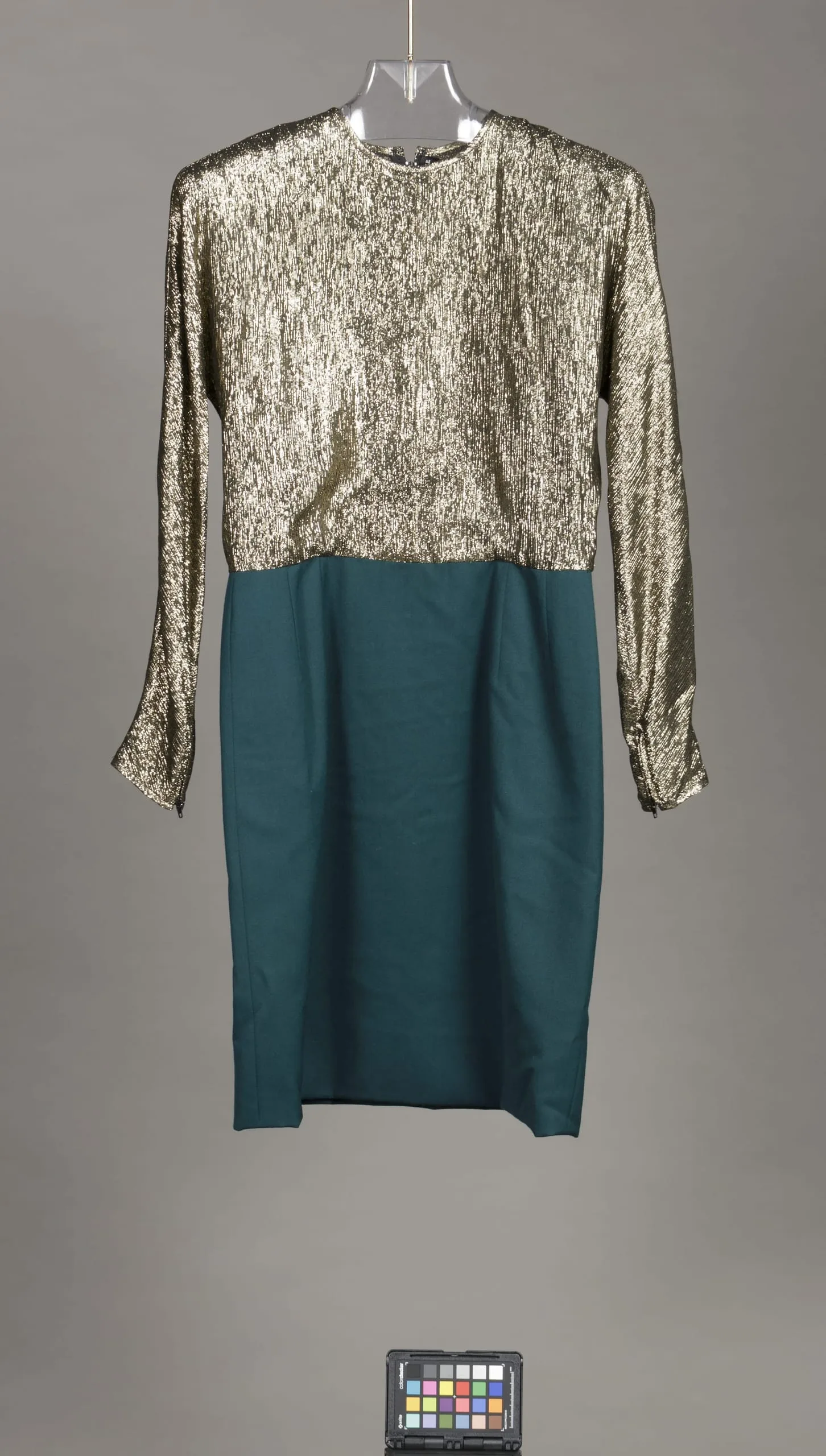 - Jacket: wool plain weave, fulled and quilted, with synthetic- and metallic-thread trim and silk- and metallic-thread covered buttons; Dress: silk and metallic-thread plain weave (lamé) and wool twill; Belt: wool twill and metal