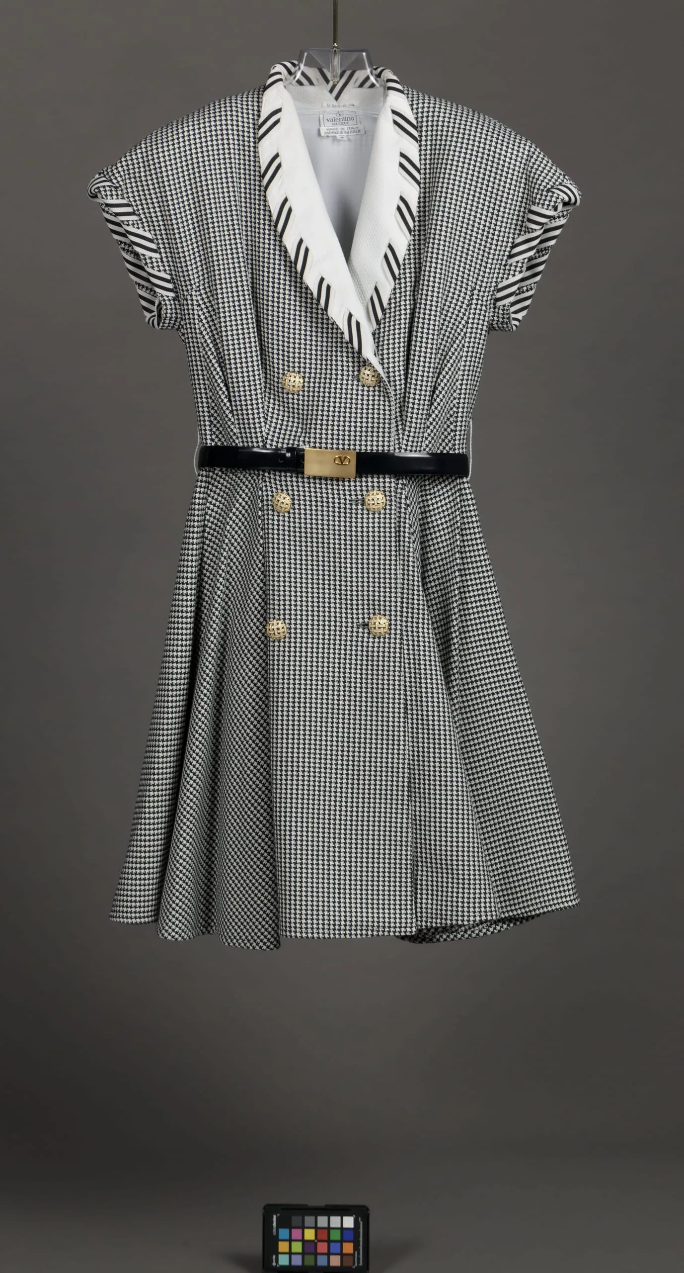 - Dress: Cotton twill (hound's tooth), cotton double-cloth (piqué), silk grosgrain, metal buttons; Belt: Leather, metal