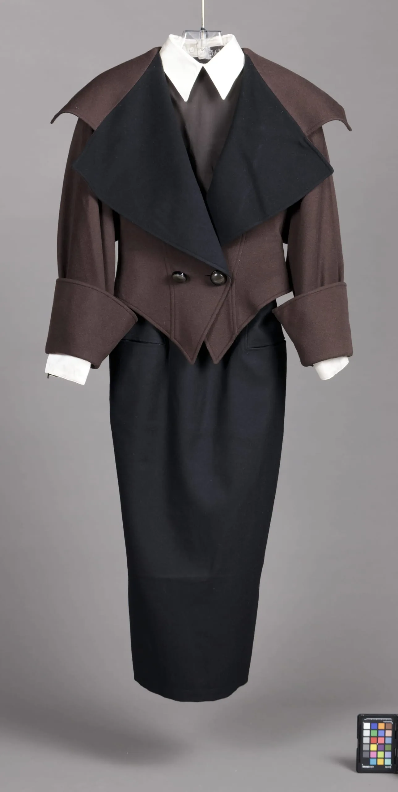 - Jacket and Skirt: cashmere twill, fulled; Blouse: silk plain weave; Collar: silk satin