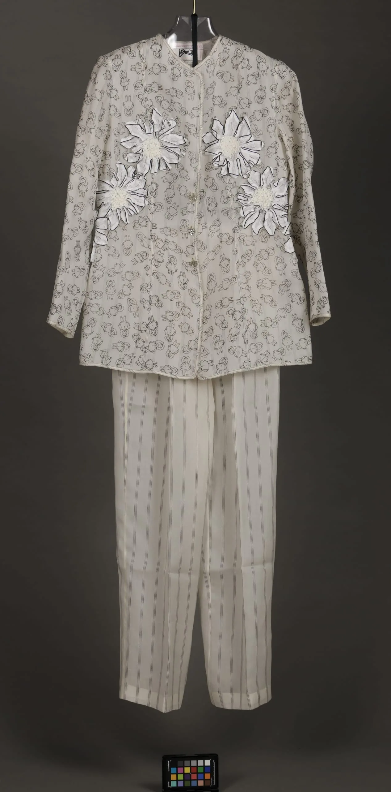 - Jacket: Silk plain weave, printed, with silk ribbon and silk machine-made lace appliqué; Pants: Silk plain weave