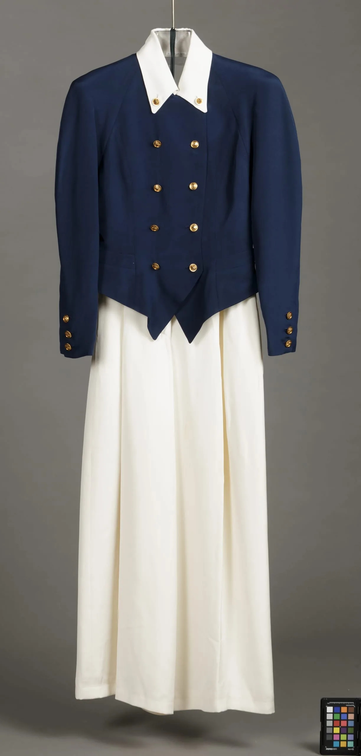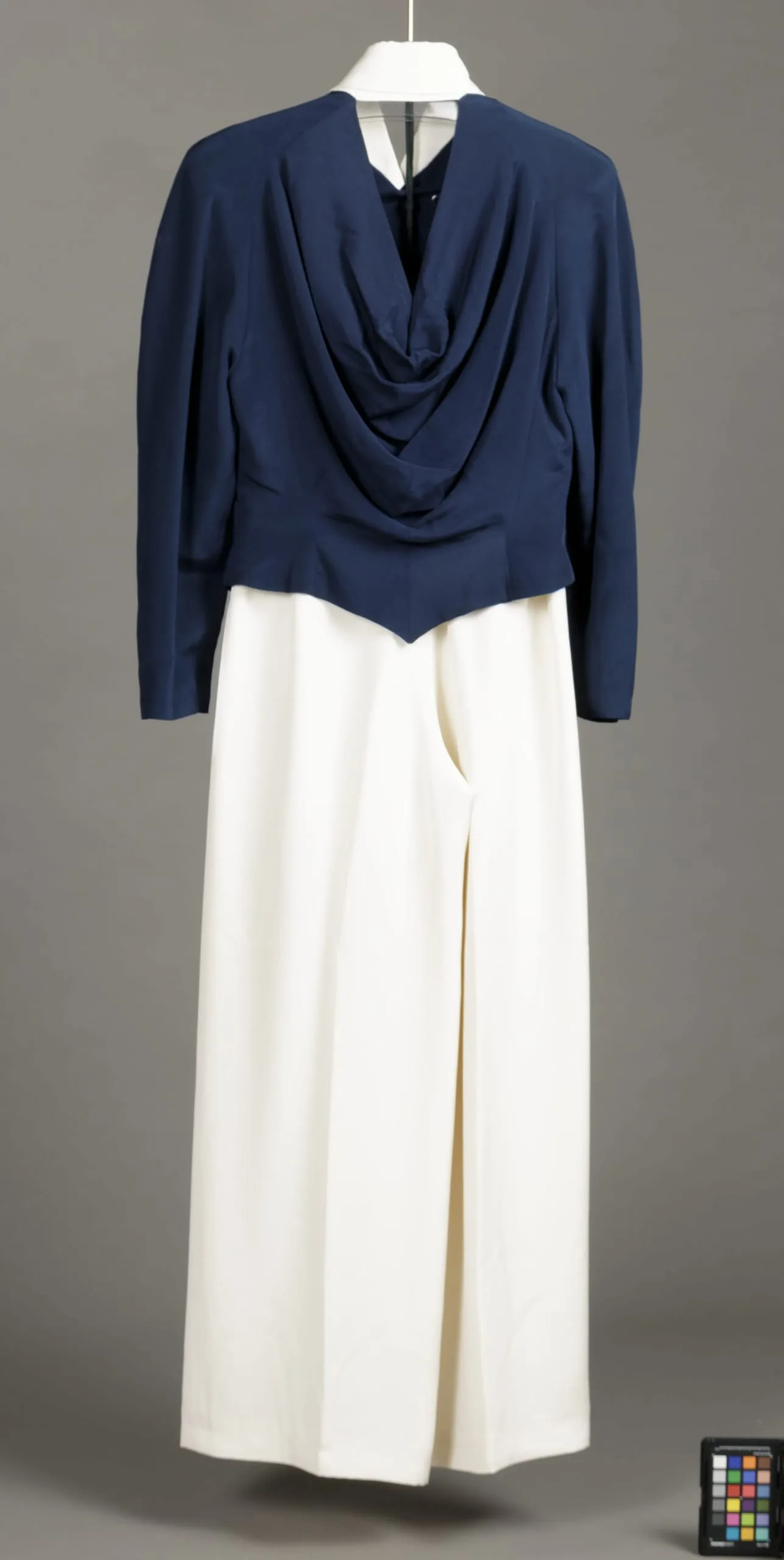 - Jacket: Silk plain weave with metal buttons; Pants: silk plain weave