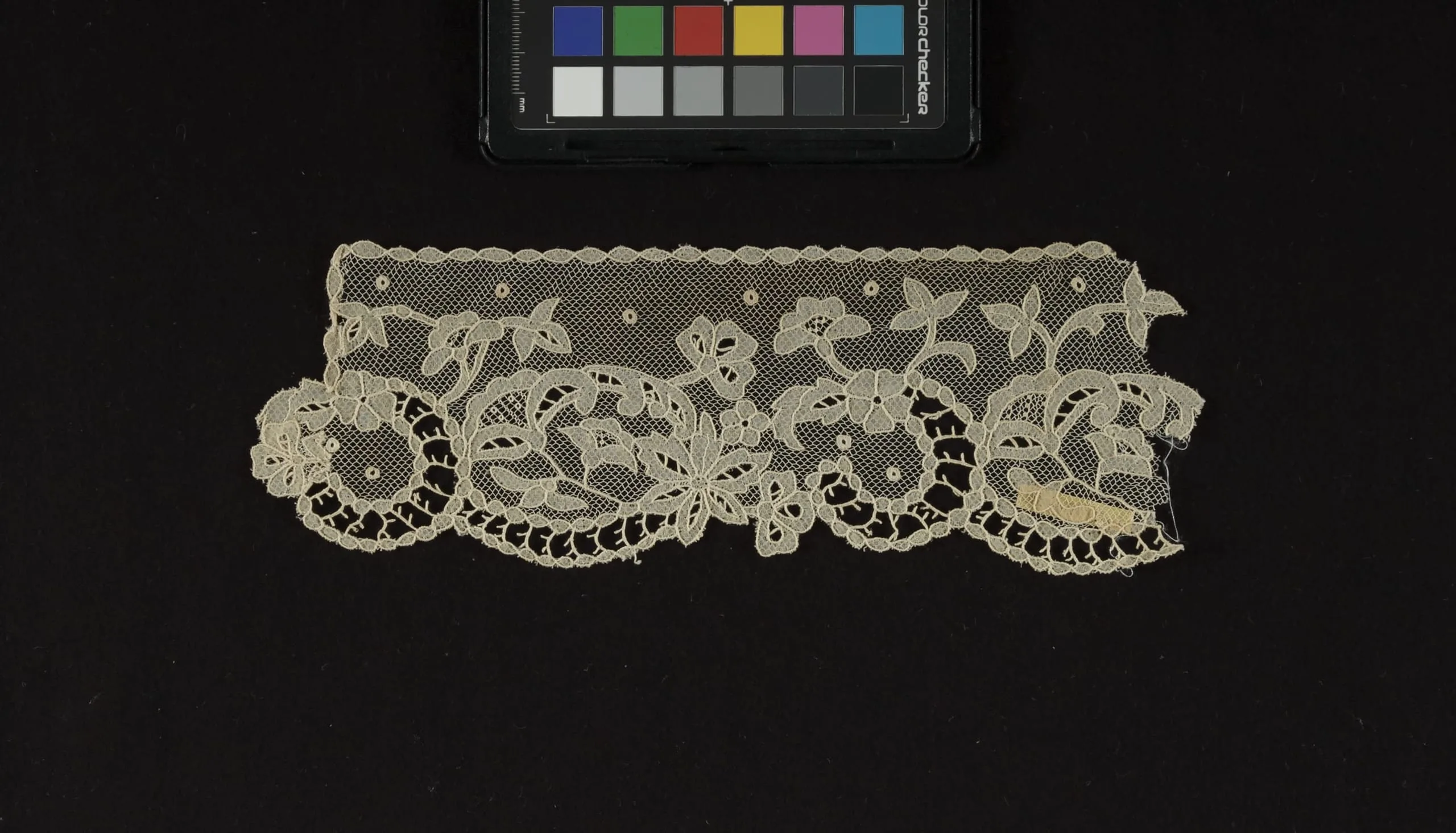 Strip of cream-colored bobbin lace with hexagonal mesh ground, scattered dot motifs, and dense floral clusters along a scalloped lower edge