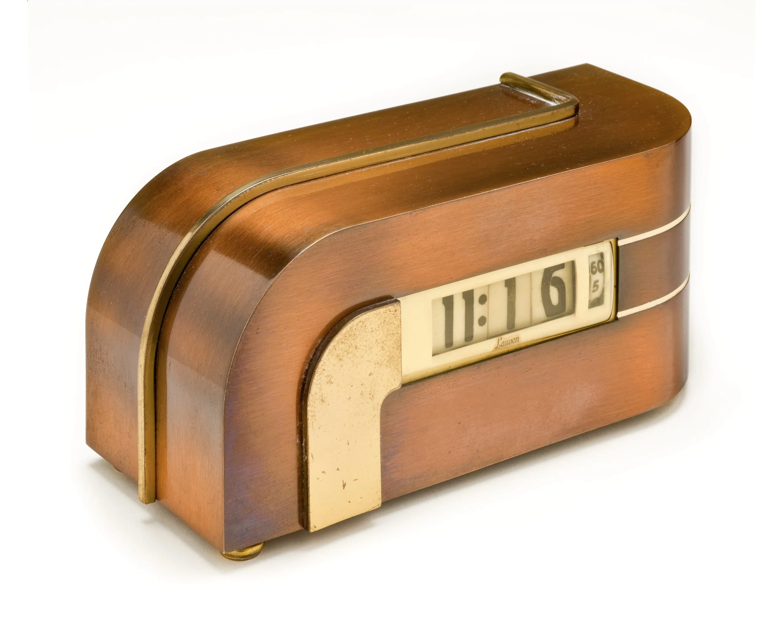 One of the most successful product designs created in California in the 1930s, the ‘Zephyr’ Clock epitomizes the glamour and speed of modern life. The clock’s low, horizontal emphasis, curving silhouette, and contrasting metals are characteristic of streamlining, a popular mode of design during the Great Depression for buildings, trains, cars, and industrial design objects. In 1934, the Burlington Railroad introduced the streamlined Burlington Zephyr train and displayed it at the Century of Progress Exposition in Chicago, and it could be from this source that the clock was named. The clock’s futurism is not just superficial, though – it was promoted as one of the first digital clocks, allowing one to read “exact time at a glance!” Despite being introduced in the midst of the Depression, the clock was commercially successful. The Lawson Time ‘Zephyr’ Clock is a masterpiece of California streamline design, and complements LACMA’s collection of streamline design made in California and elsewhere. (Bobbye Tigerman, Curator of Decorative Arts and Design)