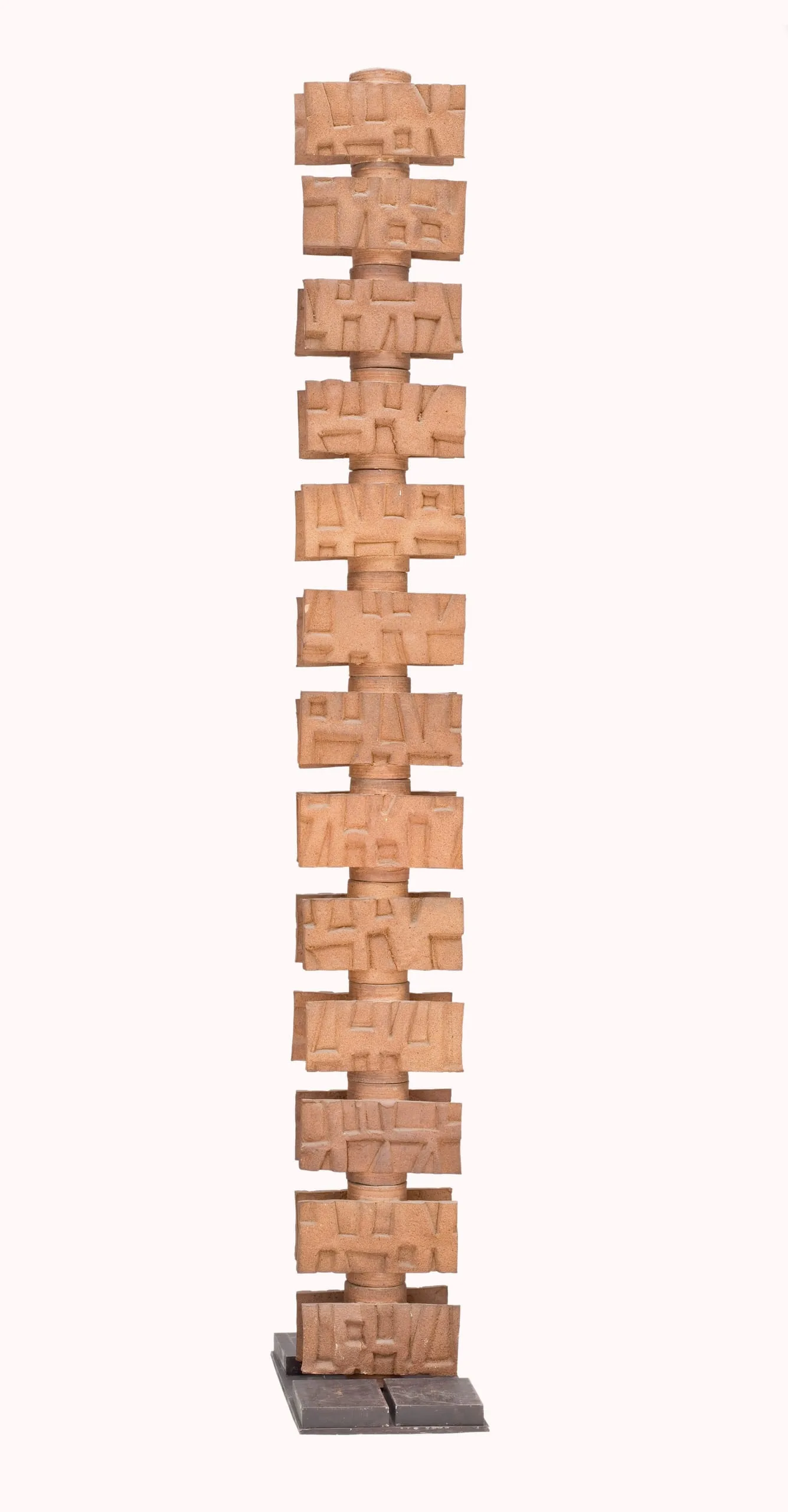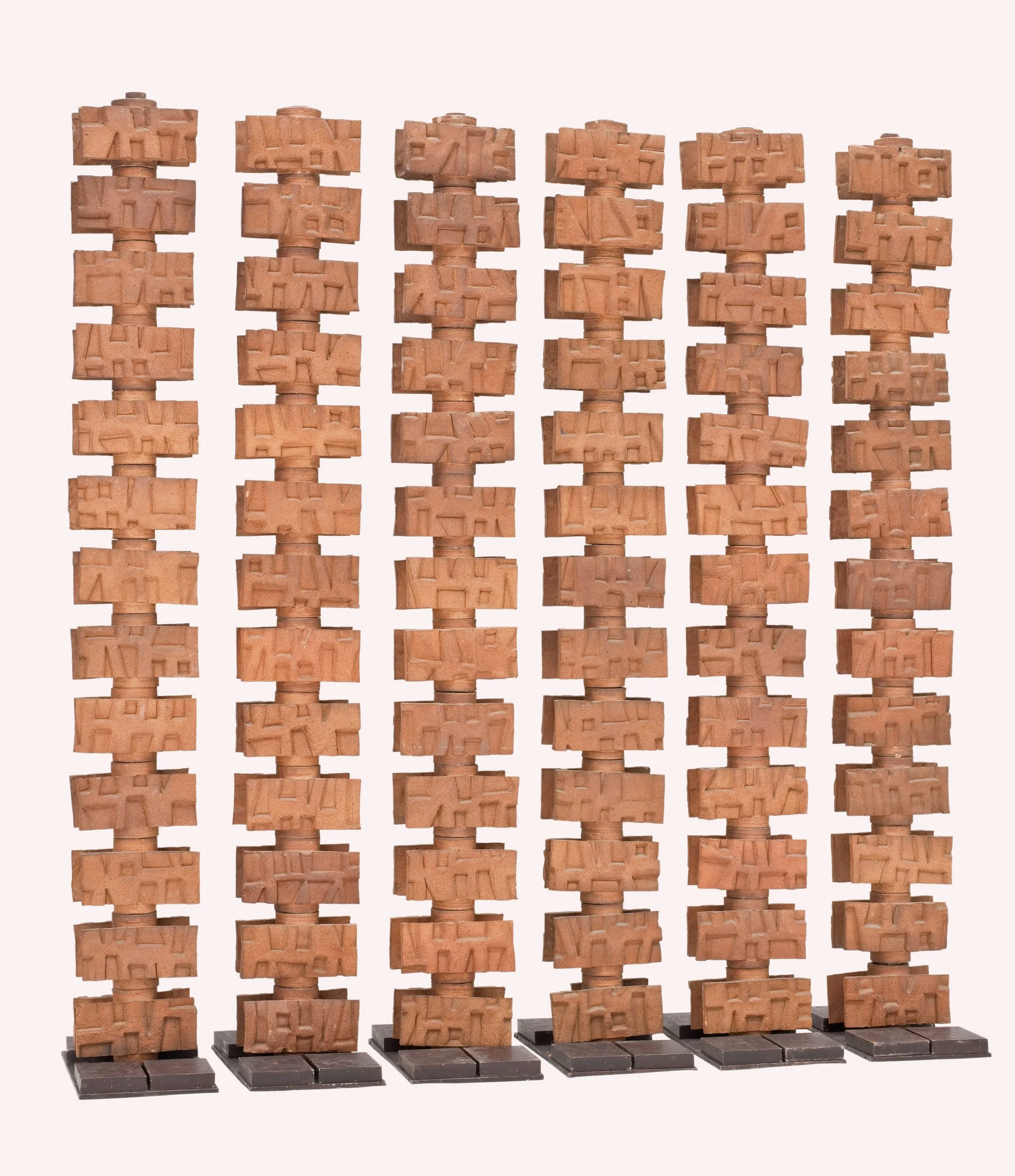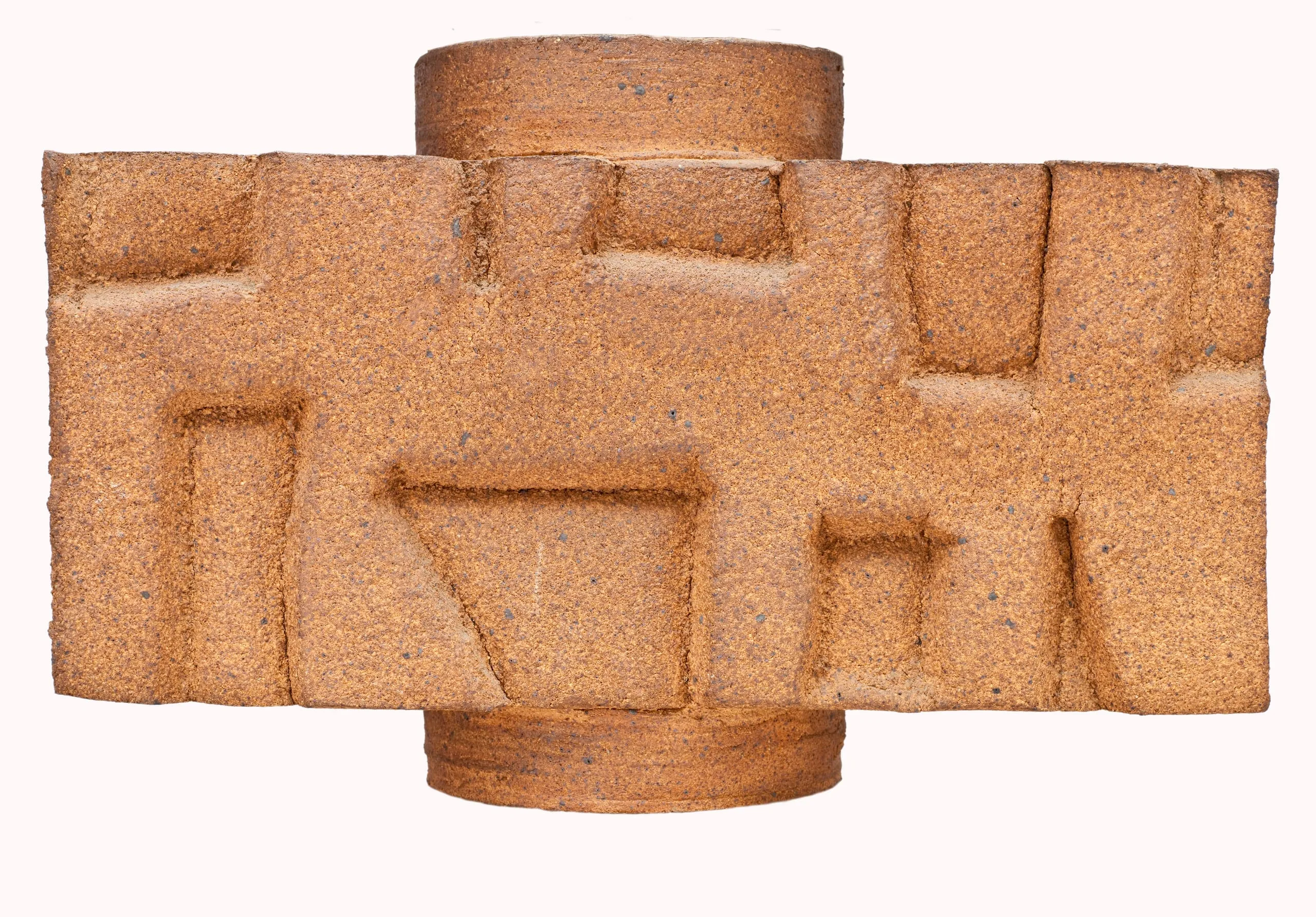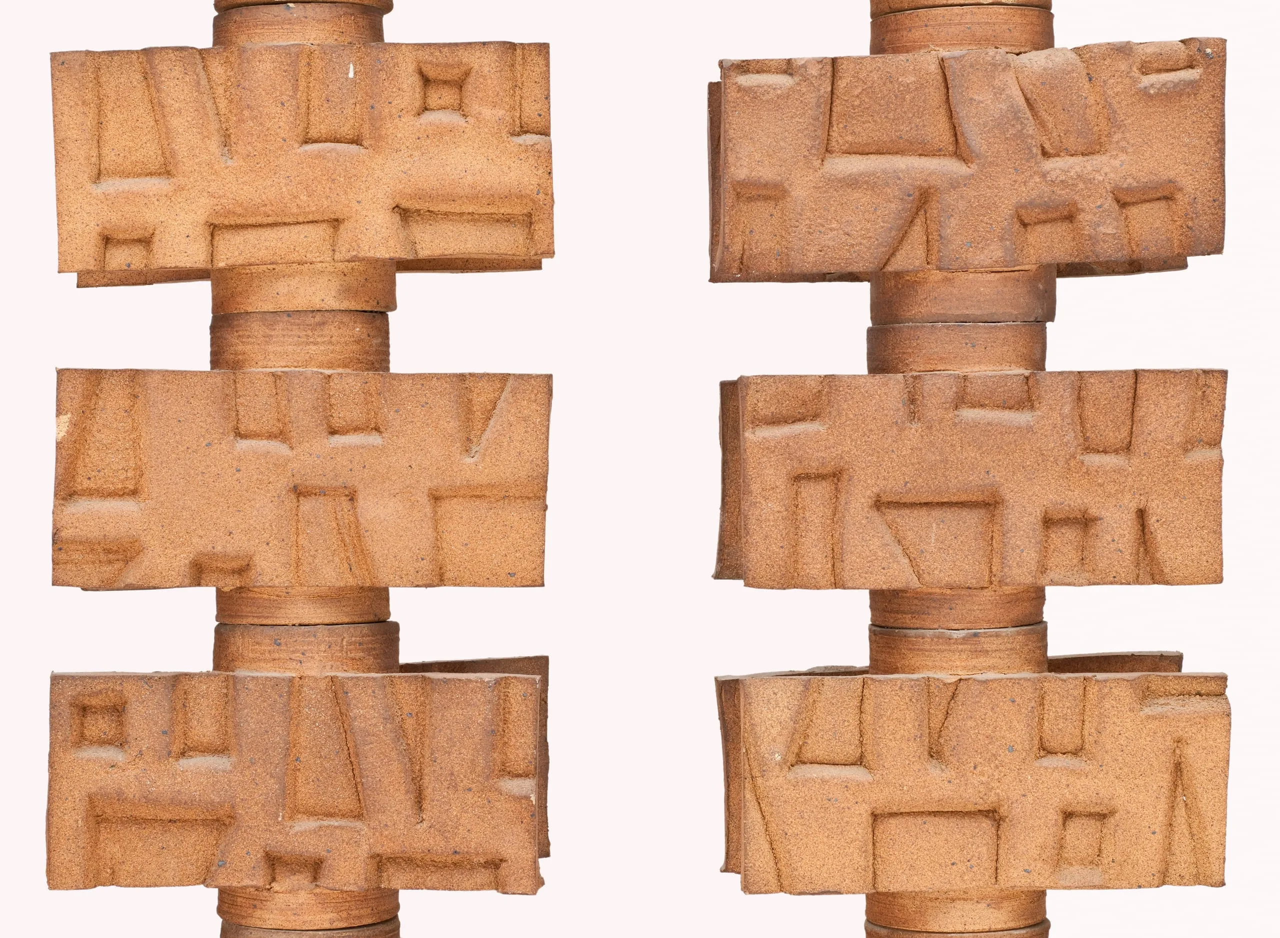 David Cressey introduced textured, hand-finished ceramics to Architectural Pottery’s repertoire, working first as the company’s artist-in-residence and then as head of its Pro-Artisan Division. This screen wall was part of his first collection, and although the design was offered in the company catalogue for many years, these glyphs come from the only known commission. To create the tiles, a slab of clay was pressed in a mold and cut. According to the catalogue, each piece would then have “a different relief pattern, no two precisely the same, all harmoniously related.”