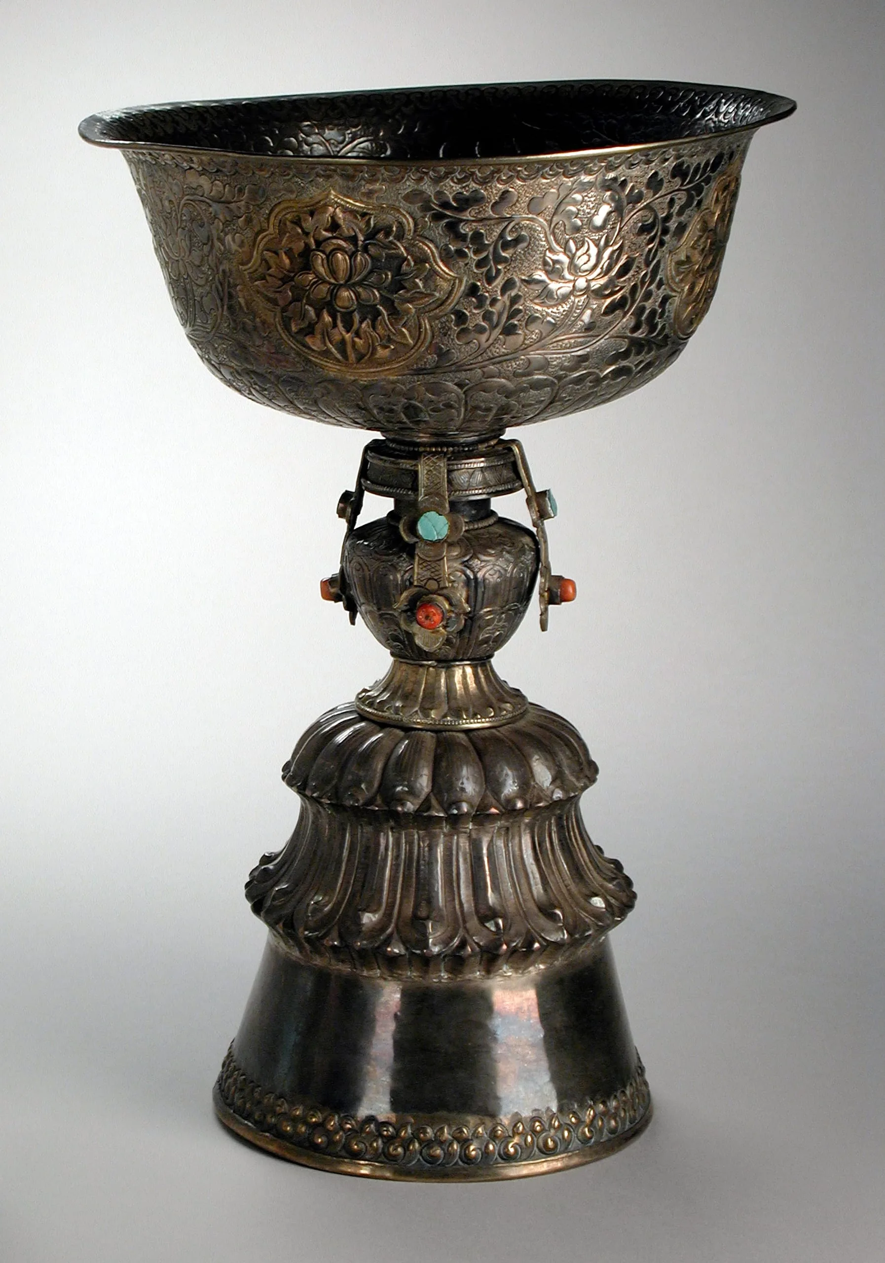 The butter lamps are made in three sections. The wide bowl on the top is embellished with exquisite repoussé lotuses with scrolling foliage and gilded lotuses in lobed cartouches. It has lotus petals encircling the bottom. The middle section is the Vase of Immortality (Tshe-bum; see M.83.2.1a-b) that is associated with Amitayus, the Buddha of Eternal Life (see M.84.32.5 and M.77.19.14). The vase is draped with four pendant banners inset with turquoise and coral. The vessel is supported by a quadripartite flaring pedestal foot. The connecting shoulders and upper two tiers of the base are bands of lotus petals.