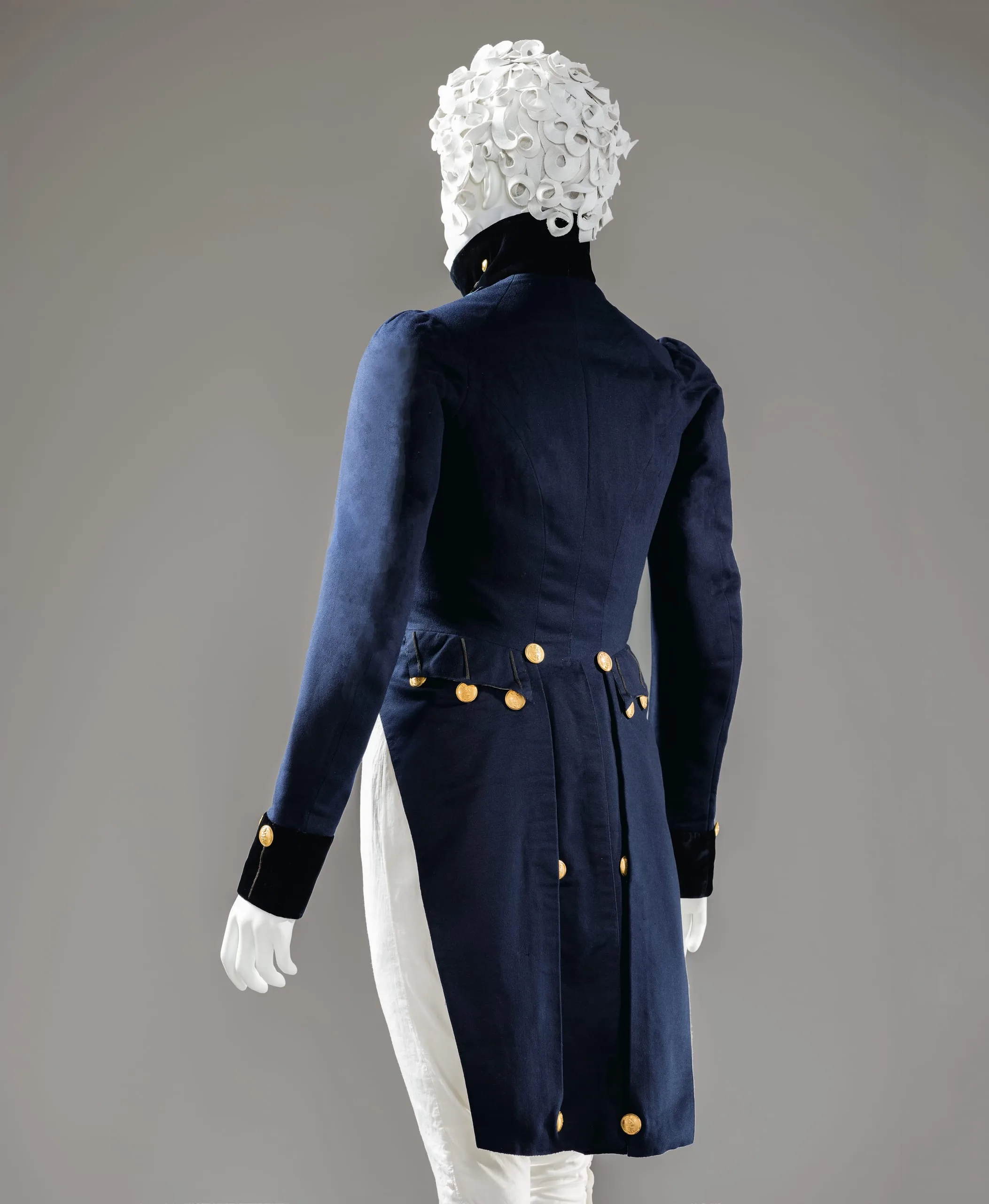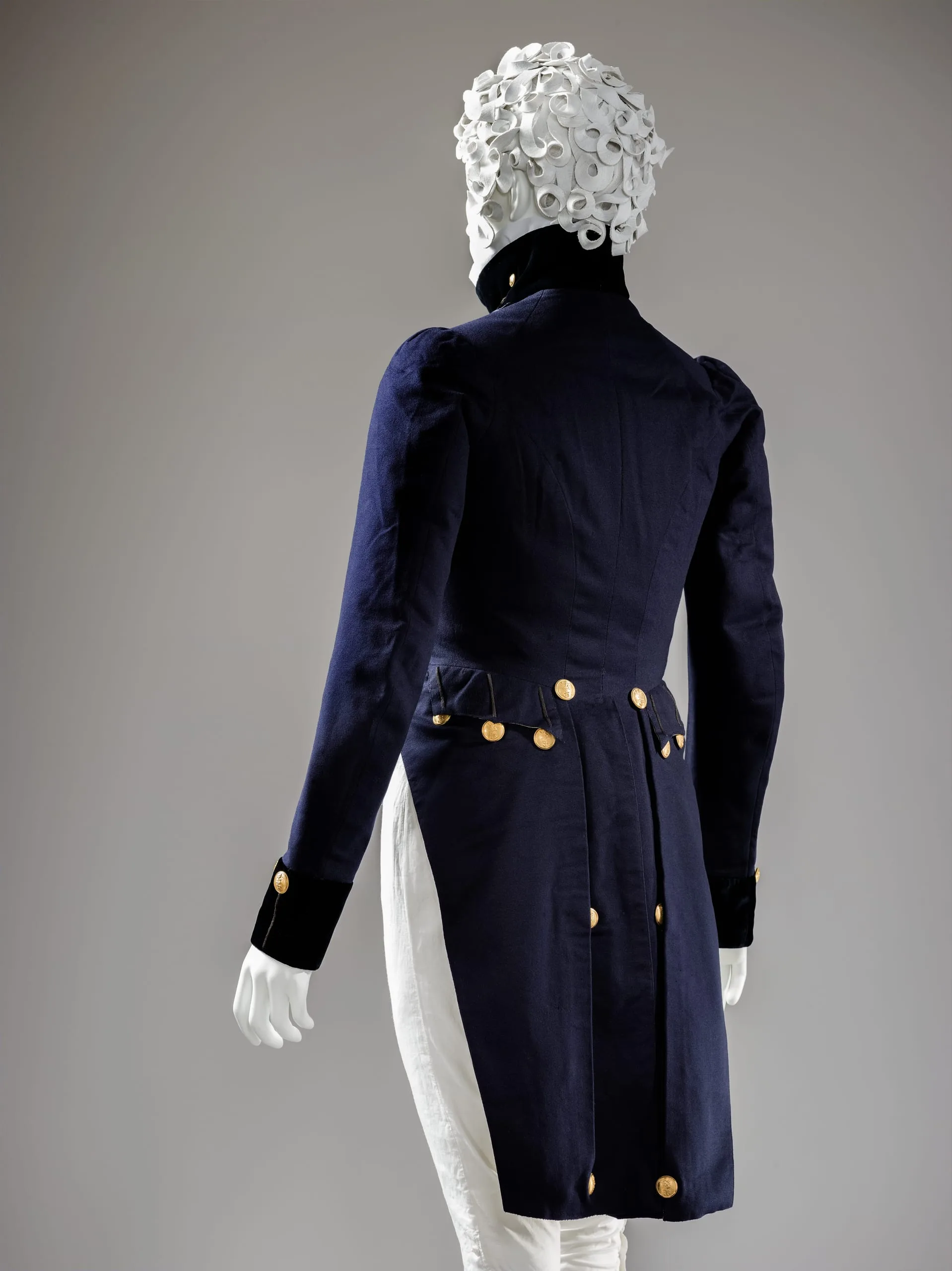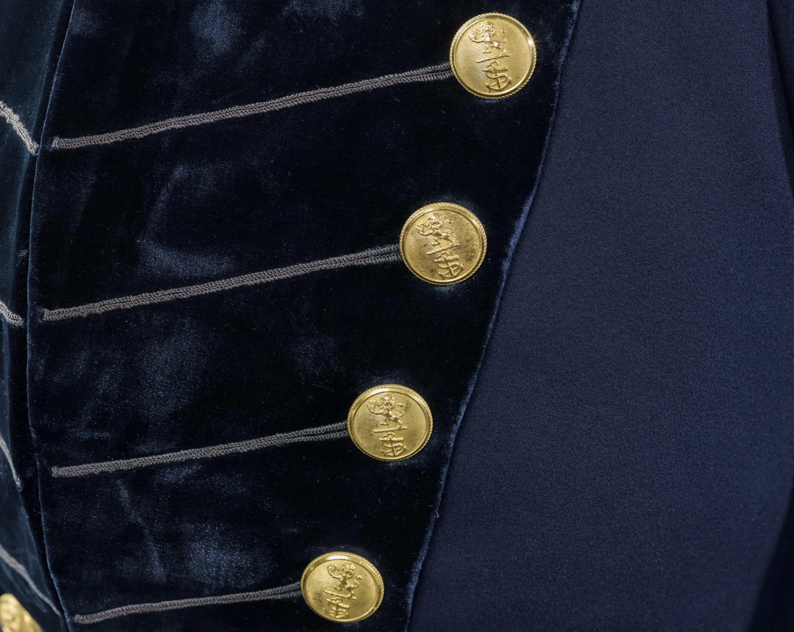 - Wool plain weave, full finish, and silk velvet with wool braid trim and metallic buttons