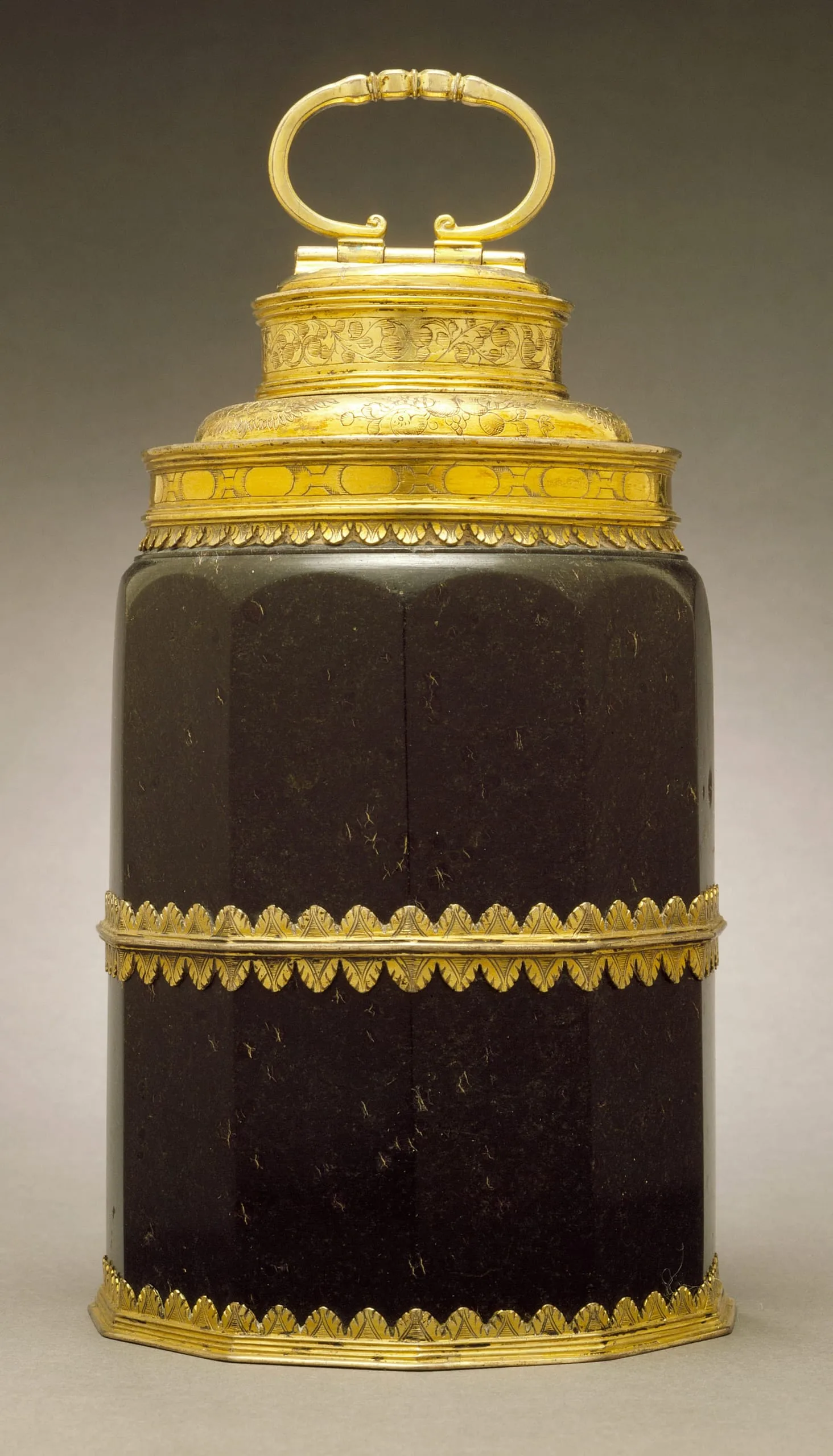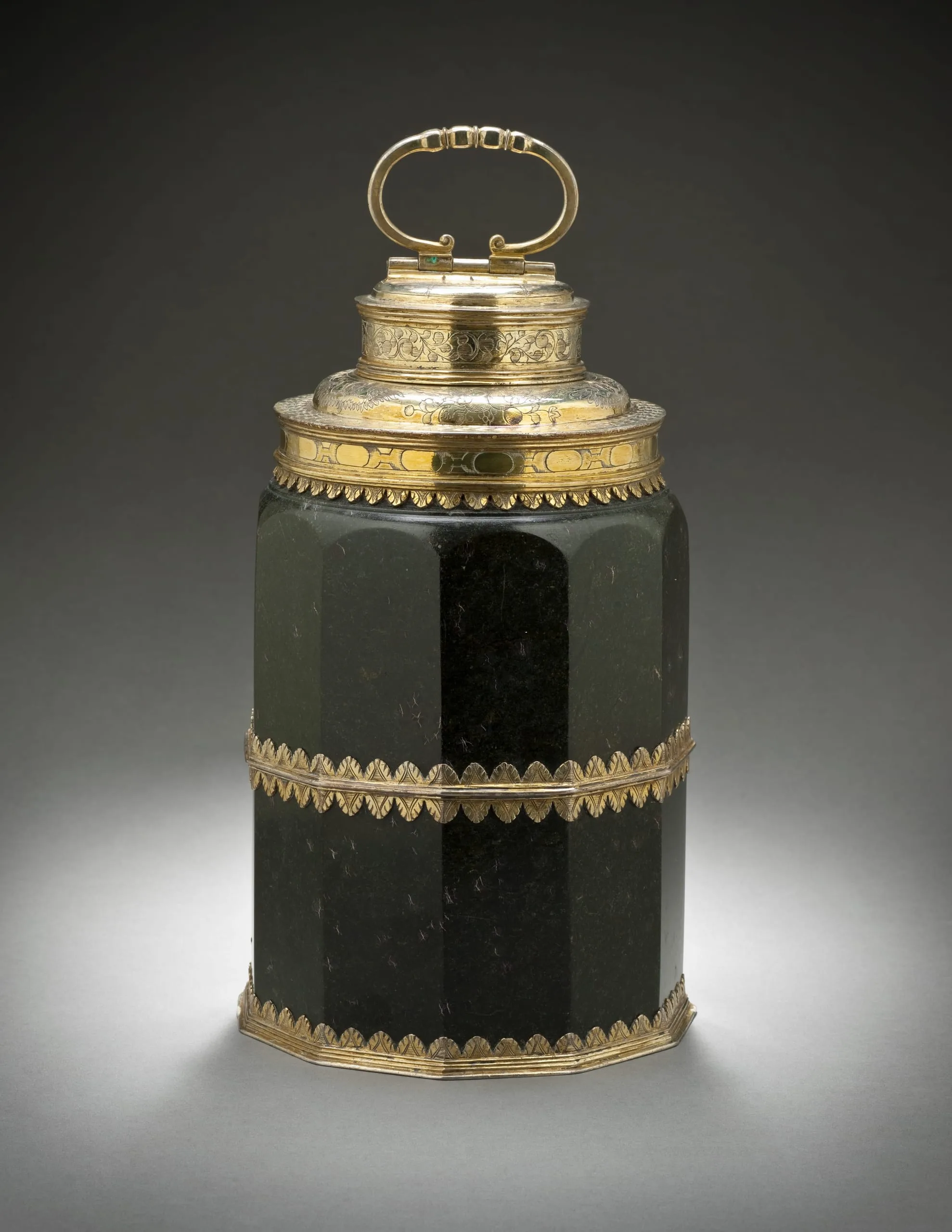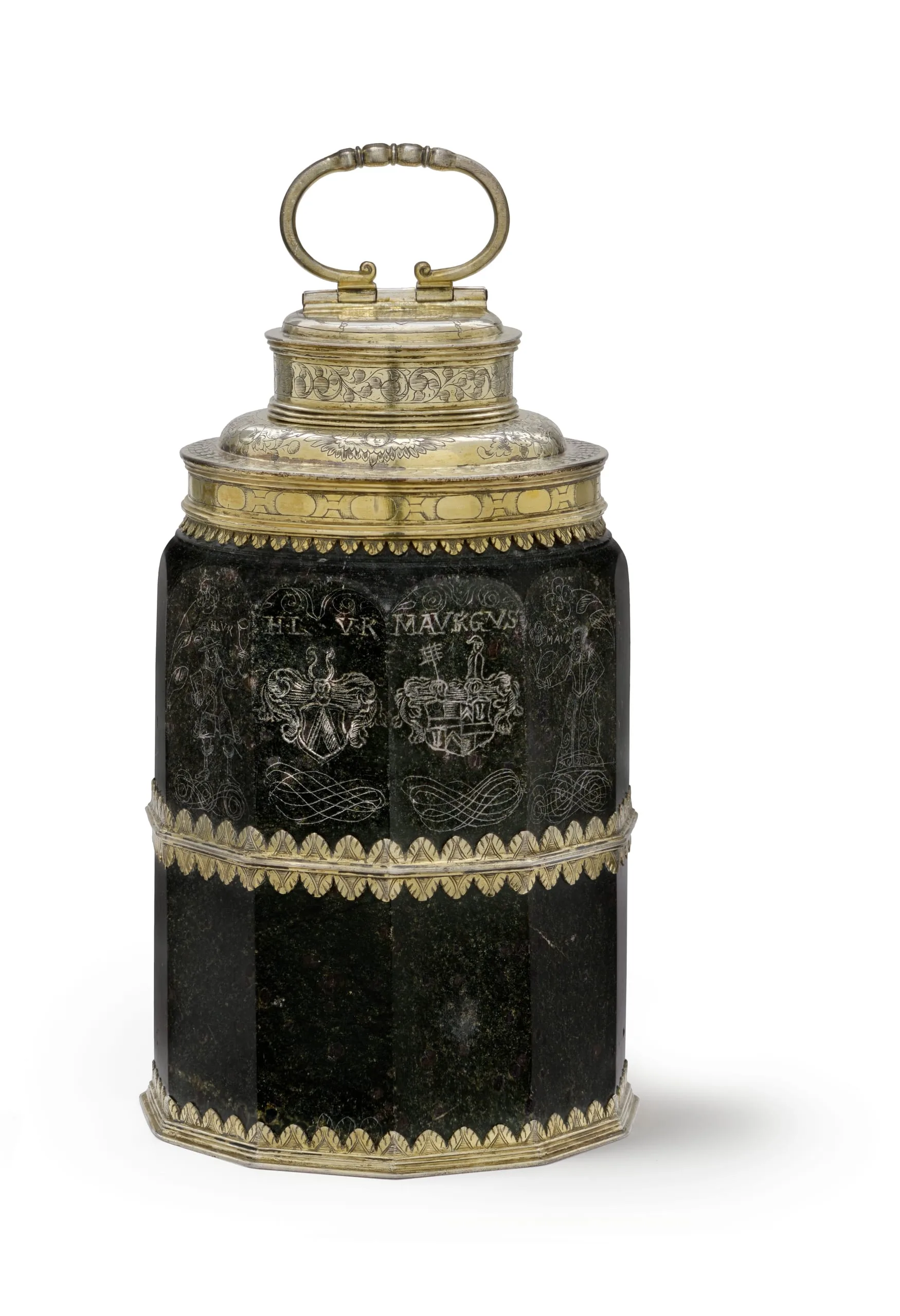 - Green serpentine stone and silver mounts with gilding