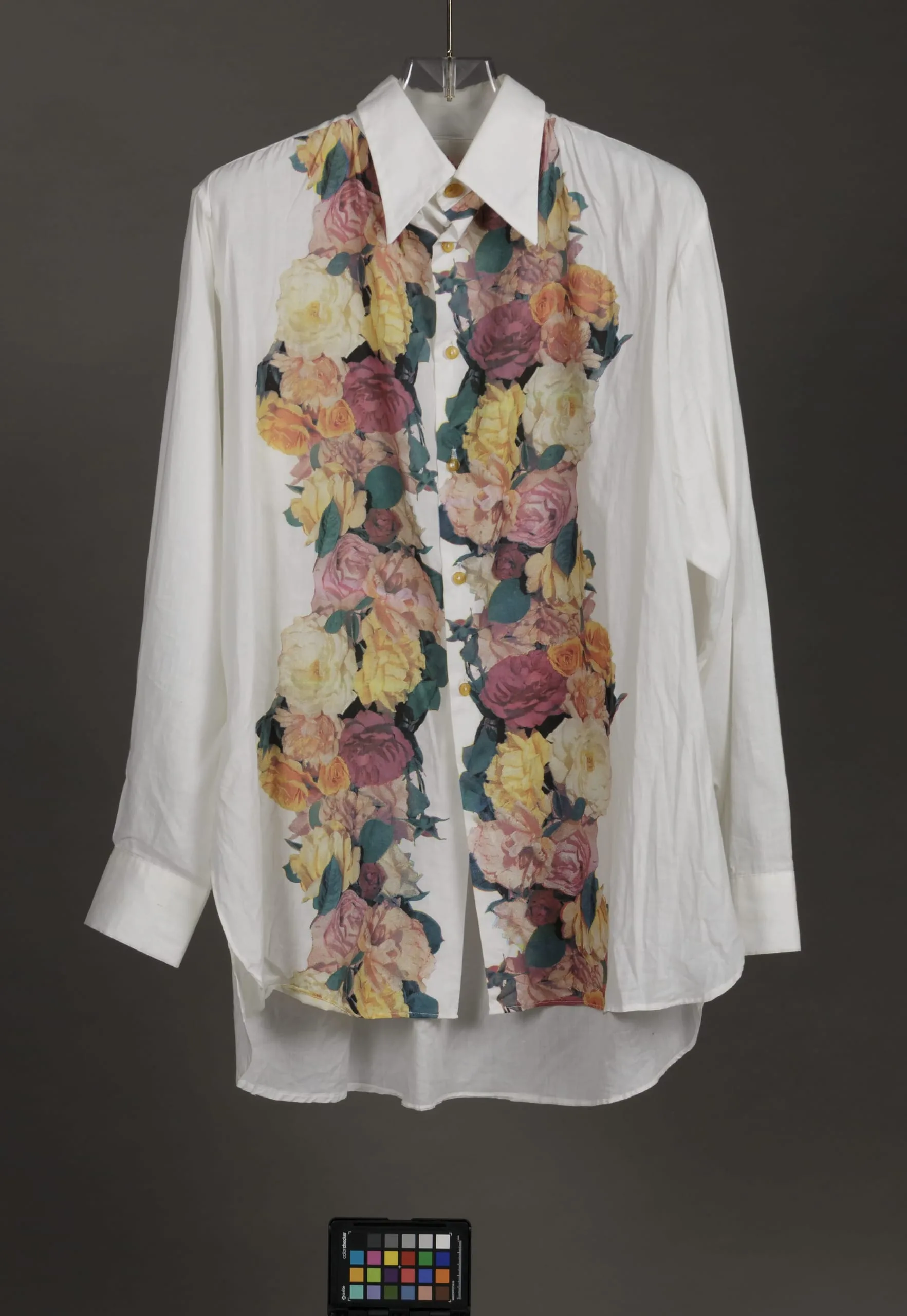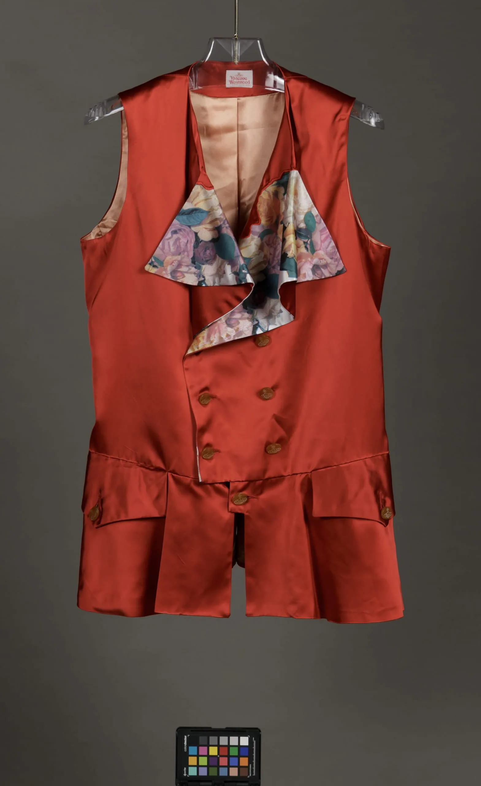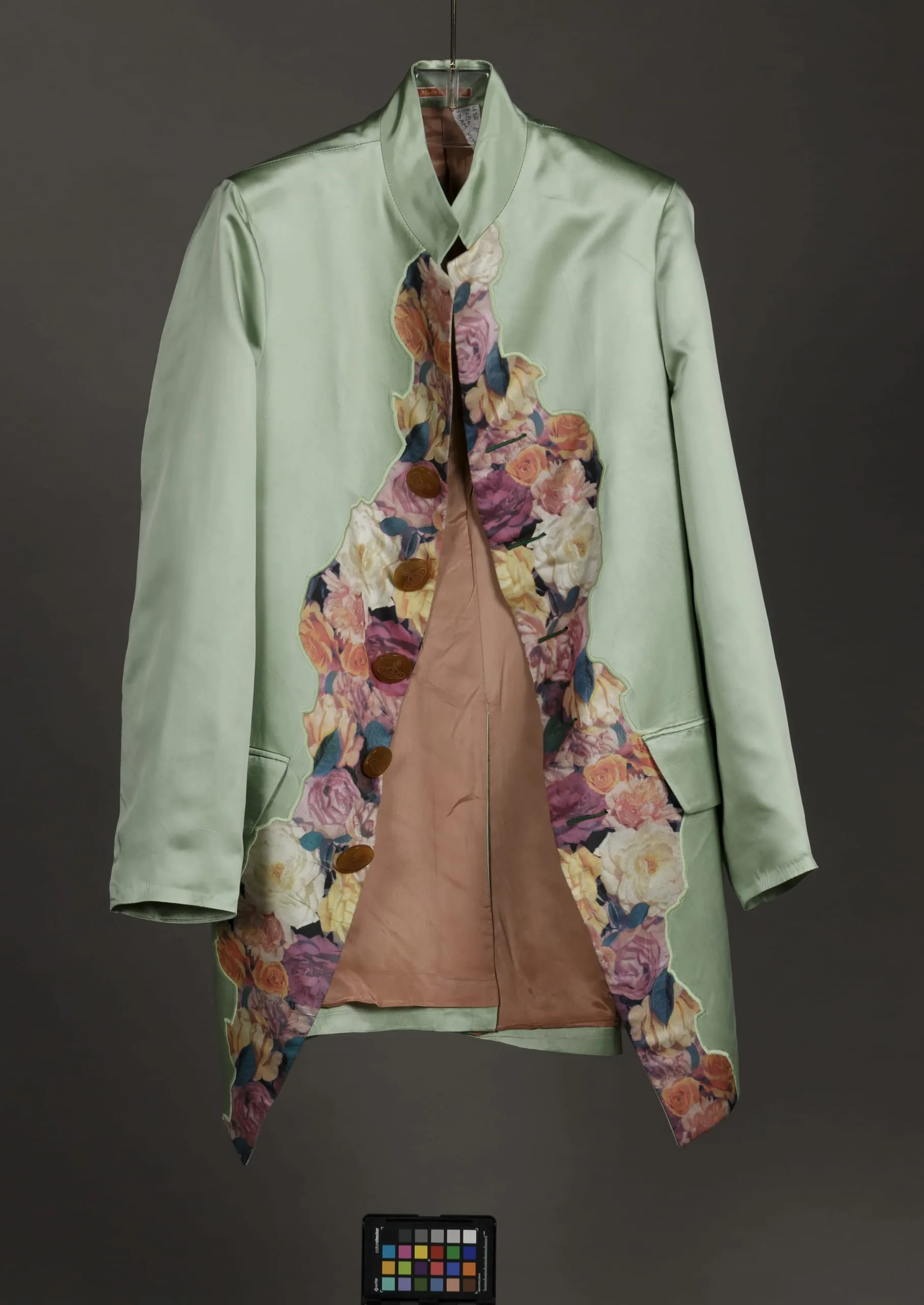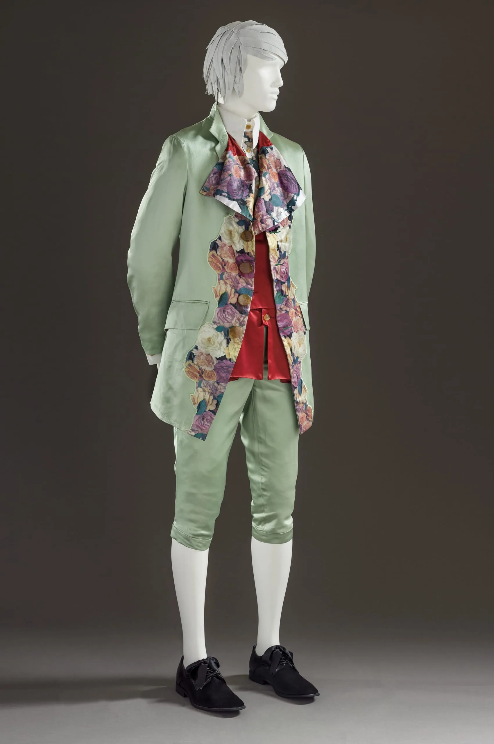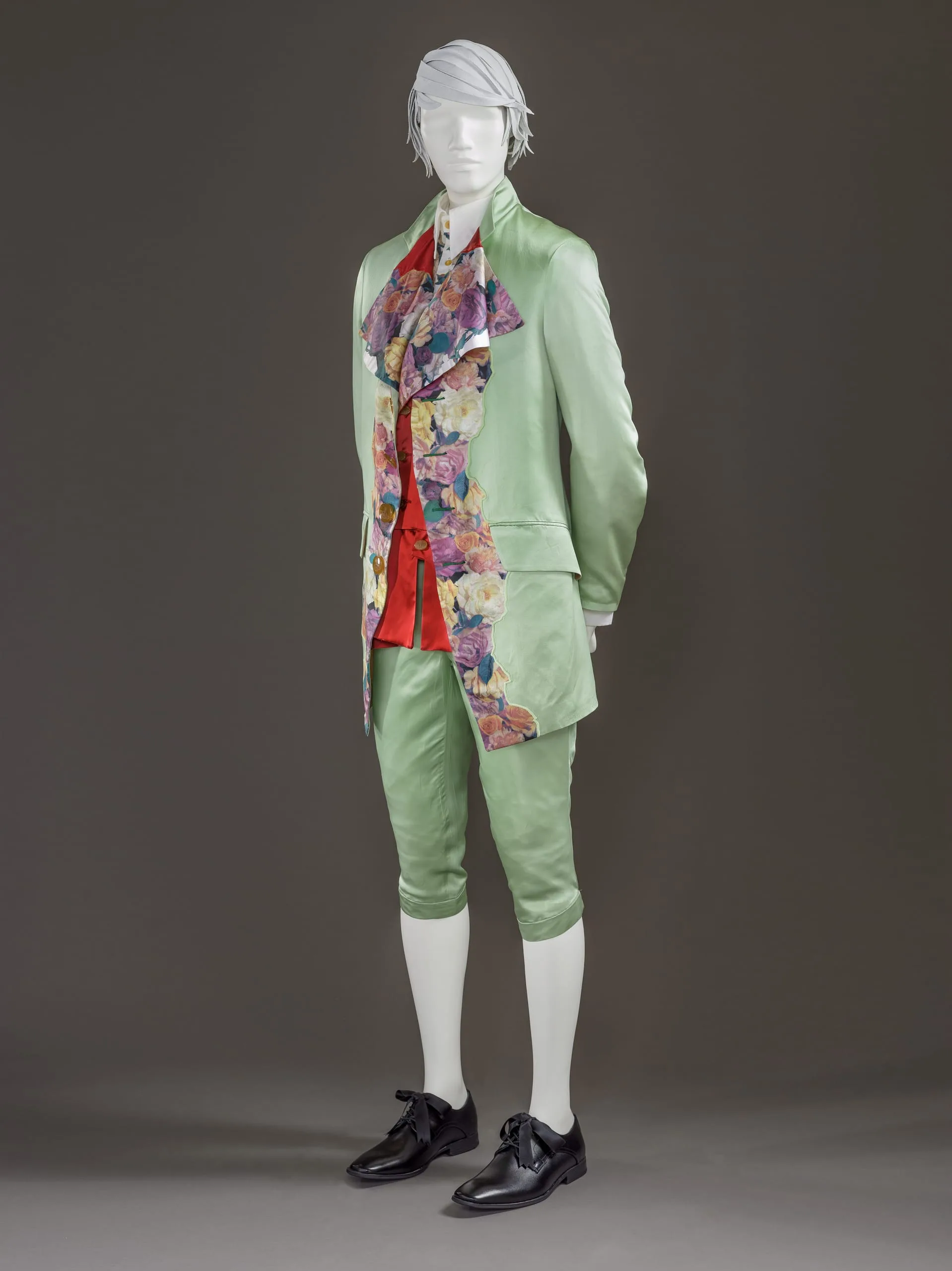 - Jacket and Waistcoat: acetate satin, printed; Breeches: acetate satin; Shirt: cotton plain weave, printed