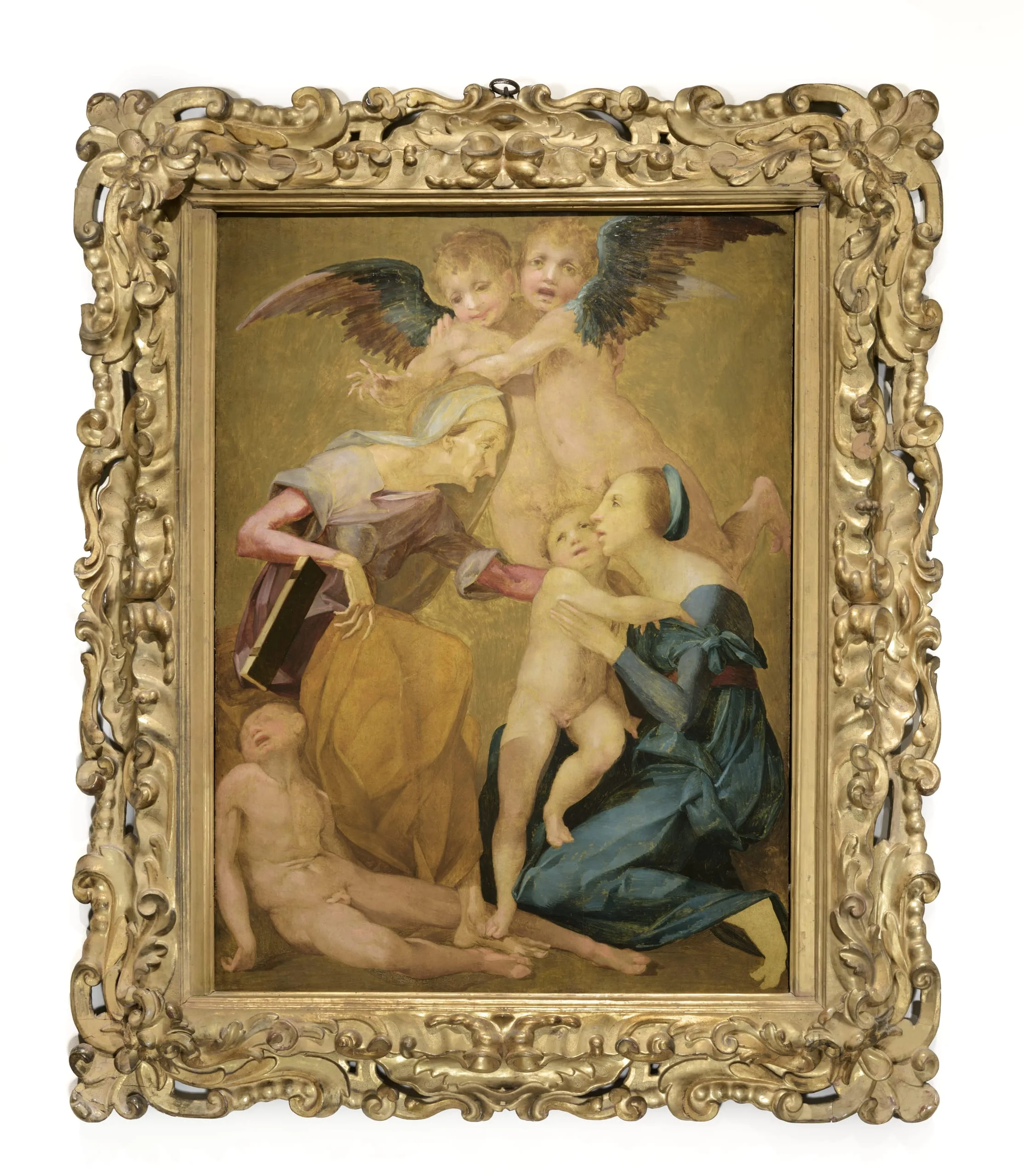 The subject of this unfinished painting is still unknown. The woman in blue at the right is the Virgin; she holds the frightened Christ Child in her arms. At the left the young Saint John the Baptist reclines in a troubled sleep and almost appears to be dead. The identity of the old woman at the left is unclear. She may be Saint Anne (mother of the Virgin), Saint Elizabeth (mother of John the Baptist), or a Sibyl from classical mythology who foretold the future. This haunting image is one of the museum's masterpieces.