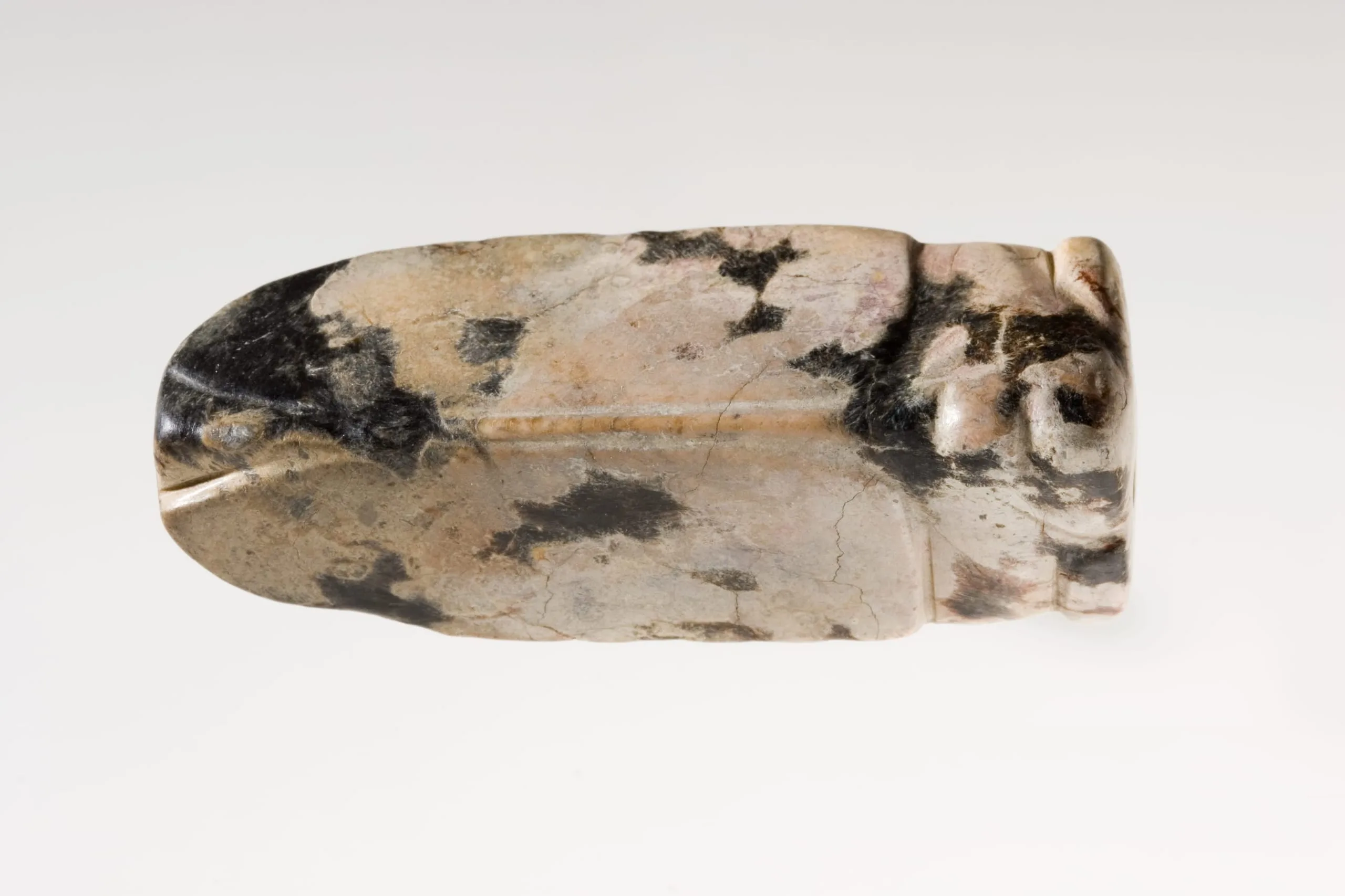 Polished stone object, possibly jade, with elongated blade-like form tapering to a point at one end and a carved scroll-relief terminal at the other, cream and black mottled surface