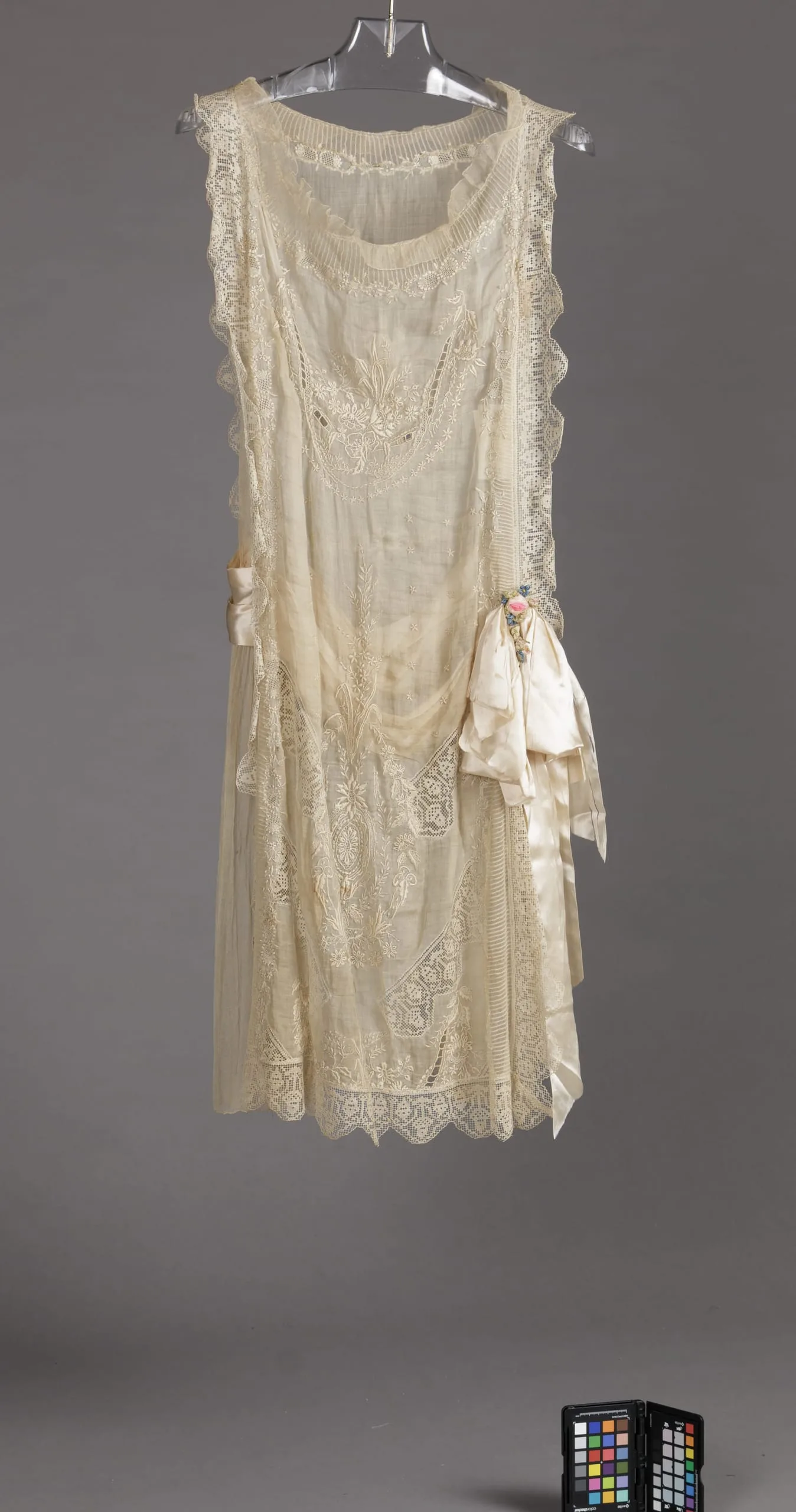 - Linen plain weave with cotton embroidery, linen lace, silk net, and silk satin ribbon