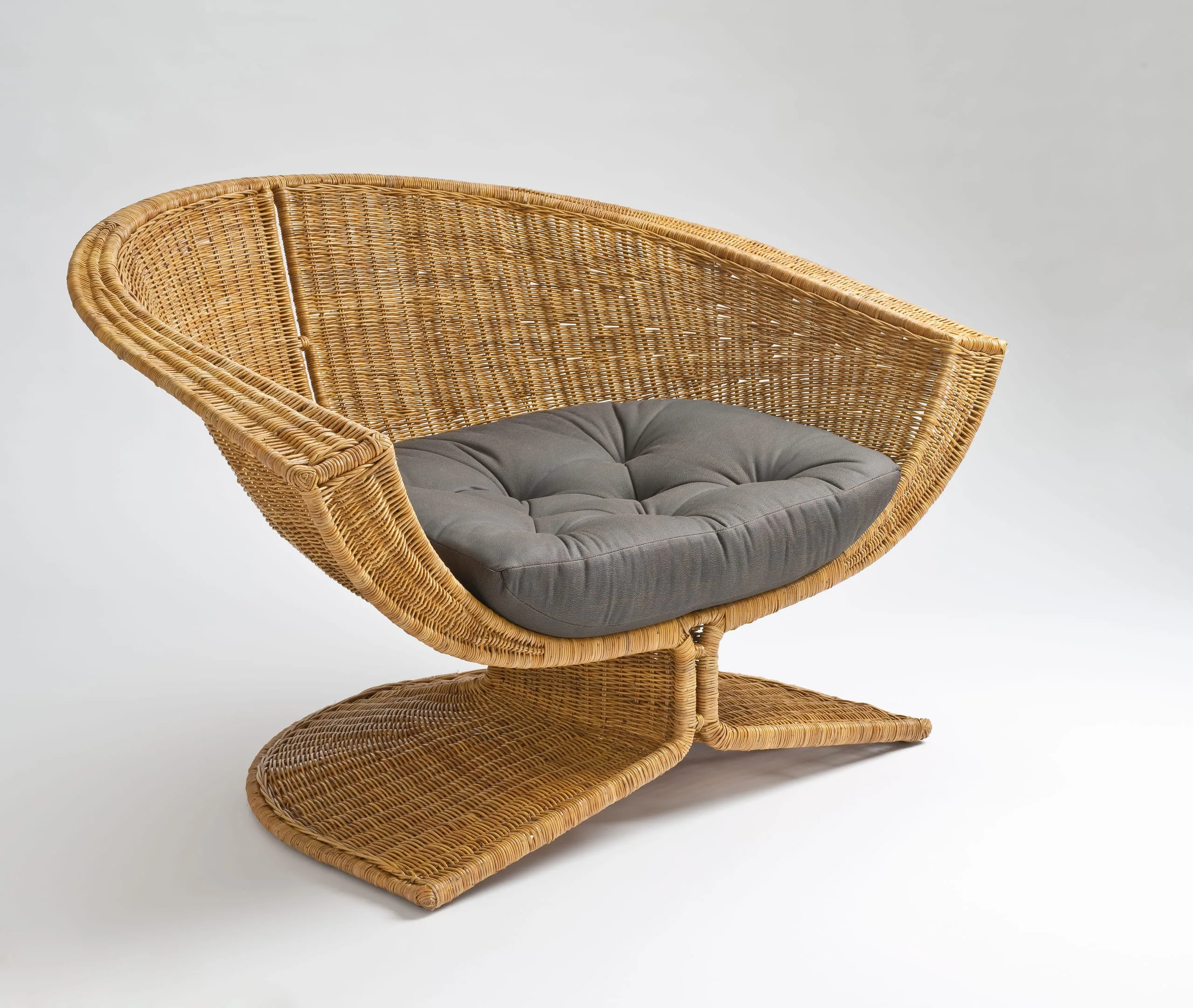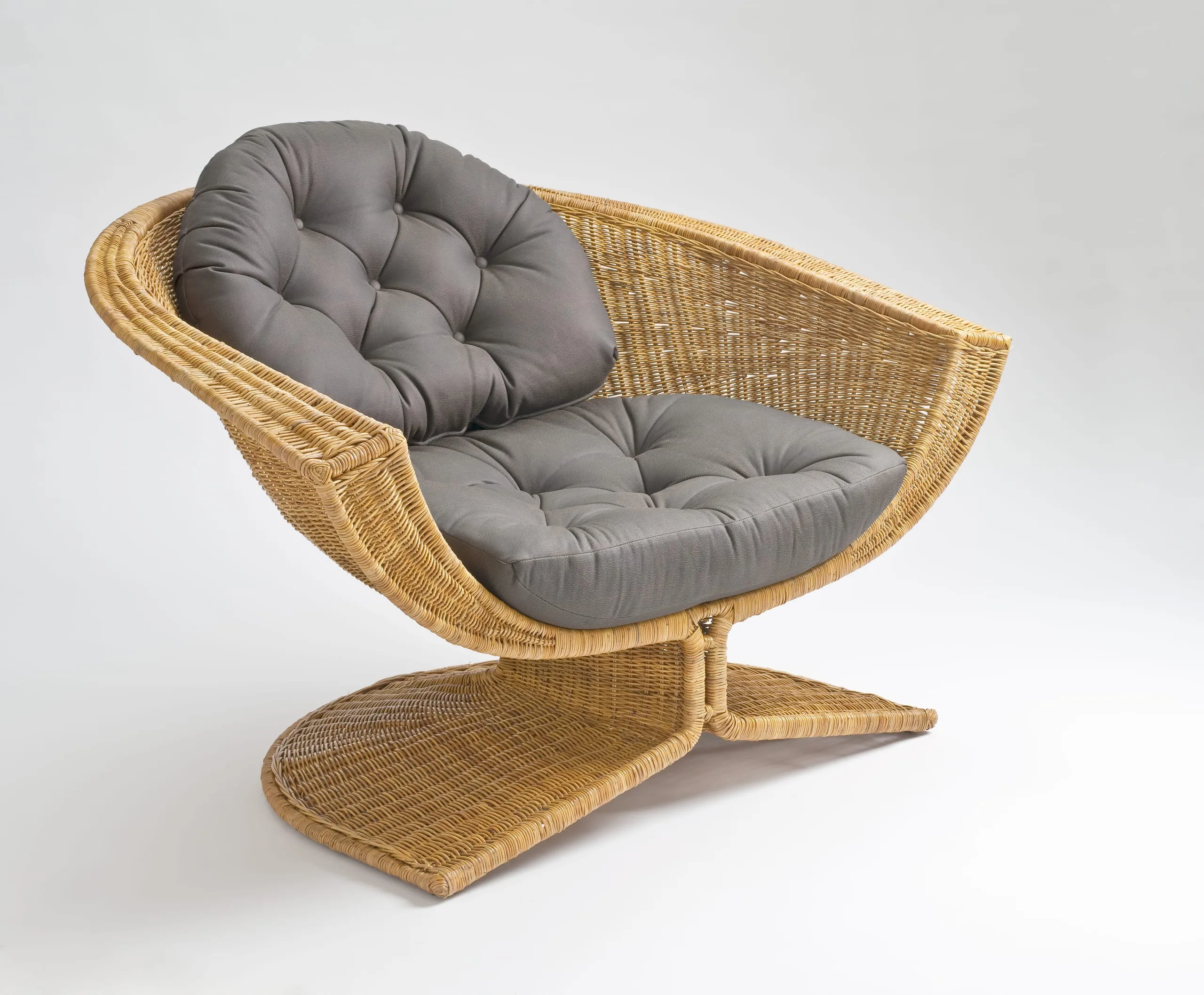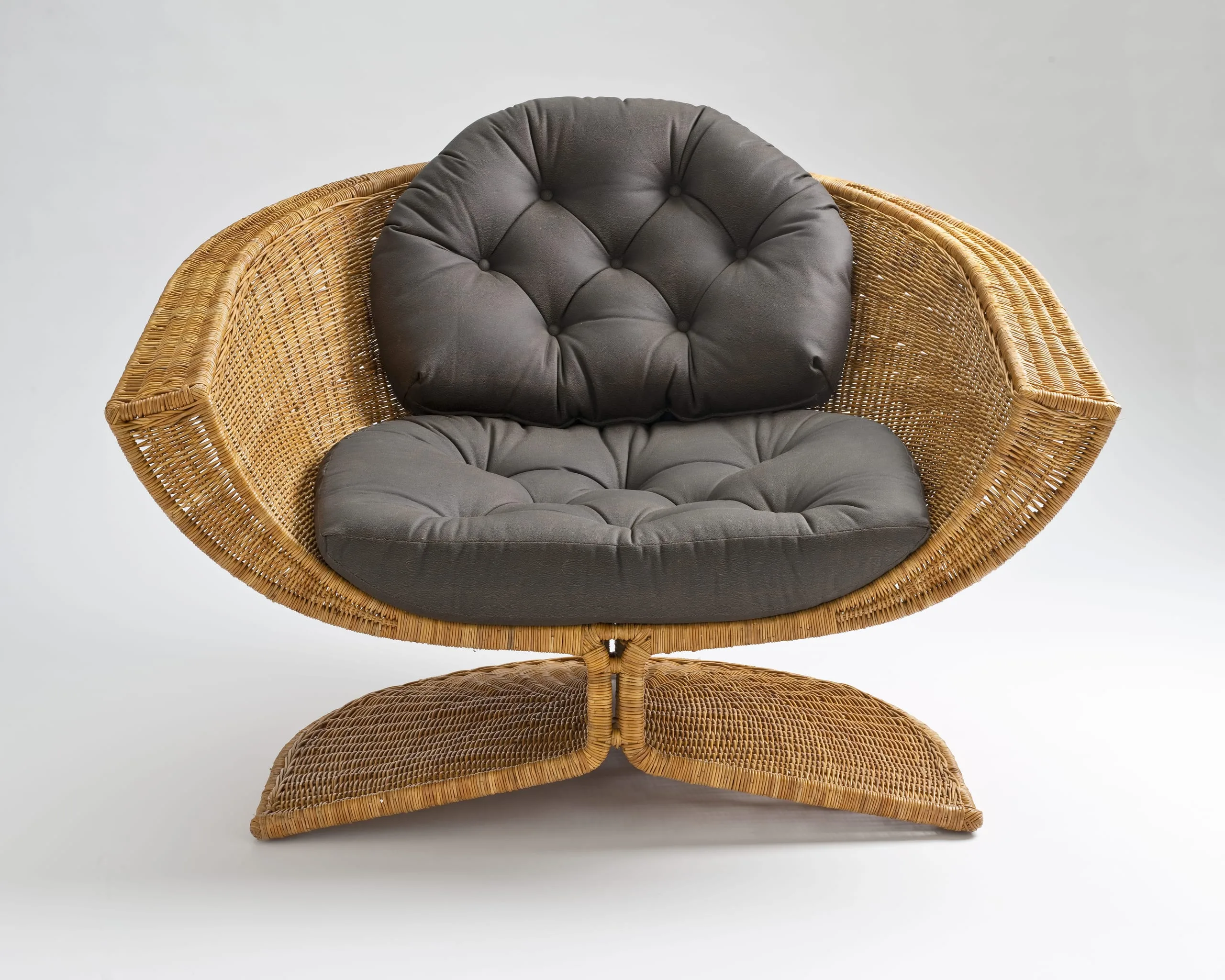 Following in the footsteps of his father, Danny Ho Fong, Miller Fong used wrought-iron frames to shape rattan into light, modern furniture. He was still in his twenties when he designed the Lotus chair, which was displayed in California Design 10. The pleasing curves of the chair, which the Los Angeles Times called “a seductive well of comfort,” earned it a prominent place in the publicity for the exhibition.