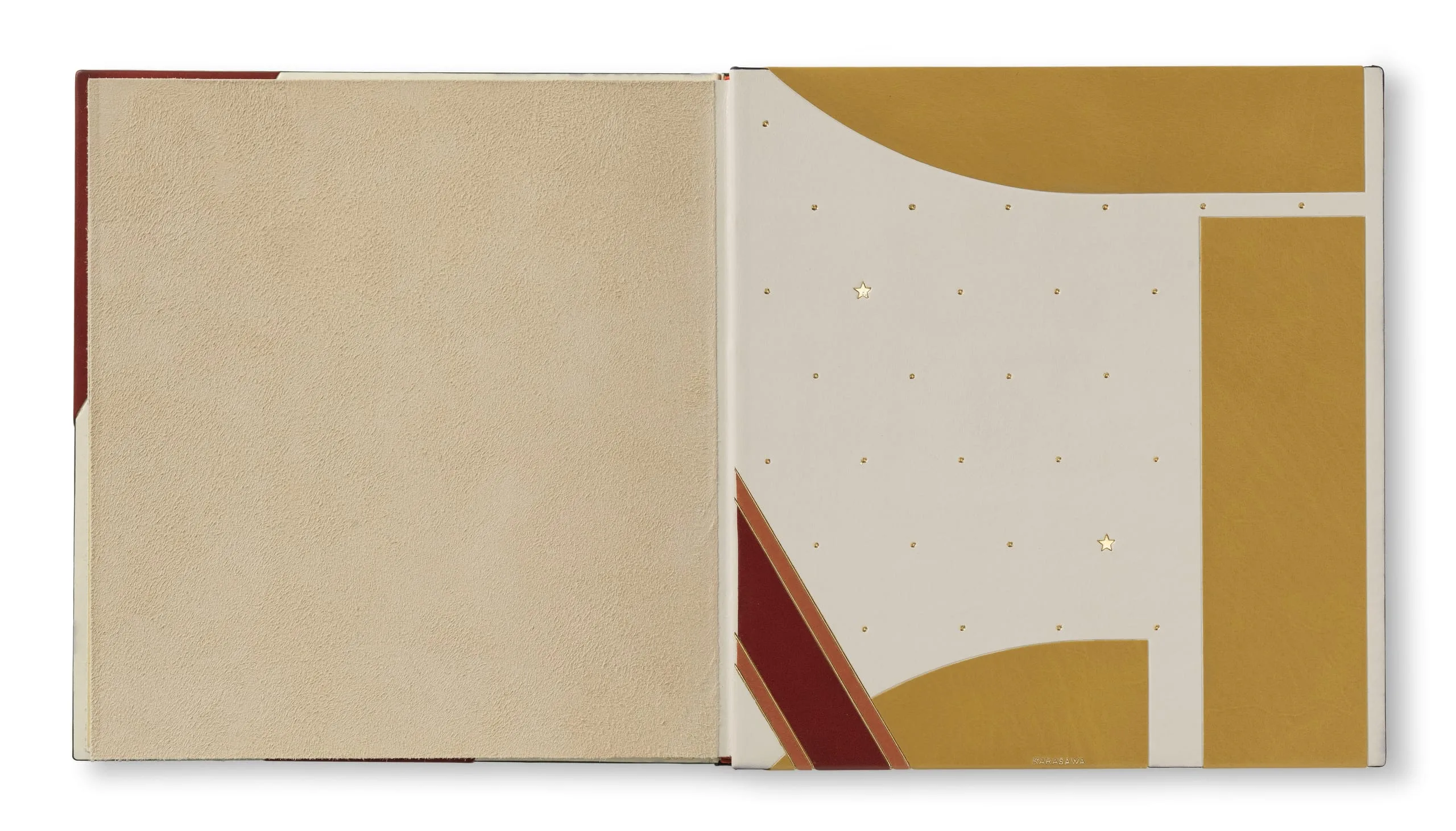 - Hardcover book with double binding and slipcase; book of black leather with on-lays of olive green, pink, red and beige leathers, gold tooling; slipcase: paper and black leather; secondary cover (chemise); frontispiece: wood engraving with hand coloring