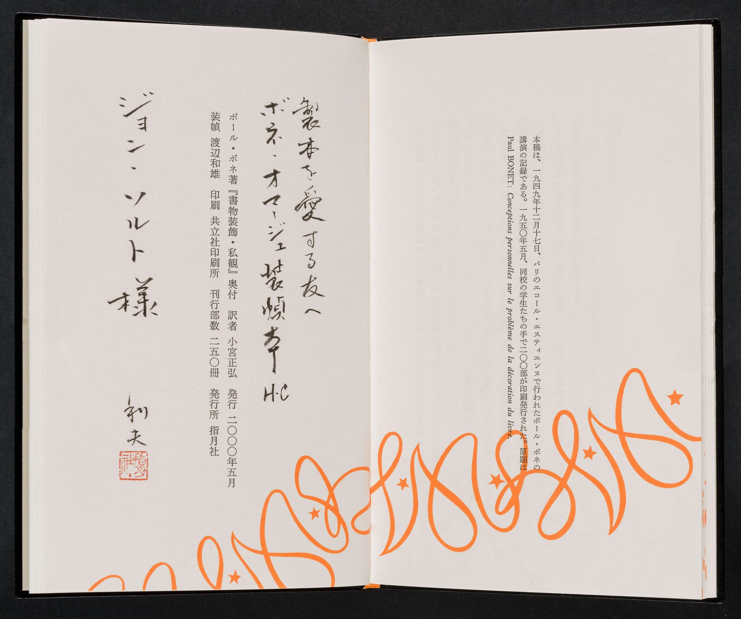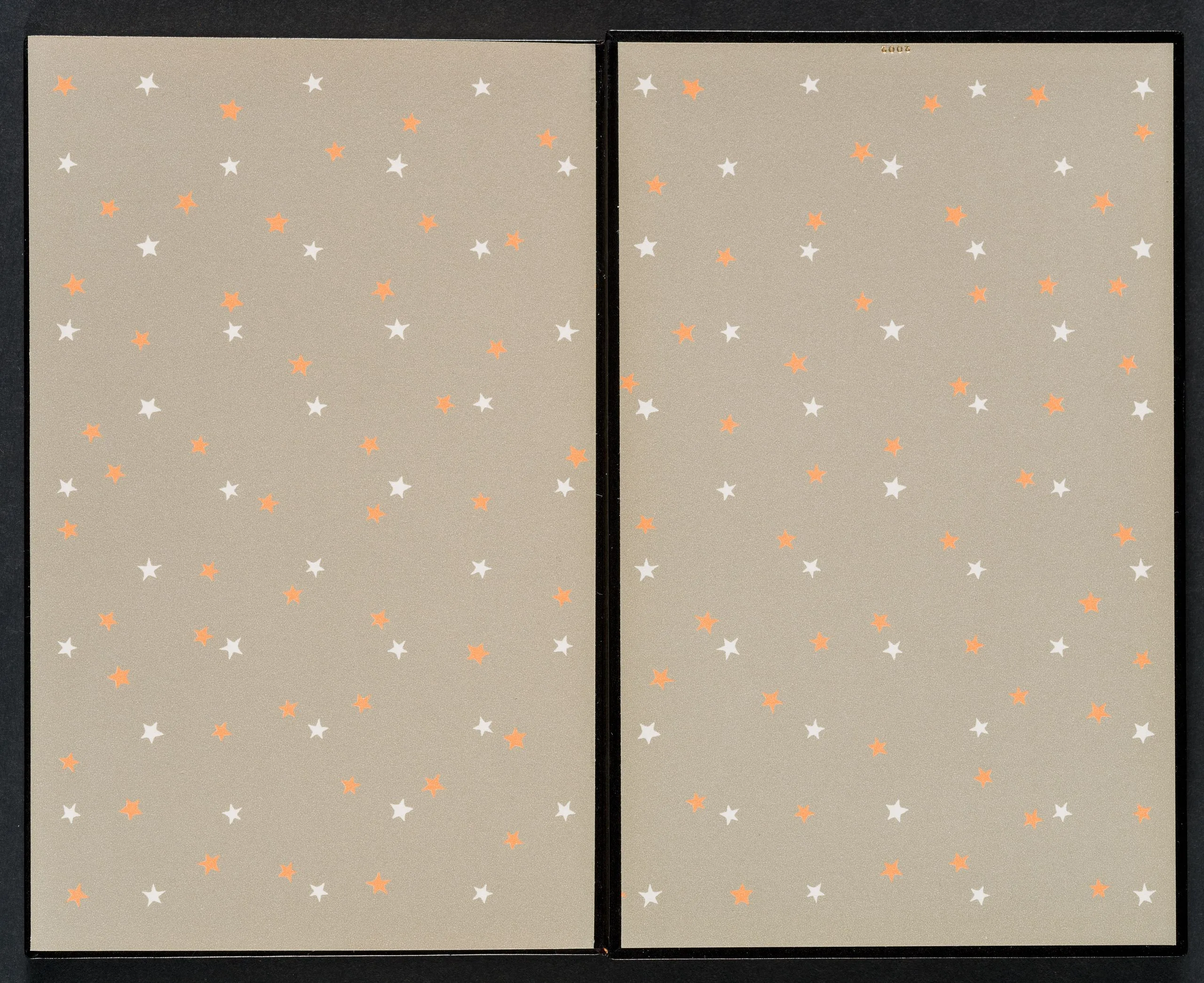 - Hardcover book with box; book of dark blue leather with on-lays of red and blue leathers; gold tooling; end-sheets paper printed with star pattern; dark blue buckram box with suede lining