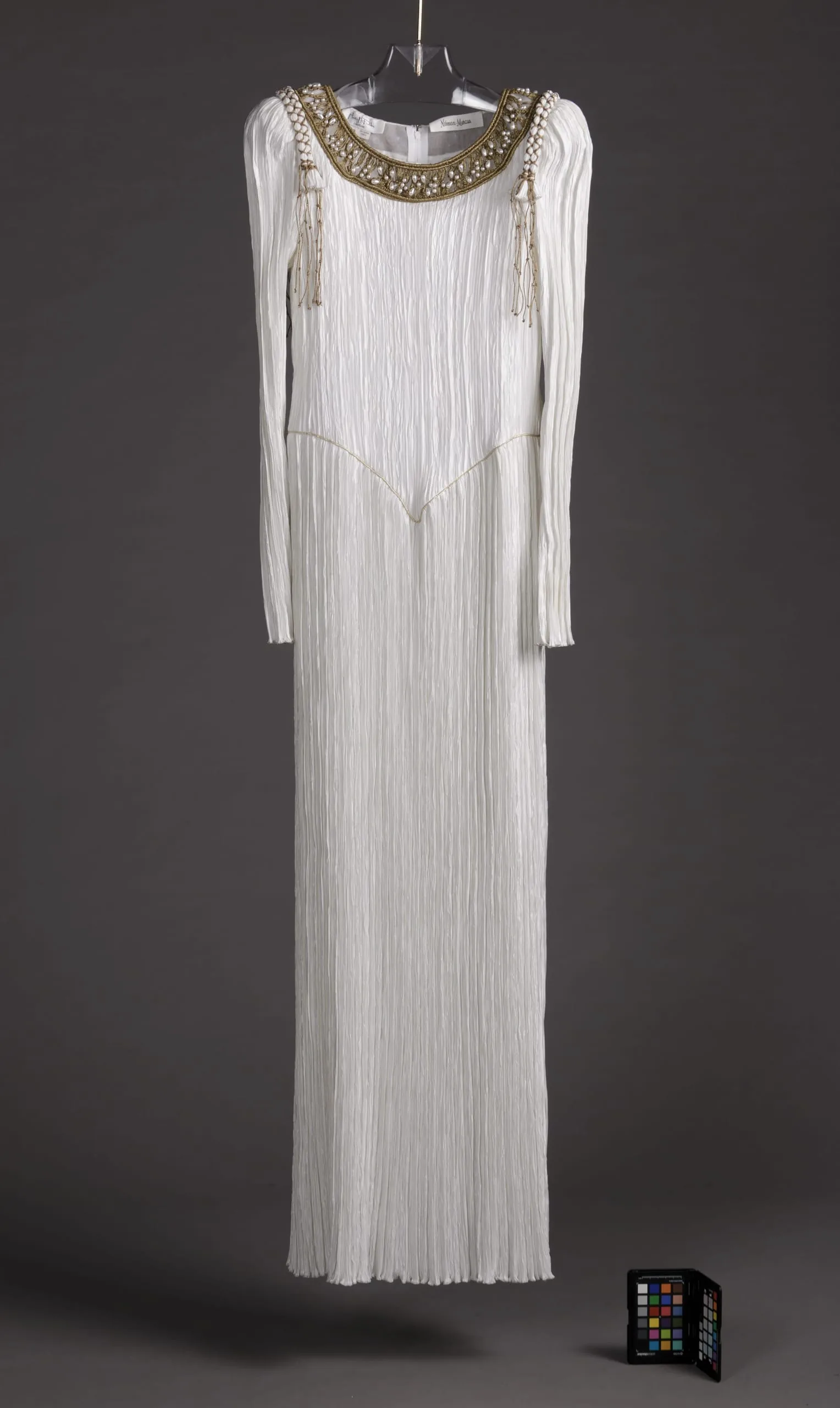 - Polyester twill with heat-set pleats, metallic cord, faux pearl beads