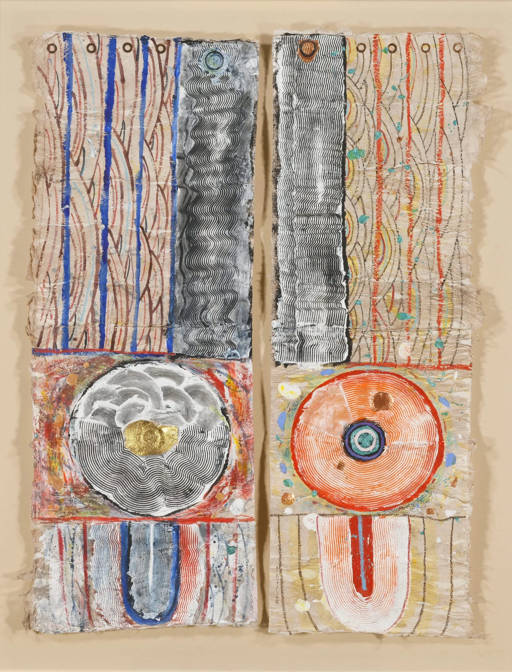 - Mixed media, acrylic on handmade paper, and gold leaf