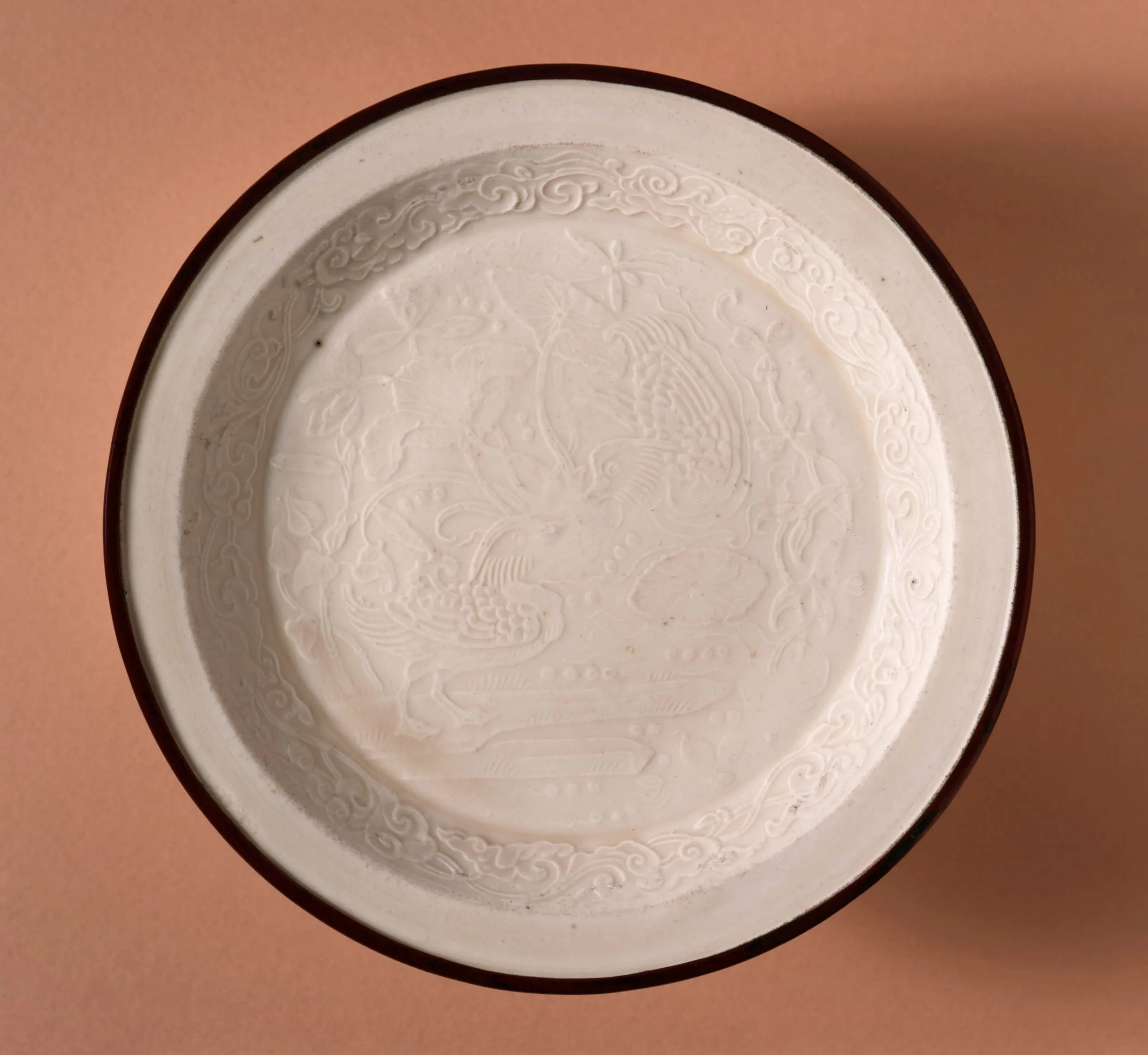 - Ding ware, molded stoneware with impressed decoration, transparent glaze, and banded metal rim