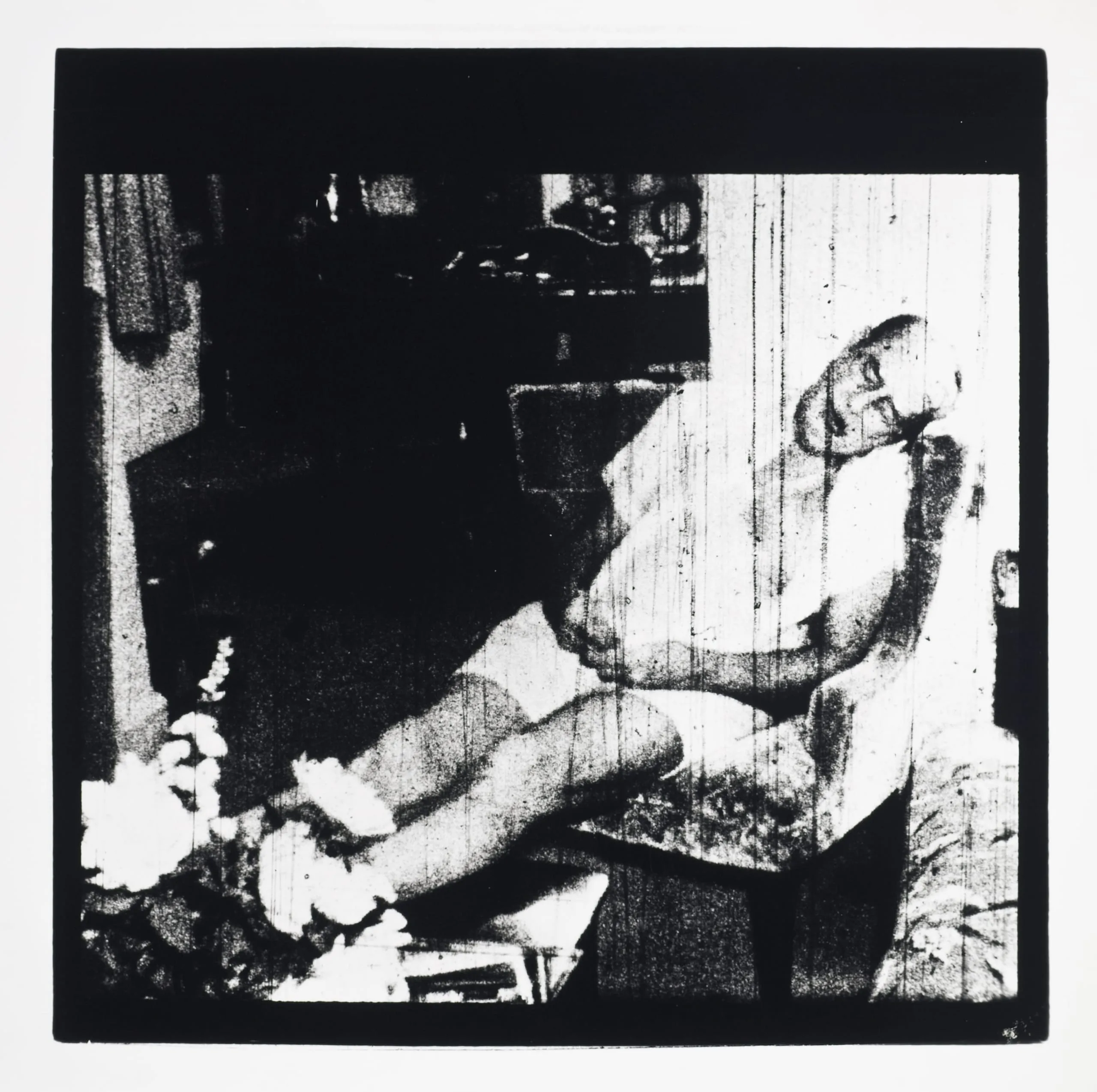 Square screenprint or lithograph, high-contrast black and white, nude figure reclining in a dark interior with white flowers at lower left, bordered by thick black rectangle