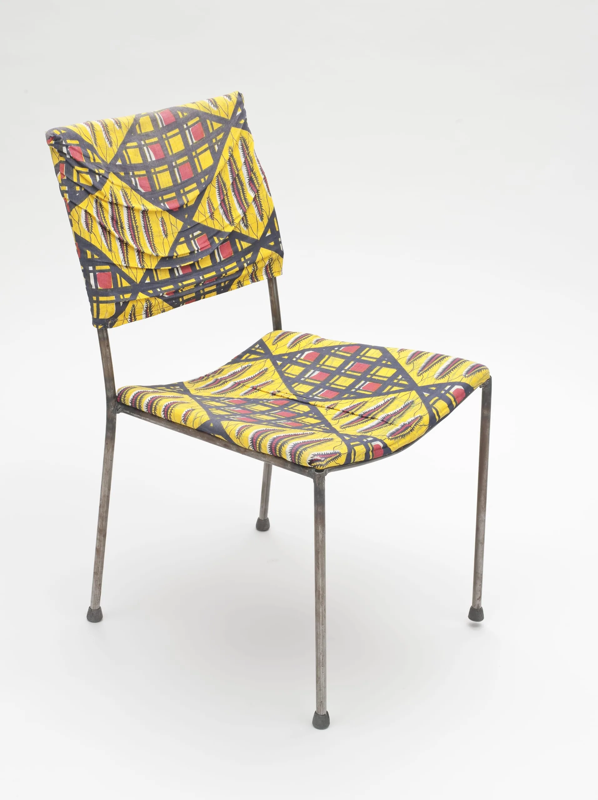 Side chair with slim pewter-gray steel tube frame, seat and back upholstered in bold yellow, charcoal, and red geometric textile pattern