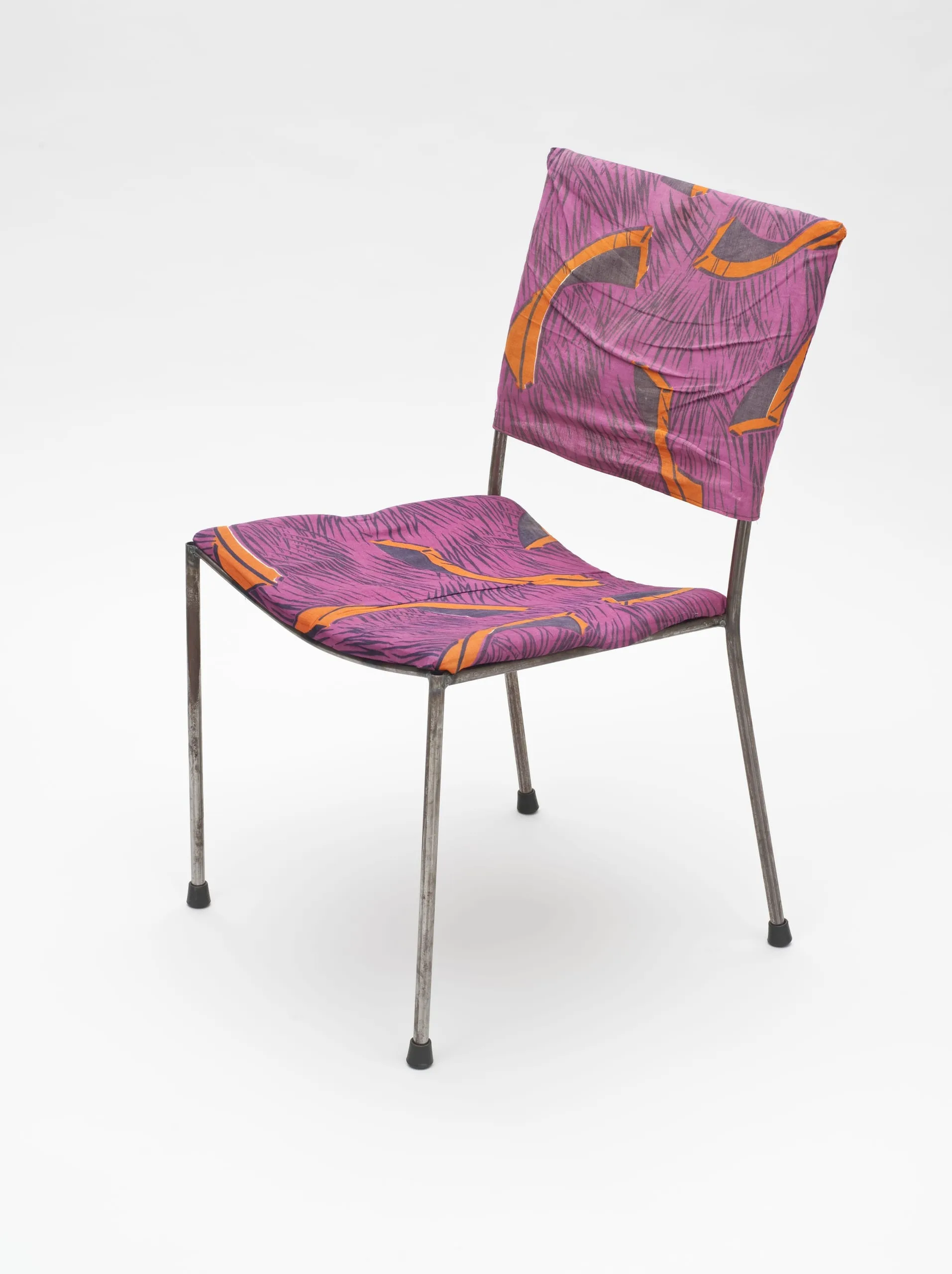Side chair with thin pewter-gray steel rod frame and loosely fitted fabric upholstery in a bold magenta, orange, and gray allover print pattern