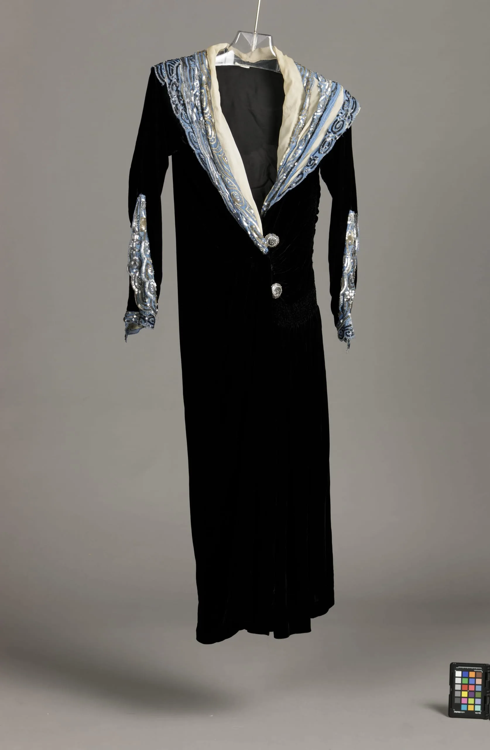 - Silk velvet and silk plain weave (crepe chiffon) with metallic thread embroidery, metal sequins, and crystals