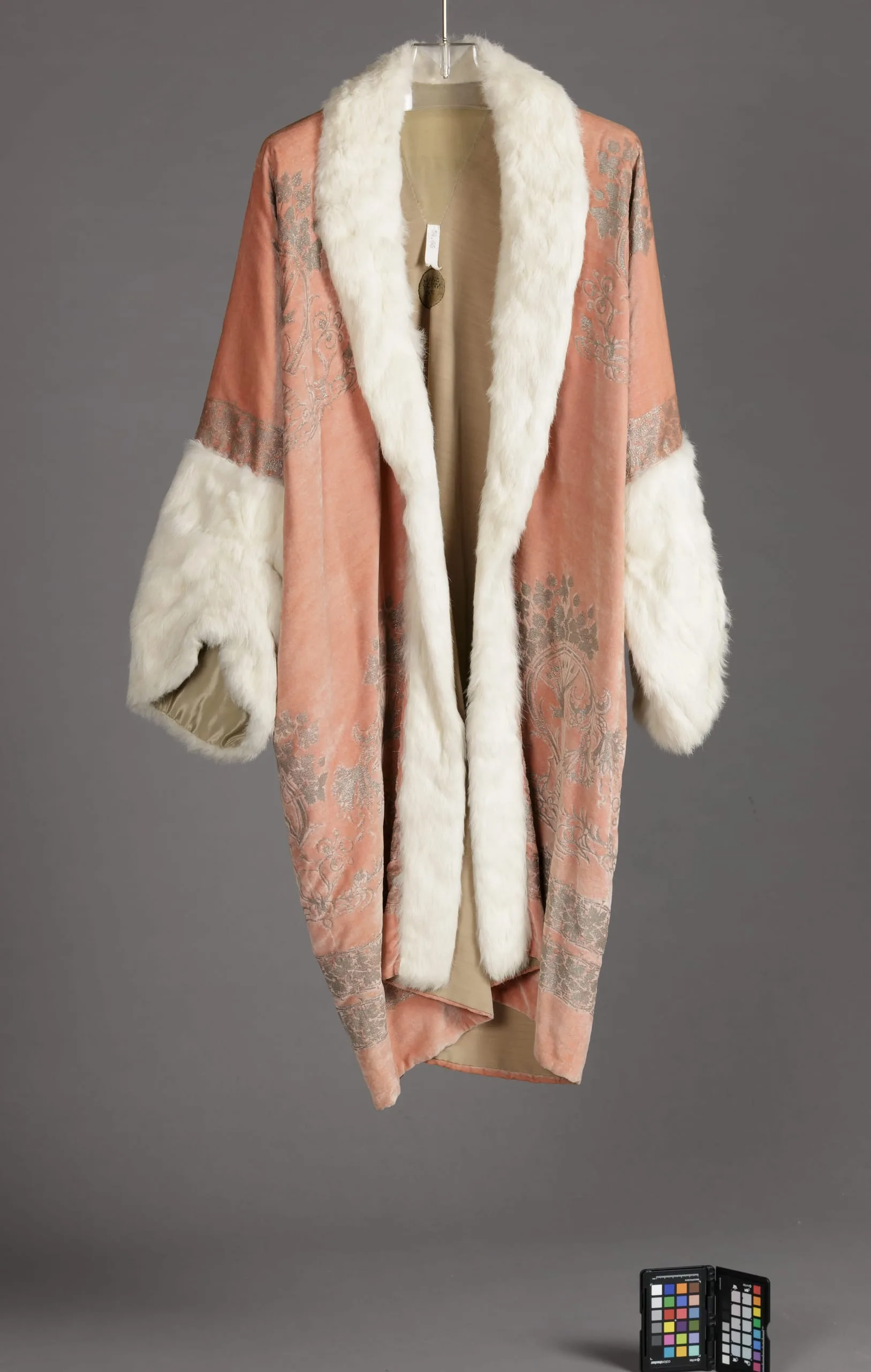 Long open-front coat on a dress form, dusty rose fabric with silver floral pattern, wide white fur lapels and fur cuffs