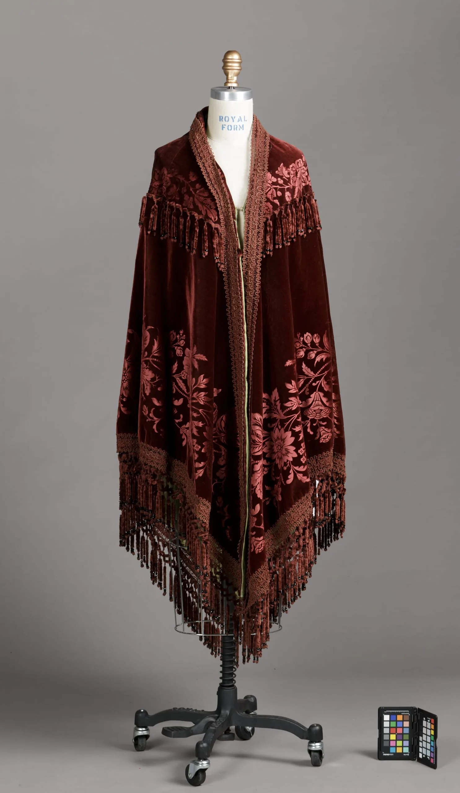 - Silk cut velvet, chenille tassels, silk passementerie, crystal beads