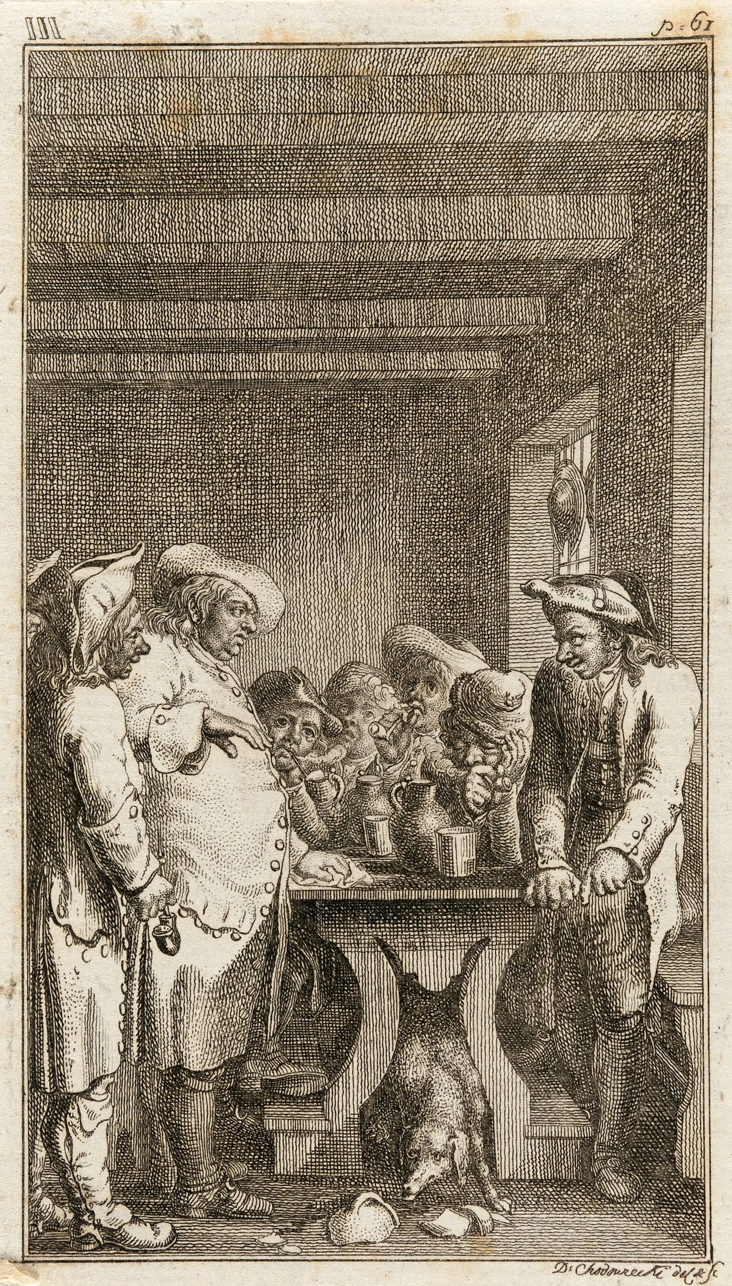 Engraving of seven figures in a low-ceilinged tavern, crowded around a table with tankards, a dog scavenging on the floor in the foreground