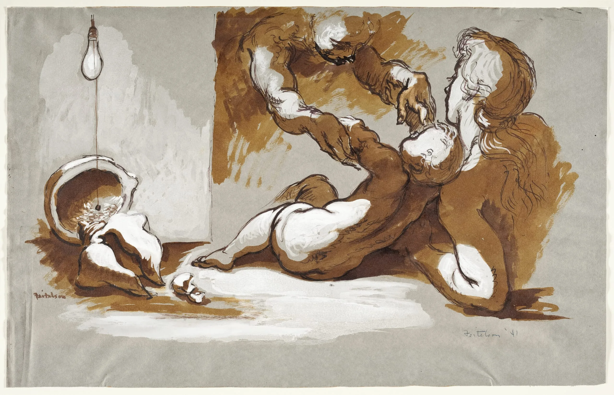 - Pen and ink, brown wash and Chinese white on toned paper