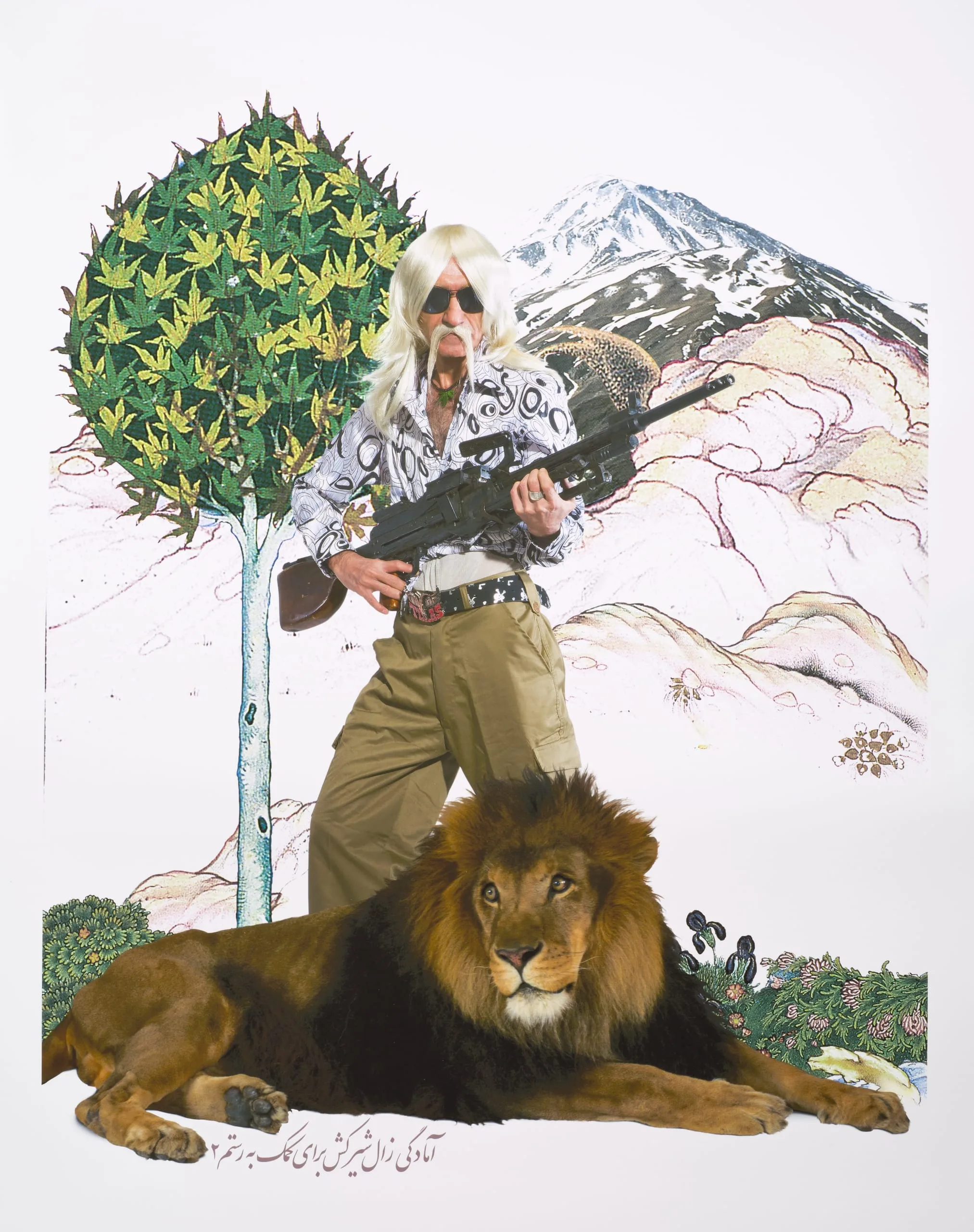 Zal poses rifle in hand to join forces with Rostam 2, with a reclining lion in a traditional Persian landscape.